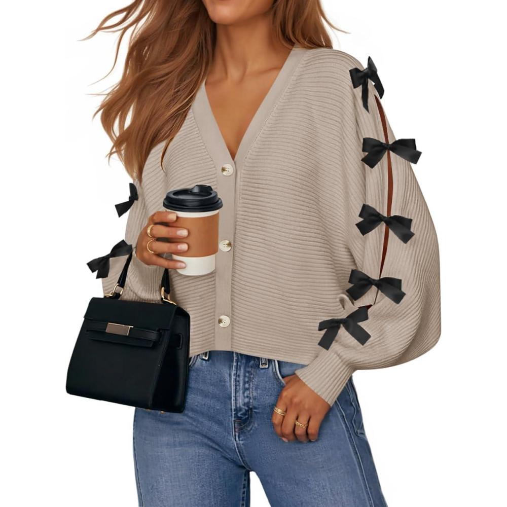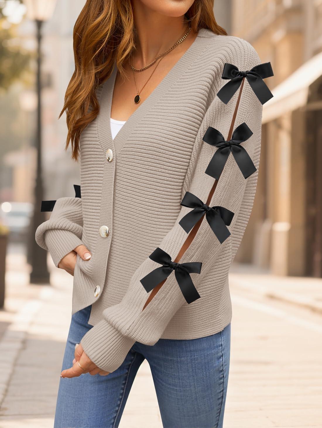 ZESICA Fall Bow Cardigans for Women Trendy 2025 Casual Long Sleeve Button V Neck Knit Sweater Outerwear Coats(Sand)