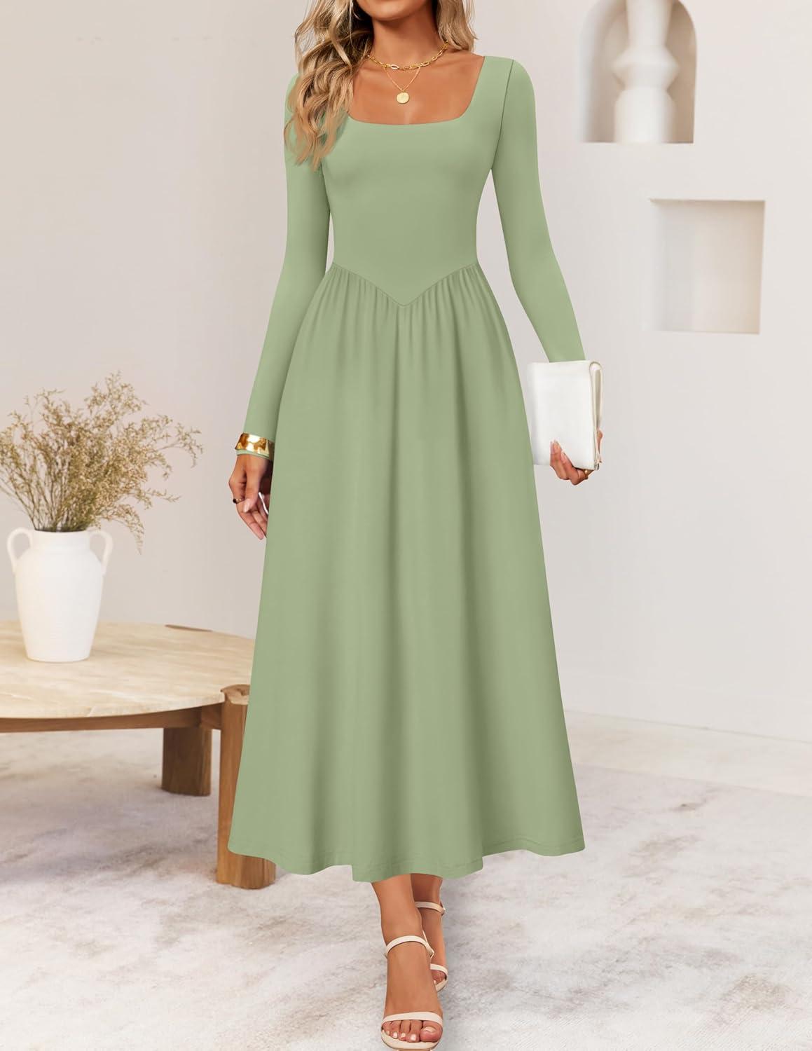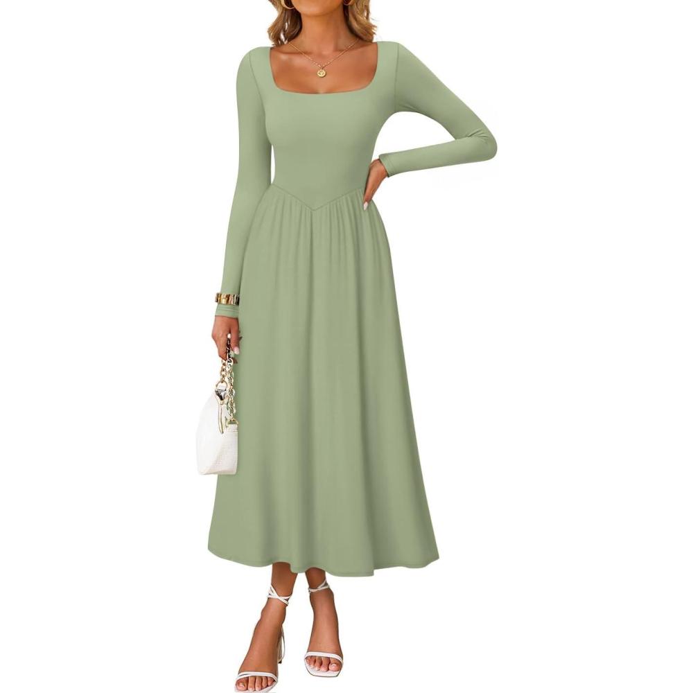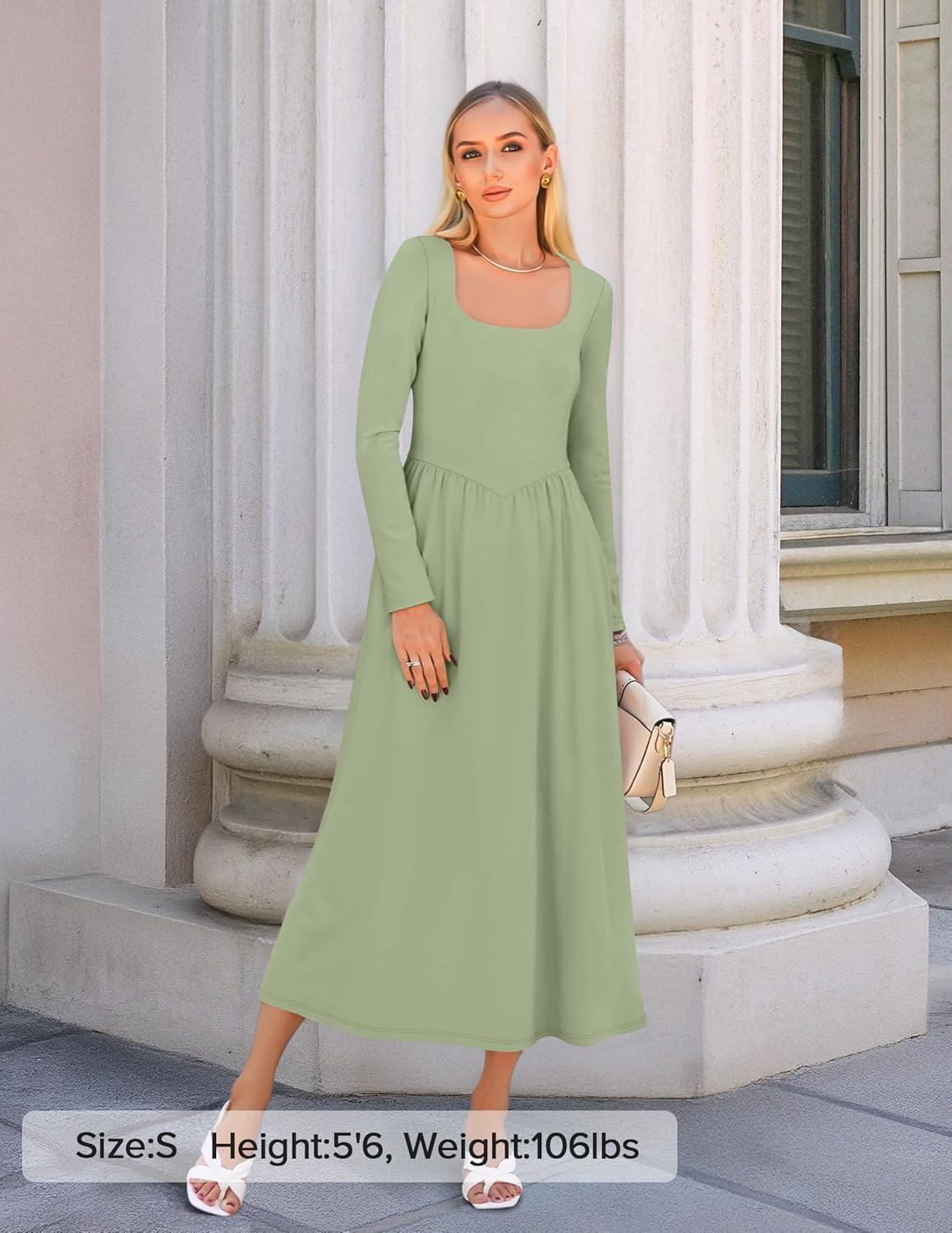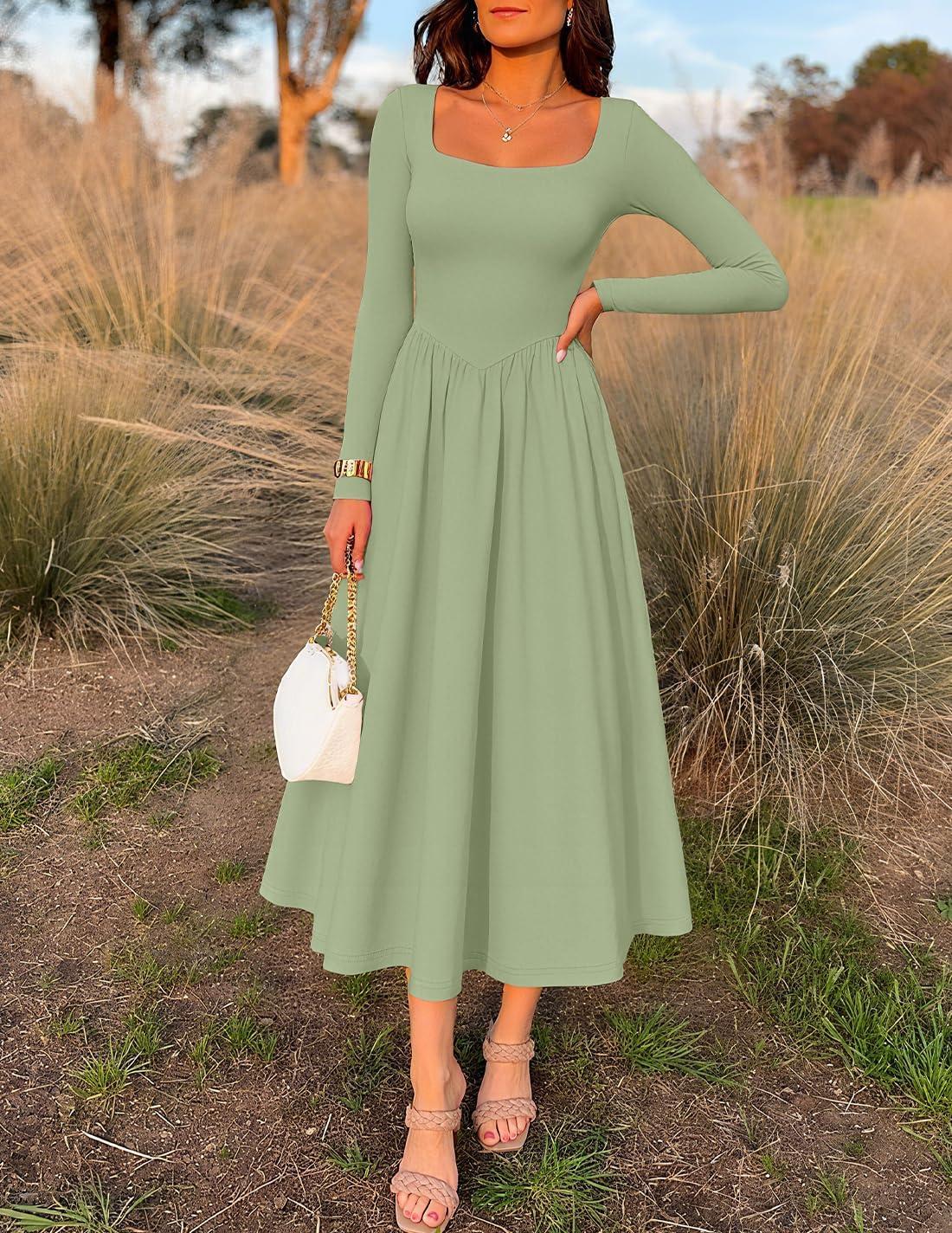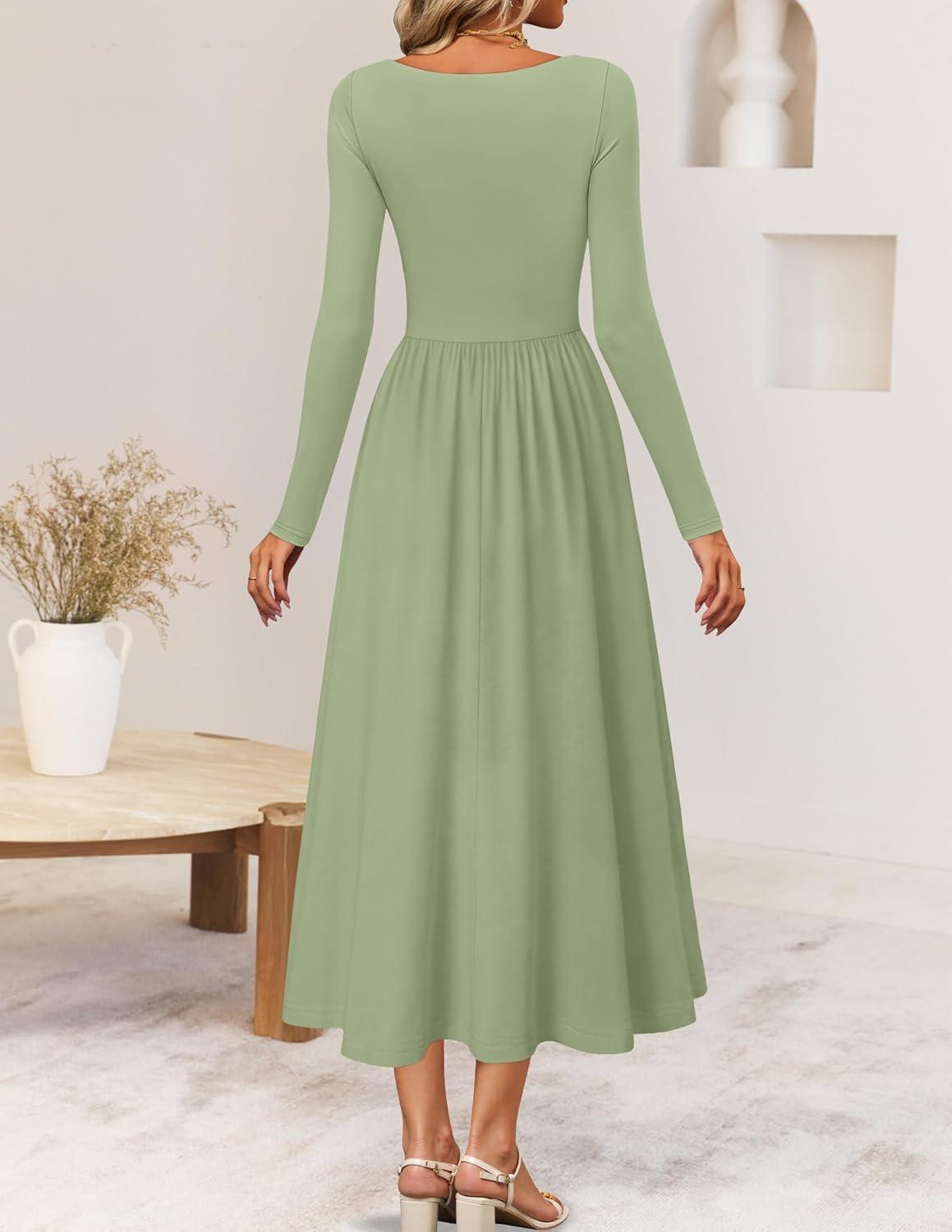 ZESICA Fall Dresses for Women 2025 Elegant Classy Square Neck Long Sleeve Flowy Wedding Guest Party Midi Dress(Light Green)