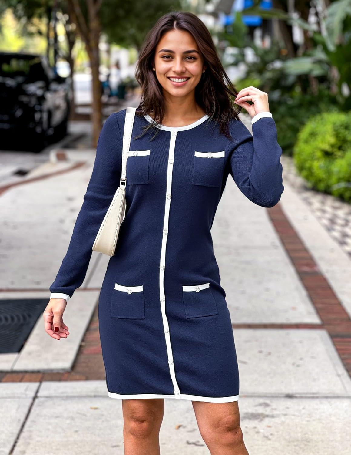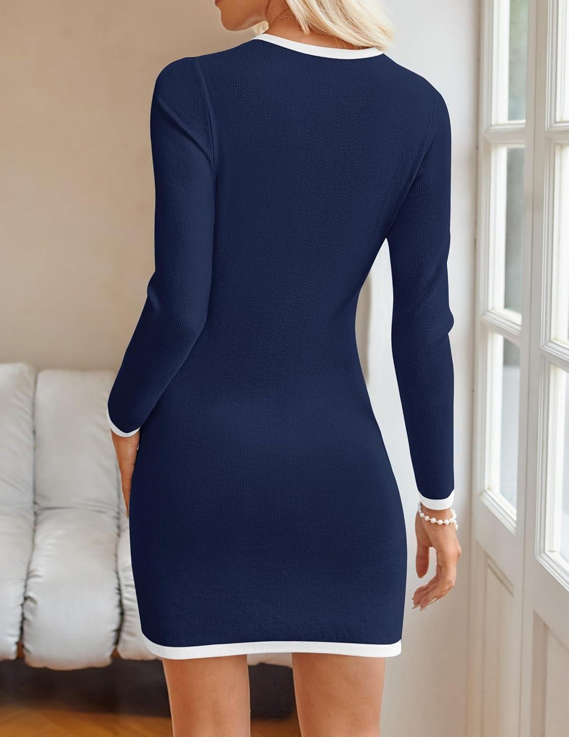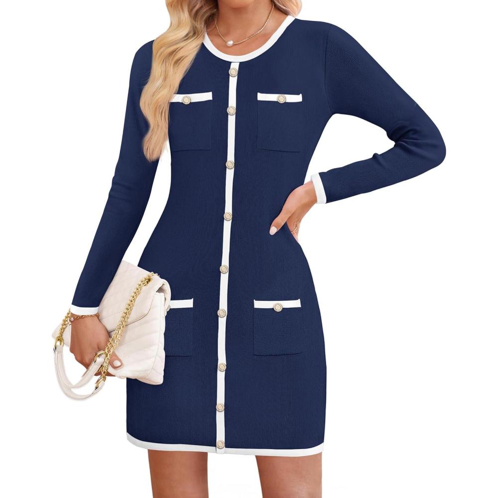 Get the ZESICA Fall Dresses for Women 2025 Long Sleeve Button Color Block Knit Bodycon Short Sweater Dresses with Pockets(Navy) you want at a price you can afford with our markdown sale.