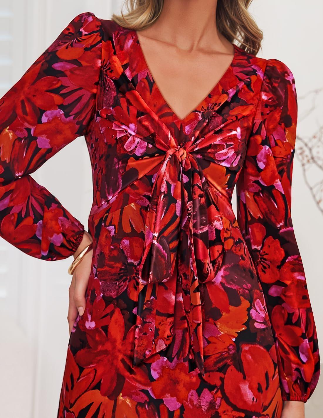 ZESICA Fall Floral Dresses for Women 2025 Elegant Long Sleeve V Neck Mesh Cocktail Wedding Party Maxi Dress(Red)