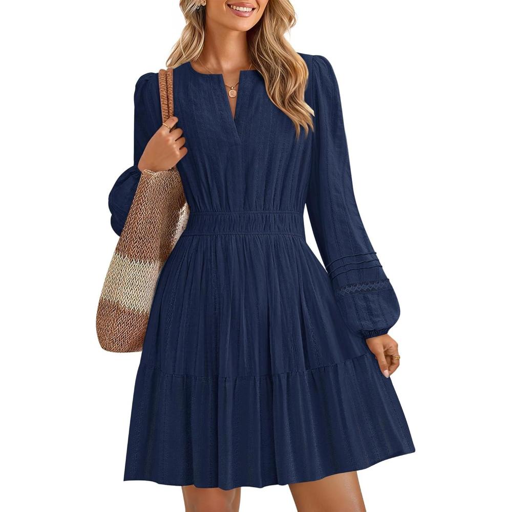 imageZESICA Fall Long Sleeve Mini Dresses for Women 2025 Lightweight V Neck High Waist A Line Flowy Swing Casual Party DressNavy