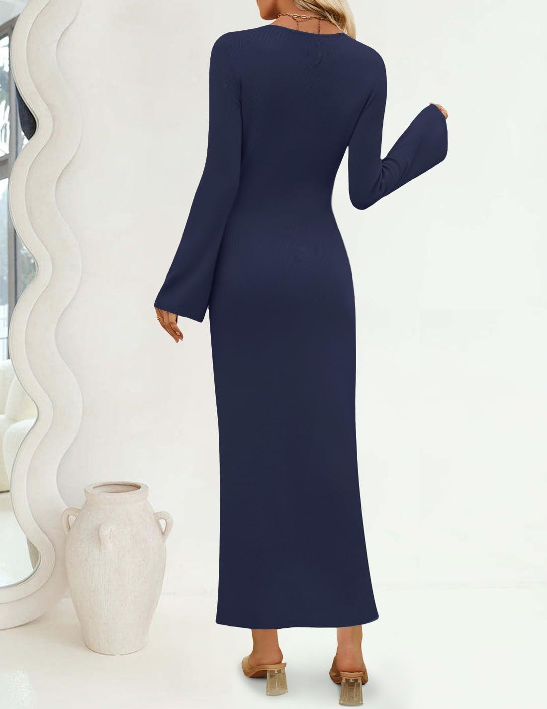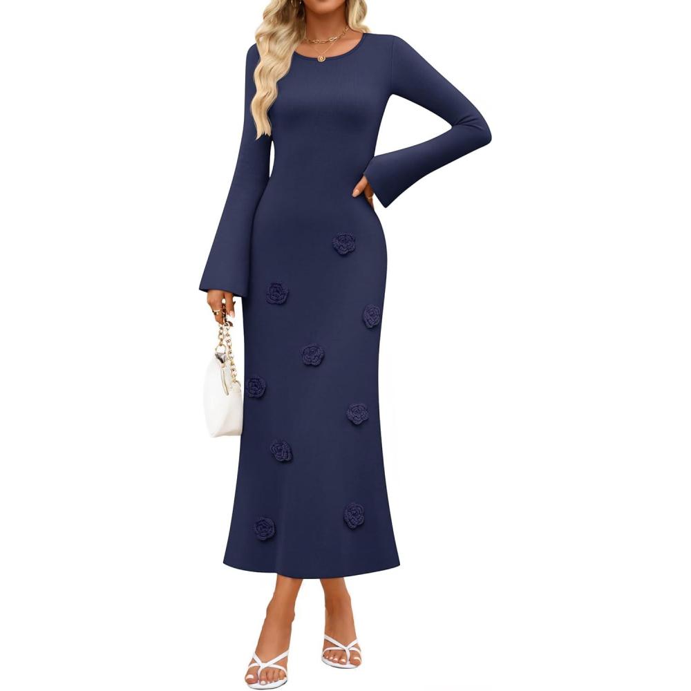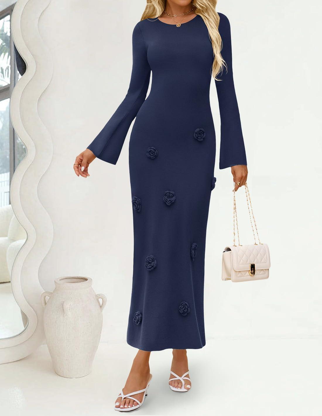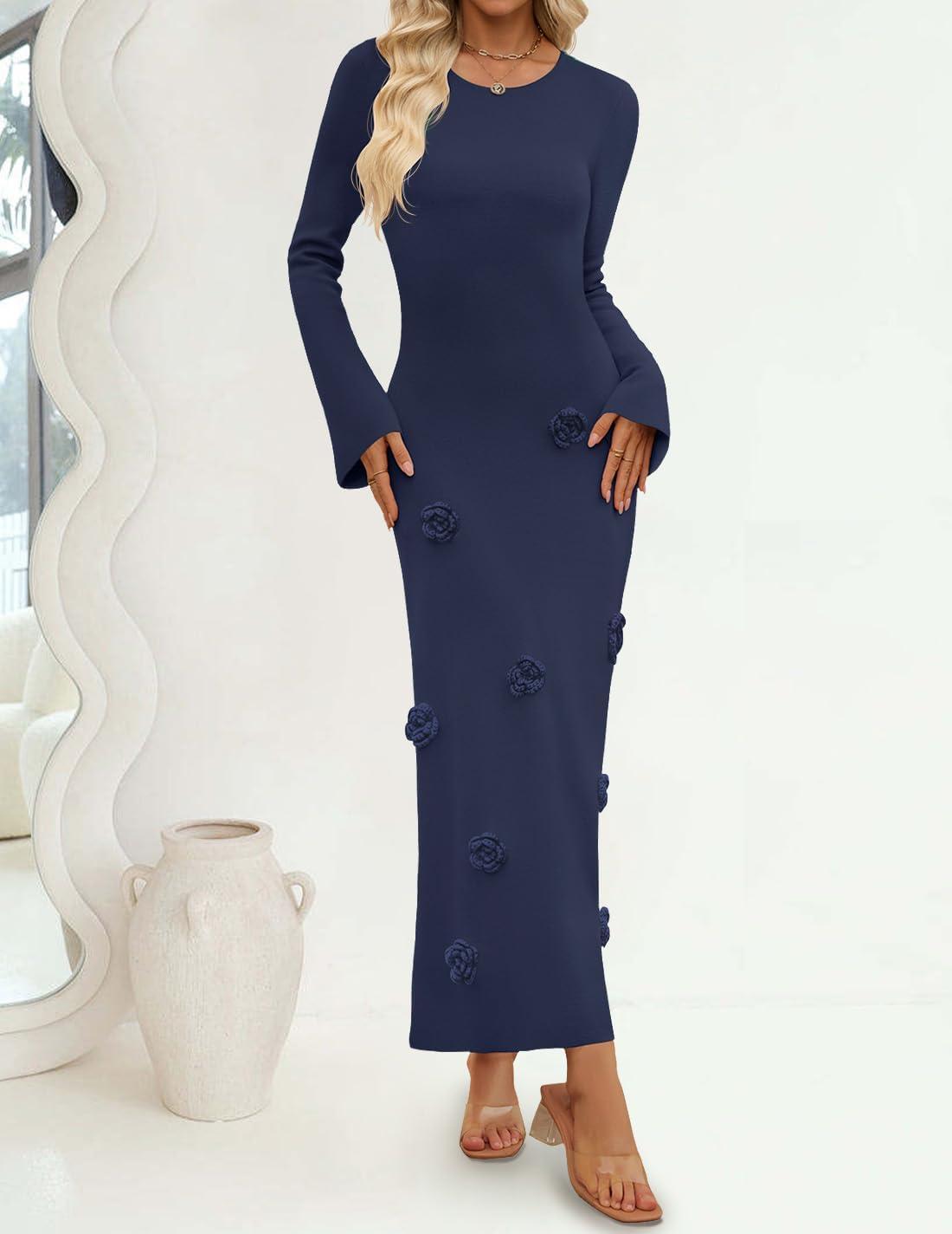 ZESICA Fall Party Maxi Dresses for Women 2025 Trendy Long Sleeve Lightweight Sweater Dress with 3D Floral Appliqués(Navy)