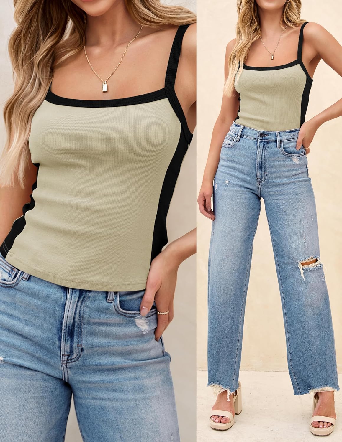 ZESICA Sleeveless Tops for Women Summer Spaghetti Straps Crop Tank Top Ribbed Knit T Shirts Slim Fit Camisole 2024 Fashion(Sand)