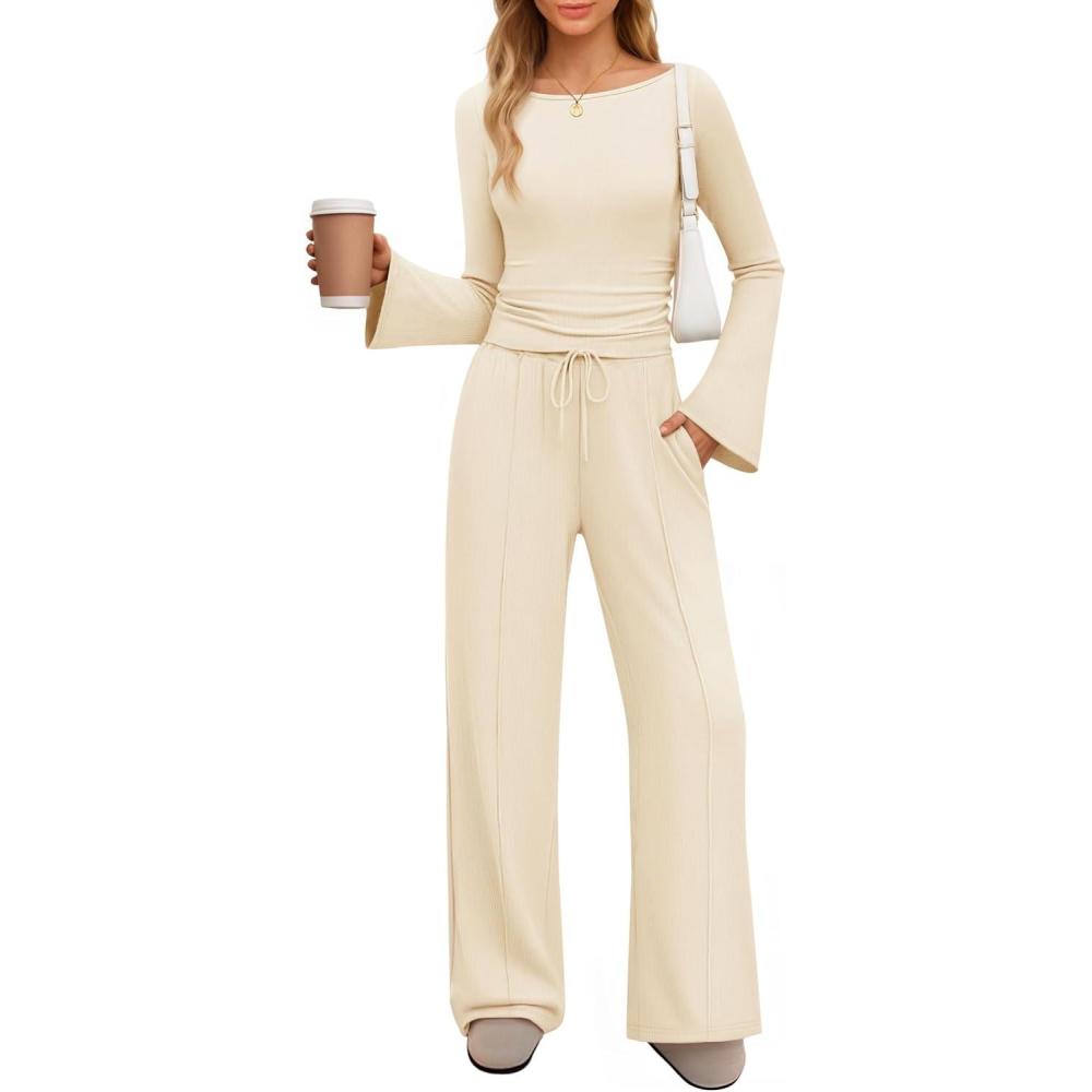ZESICA Women’s 2 Piece Lounge Sets Fall 2026 Casual Long Sleeve Boat Neck Ribbed Tops Wide Leg Pants Outfits with Pocket(Apricot)