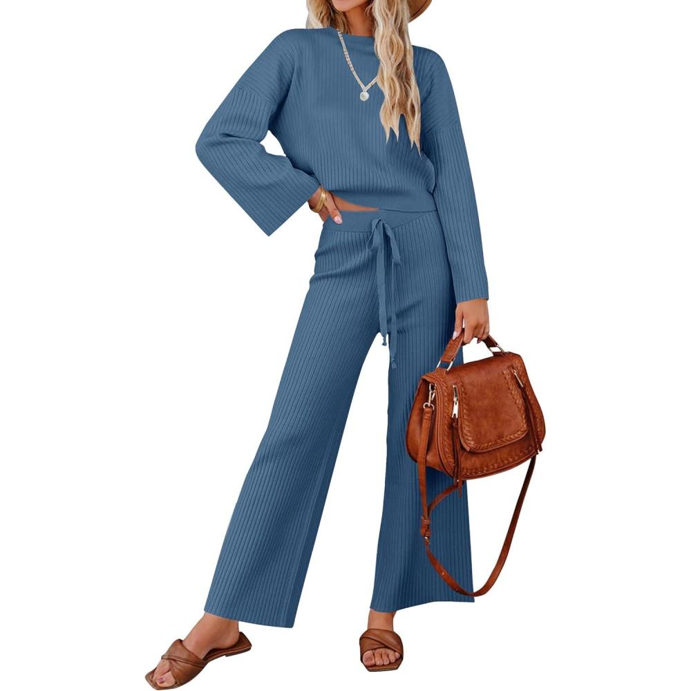ZESICA Women’s 2 Piece Outfits Set 2026 Casual Long Sleeve Knit Pullover Top and Wide Leg Pants Sweatsuit Lounge Sets(Darkblue)