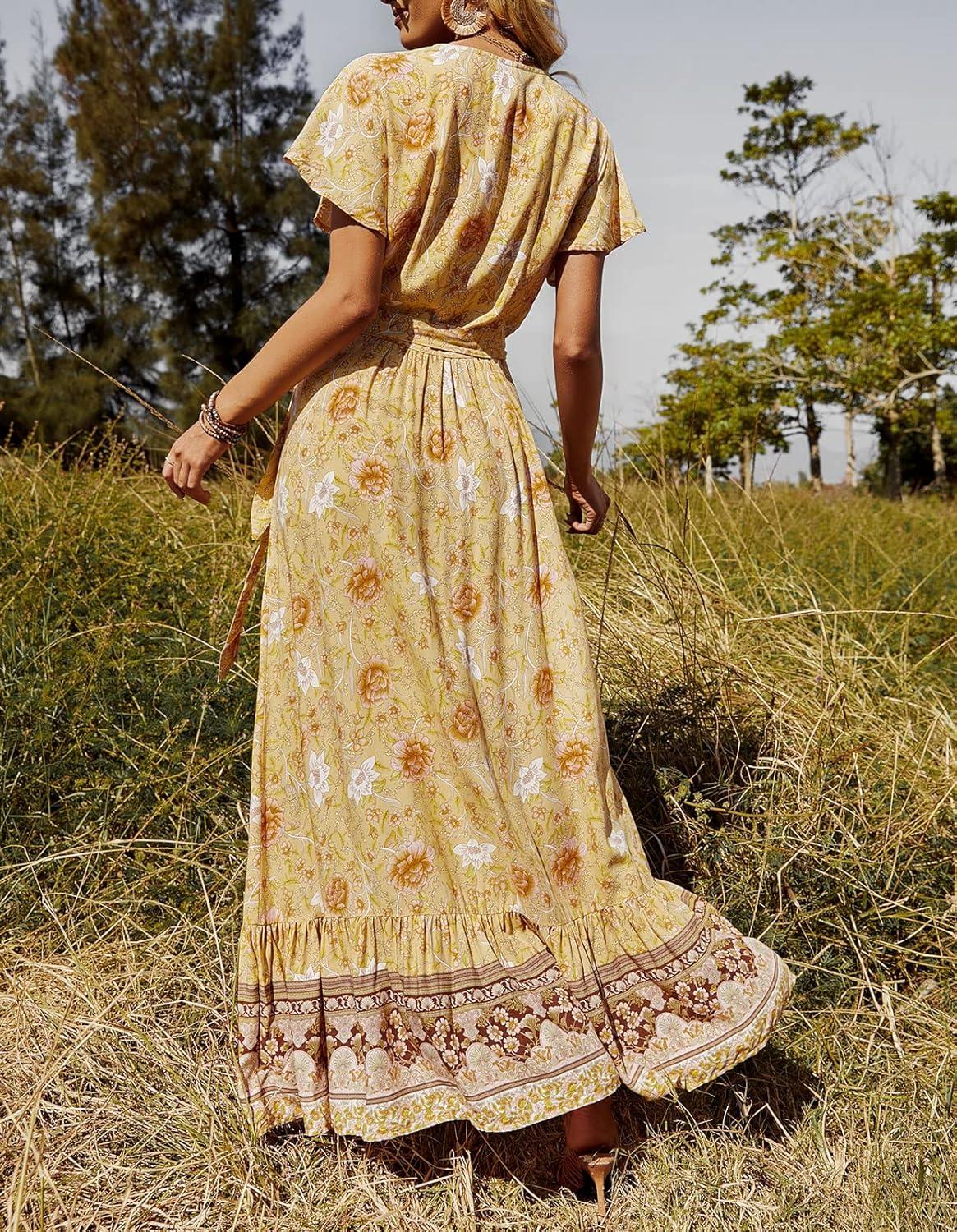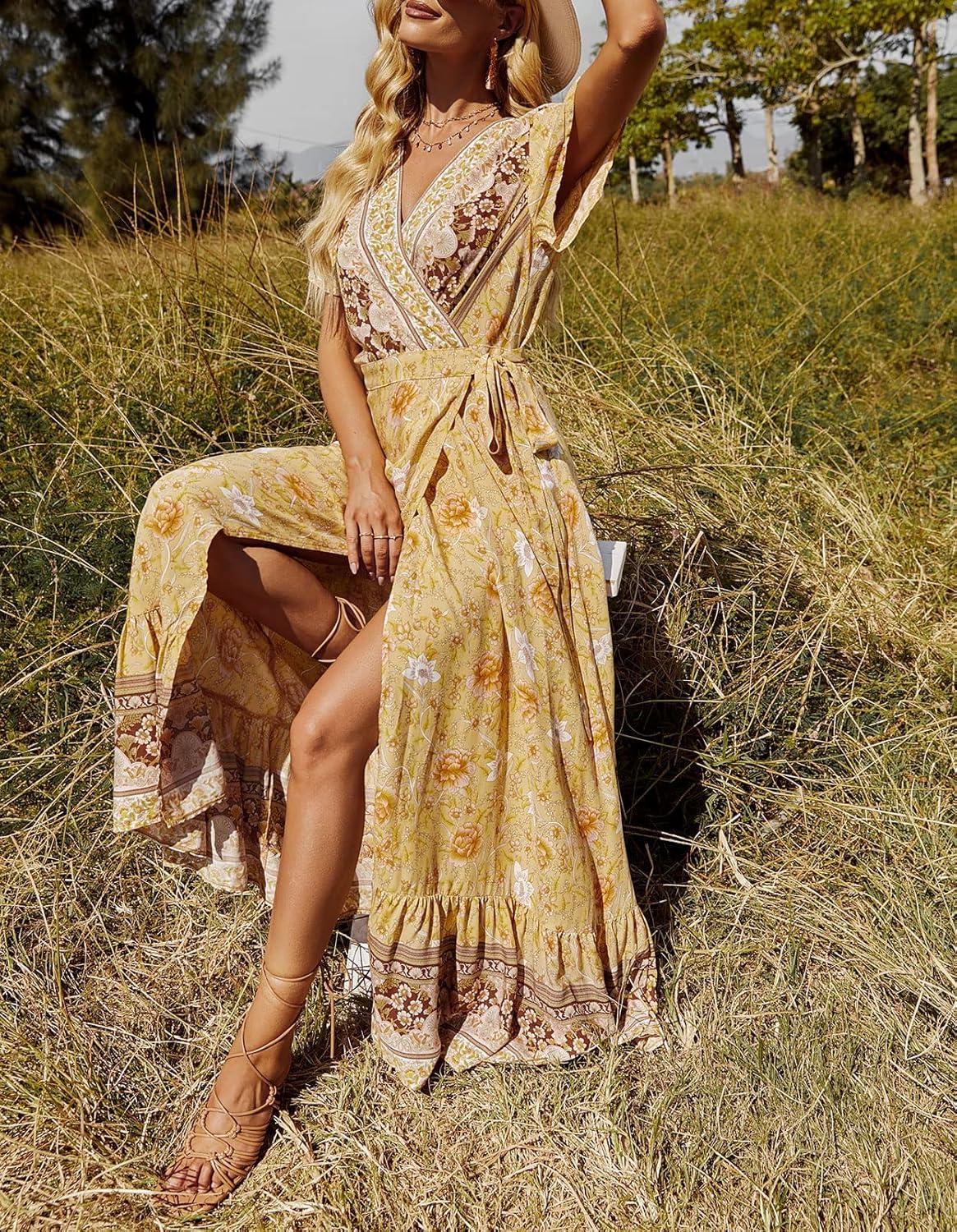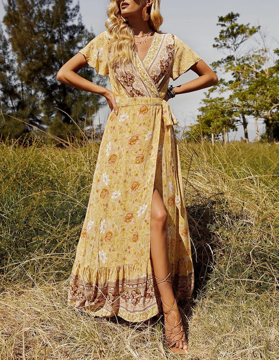 ZESICA Women’s 2024 Bohemian Floral Printed Wrap V Neck Short Sleeve Split Beach Party Maxi Dress(Yellow)