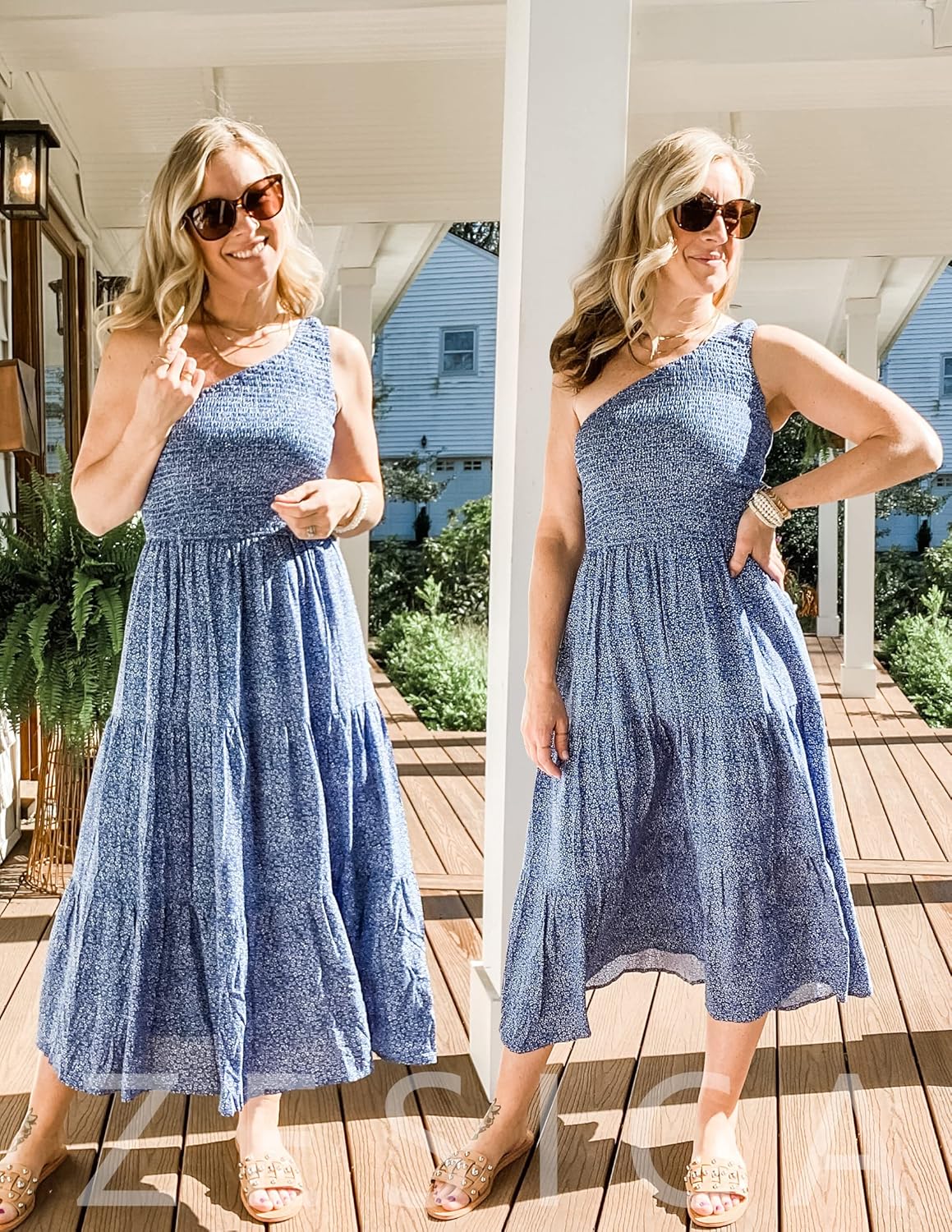 imageZESICA Womens 2024 Bohemian Summer Floral Print One Shoulder Sleeveless Smocked Ruffle Tiered Beach Long Midi DressDustyblue