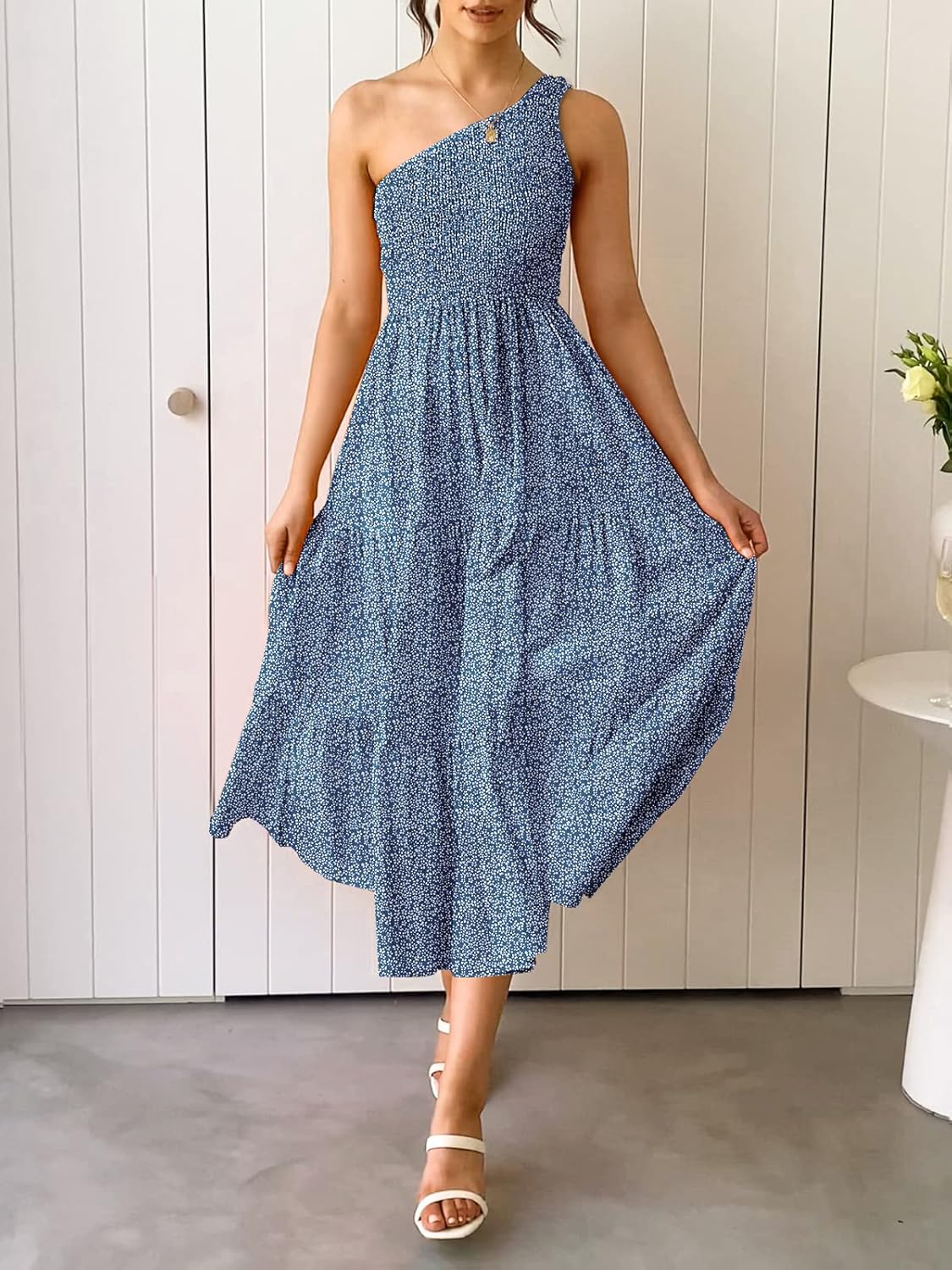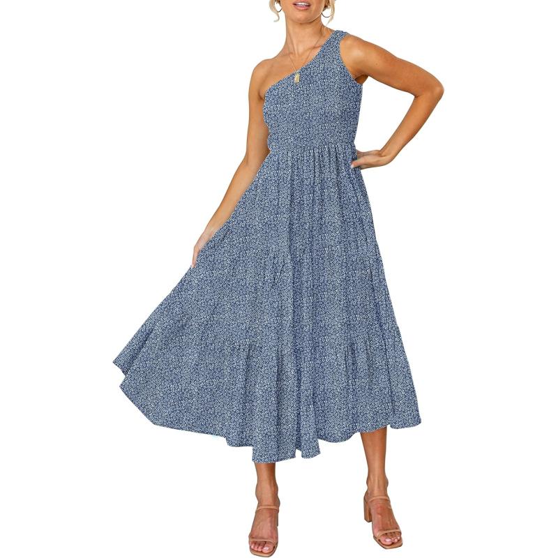 ZESICA Women’s 2024 Bohemian Summer Floral Print One Shoulder Sleeveless Smocked Ruffle Tiered Beach Long Midi Dress(Dustyblue)