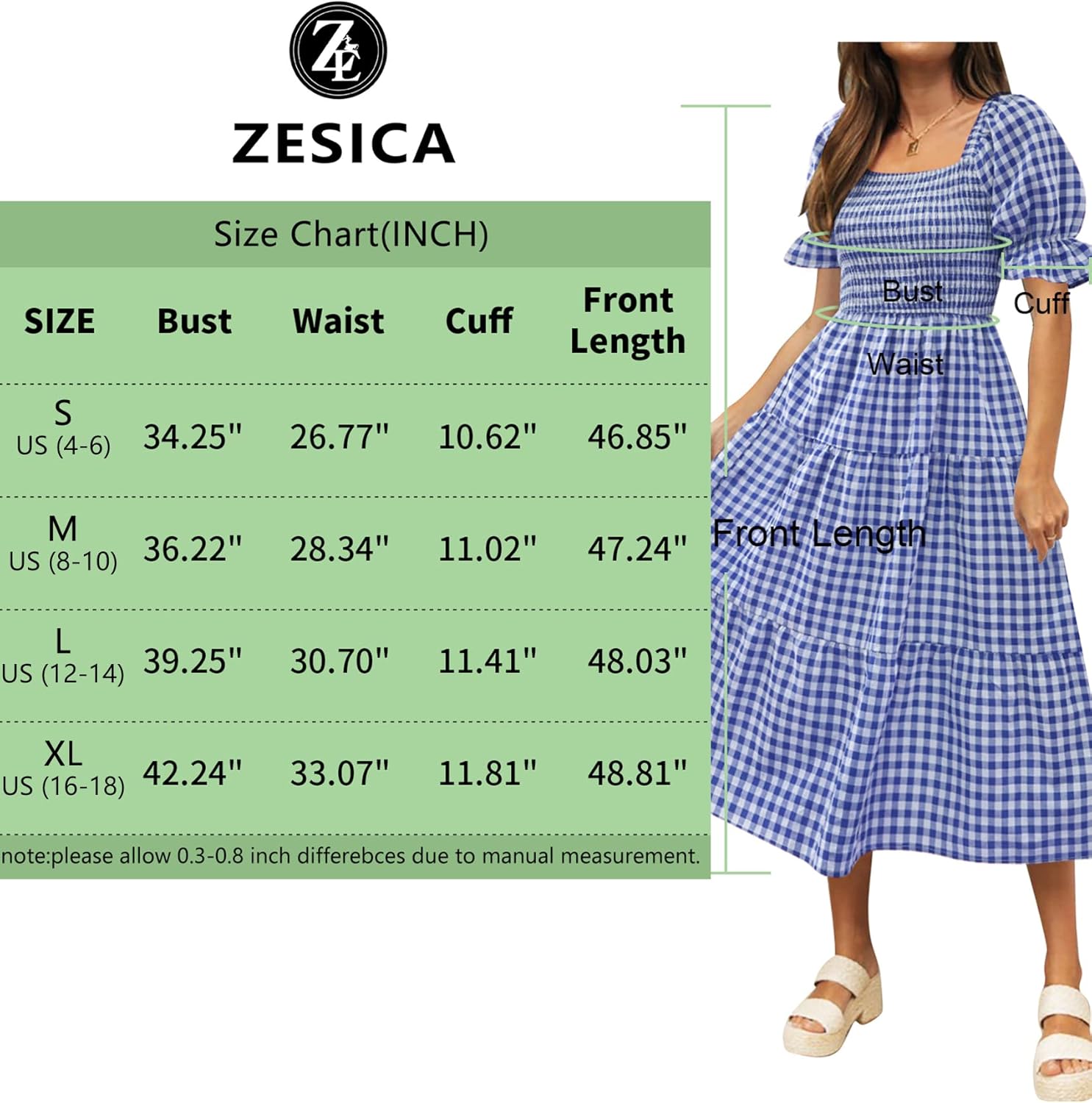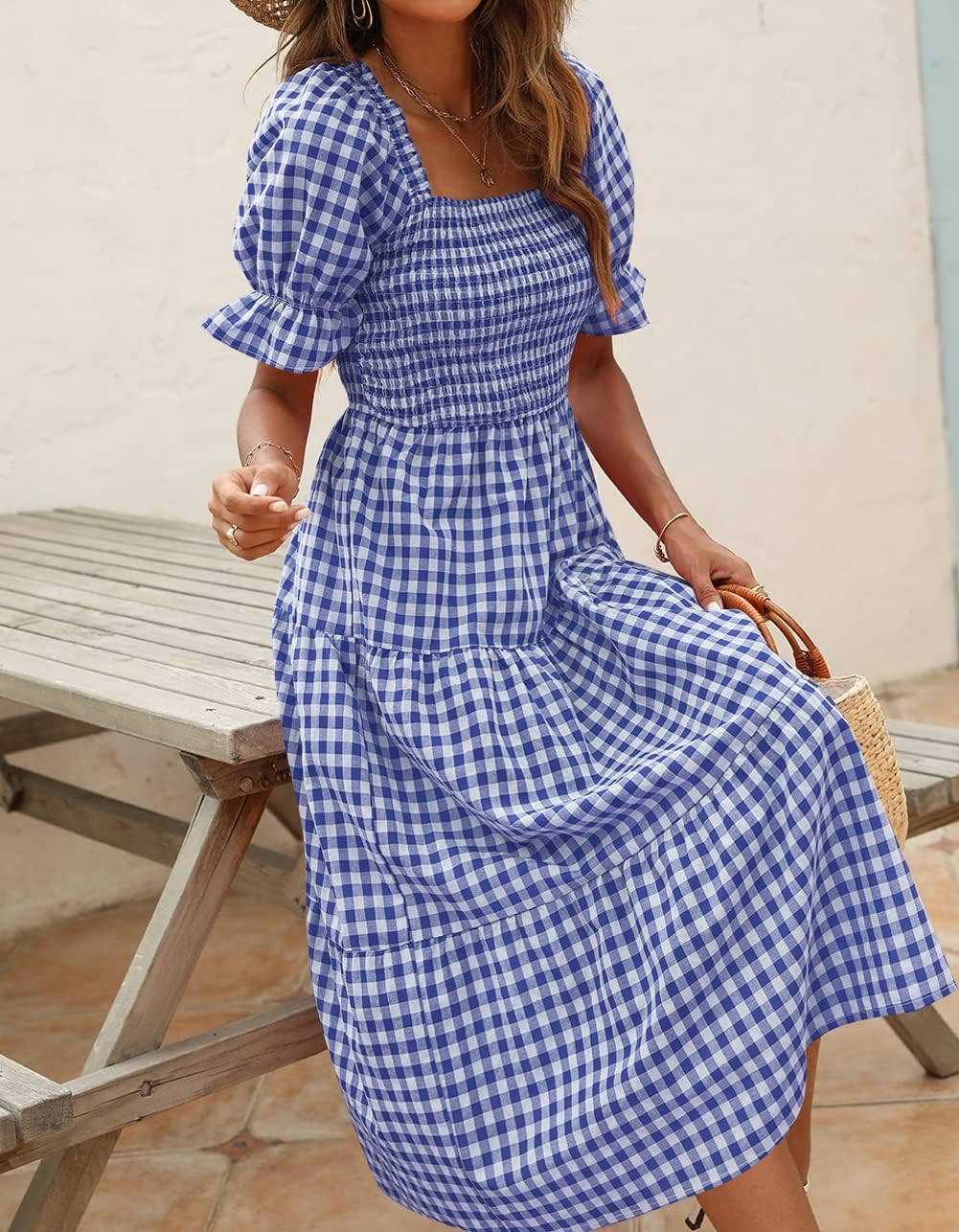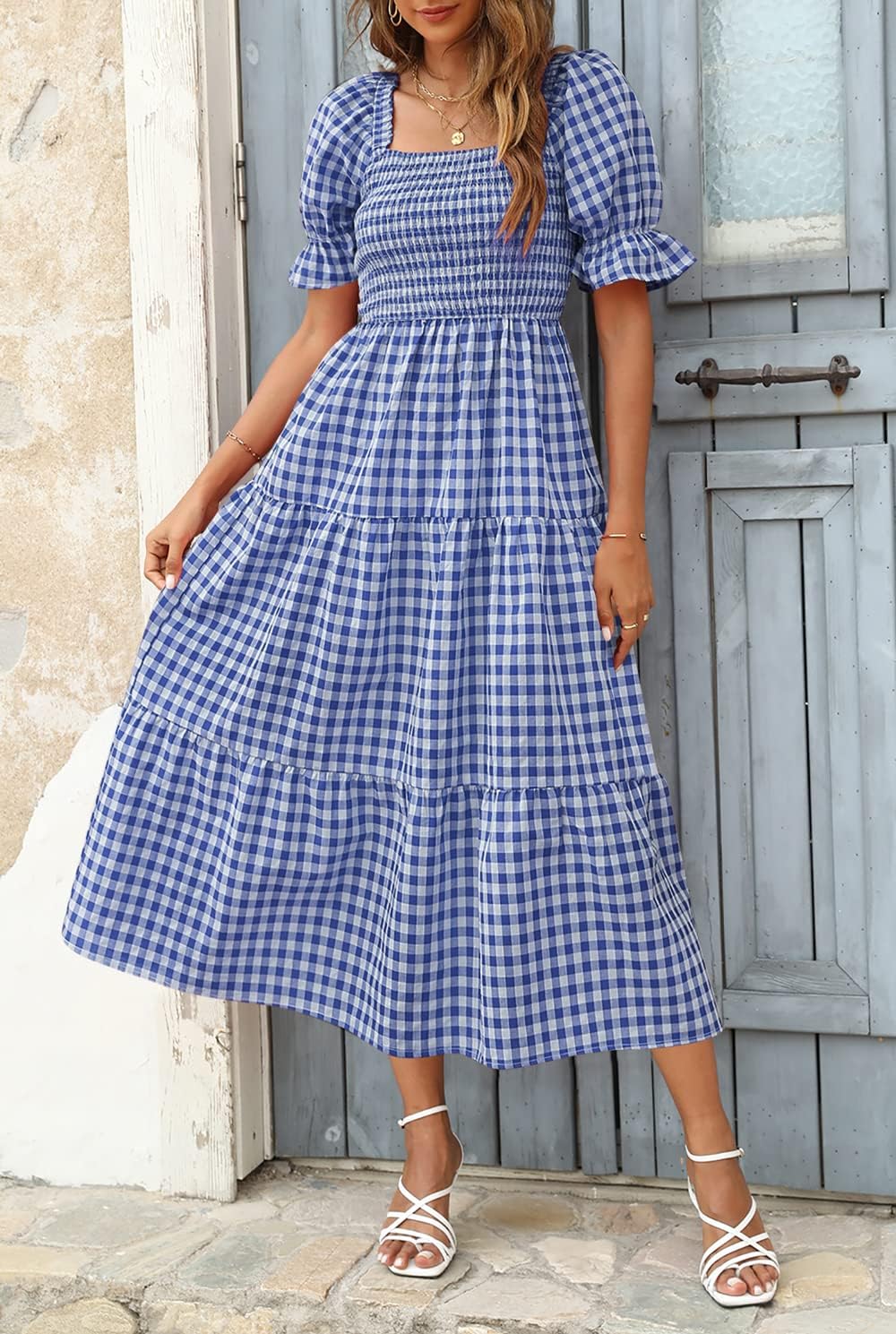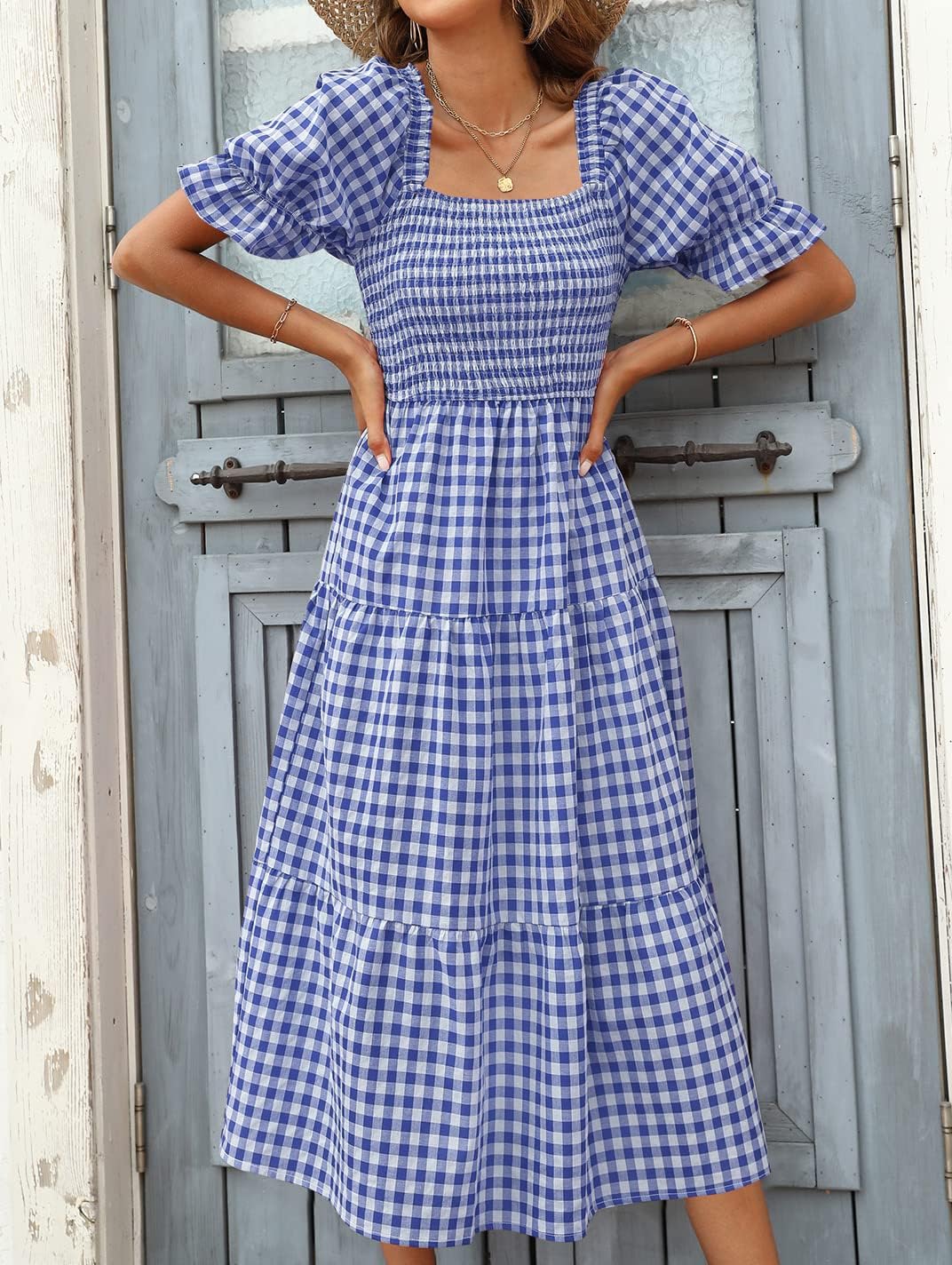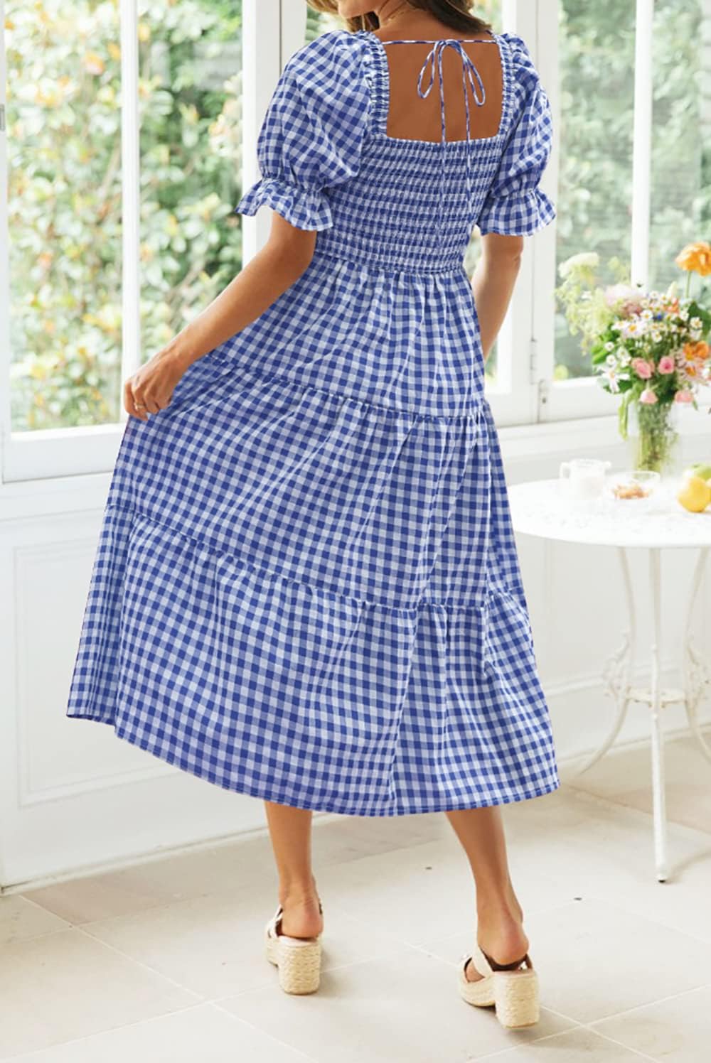 ZESICA Womens 2024 Bohemian Summer Plaid Square Neck Puff Sleeve Ruffle Flowy Beach Midi DressRoyalblue