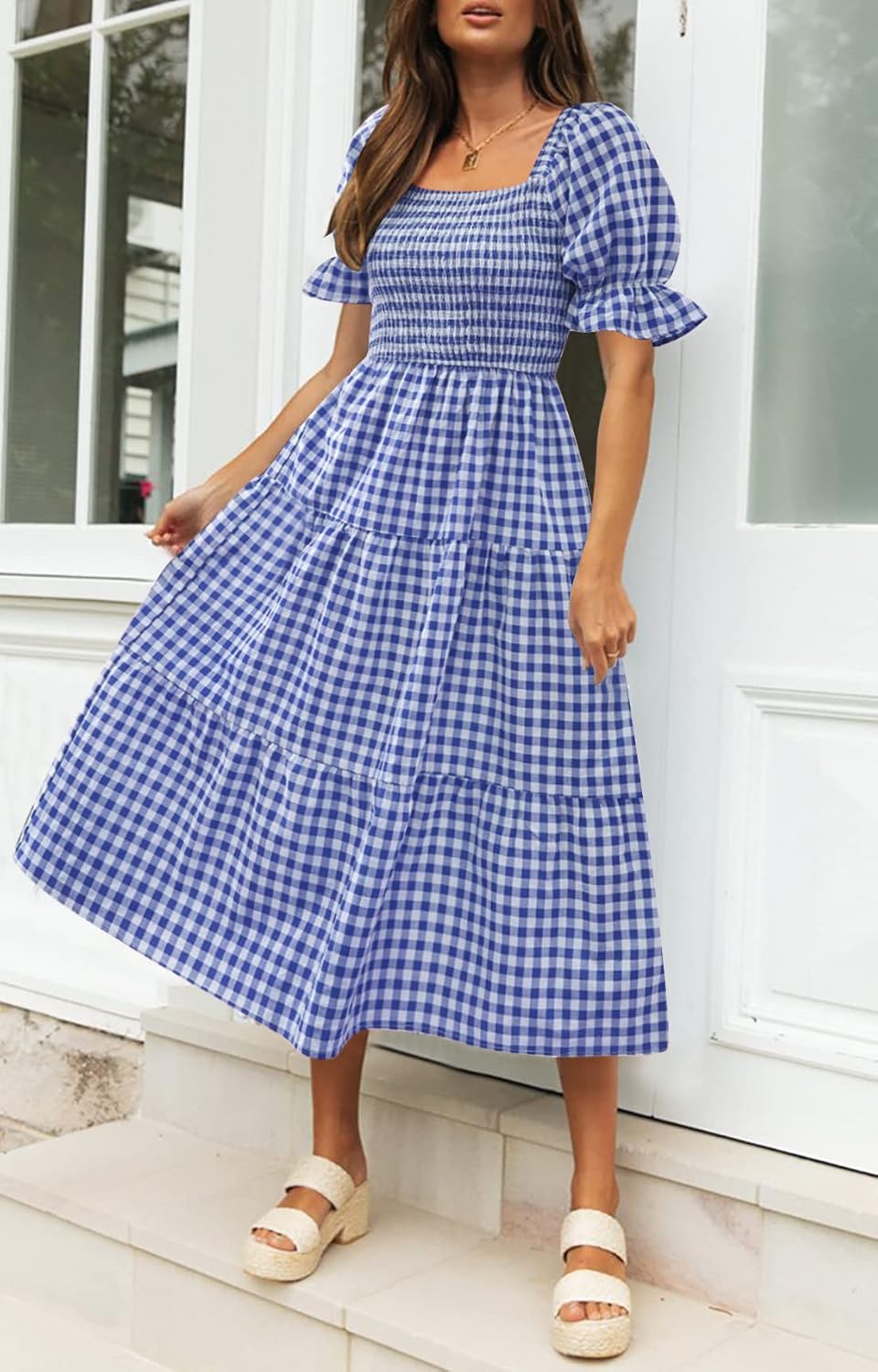 ZESICA Women’s 2024 Bohemian Summer Plaid Square Neck Puff Sleeve Ruffle Flowy Beach Midi Dress(Royalblue)