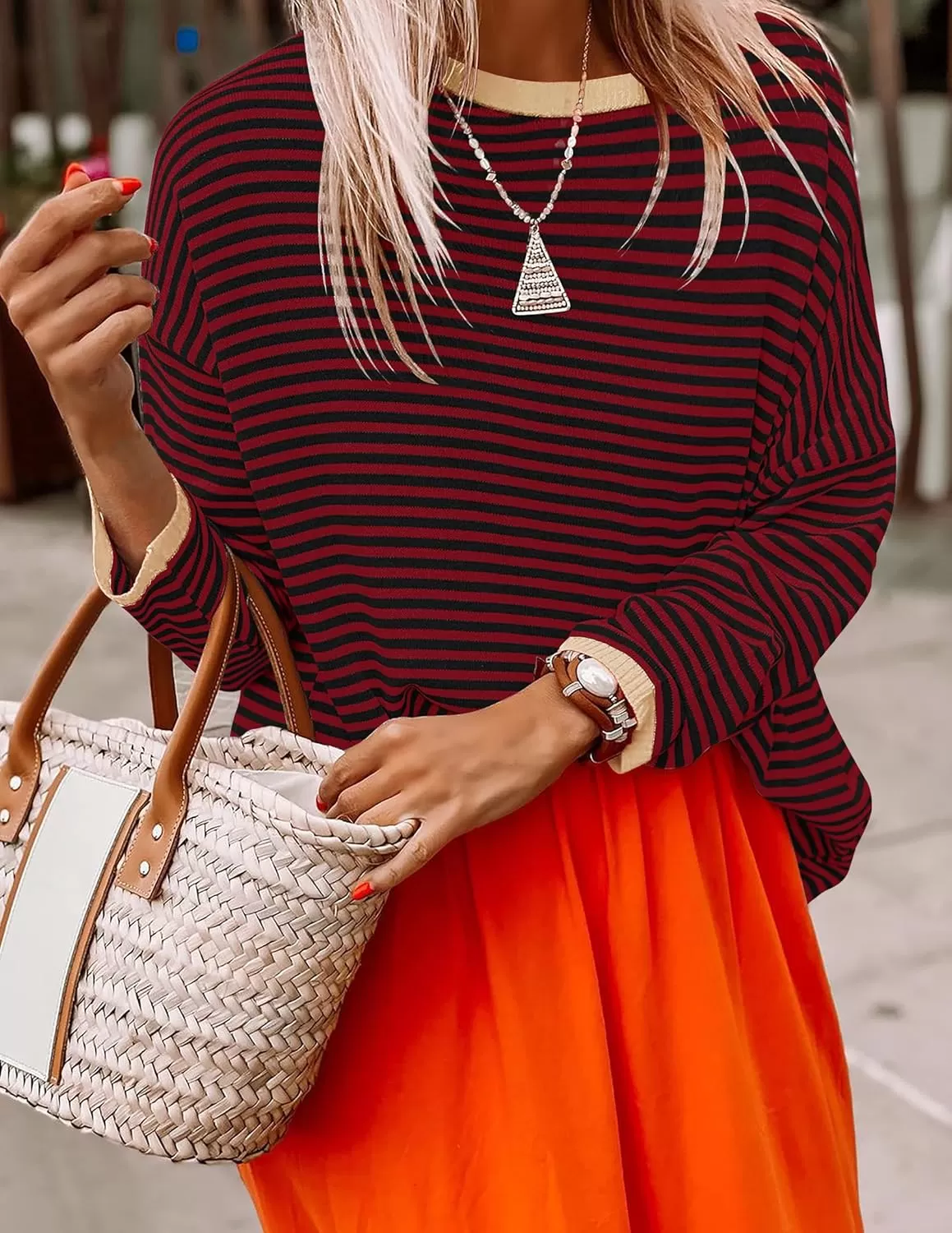 imageZESICA Womens 2024 Fall Striped Sweaters Long Sleeve Crew Neck Shirts Color Block Lightweight Pullover TopsWineblack