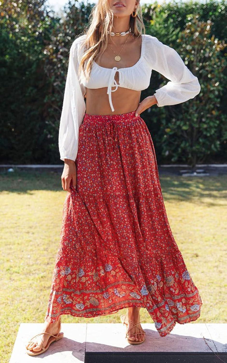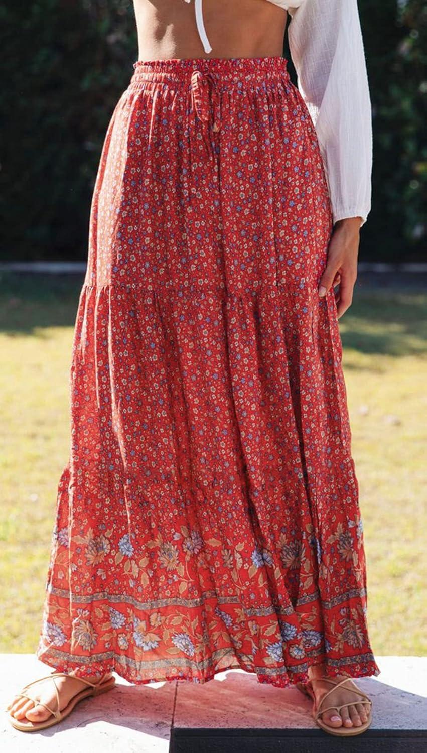 ZESICA Women’s 2024 Summer Bohemian Floral Printed Elastic Waist A Line Maxi Skirt with Pockets(Red#2)