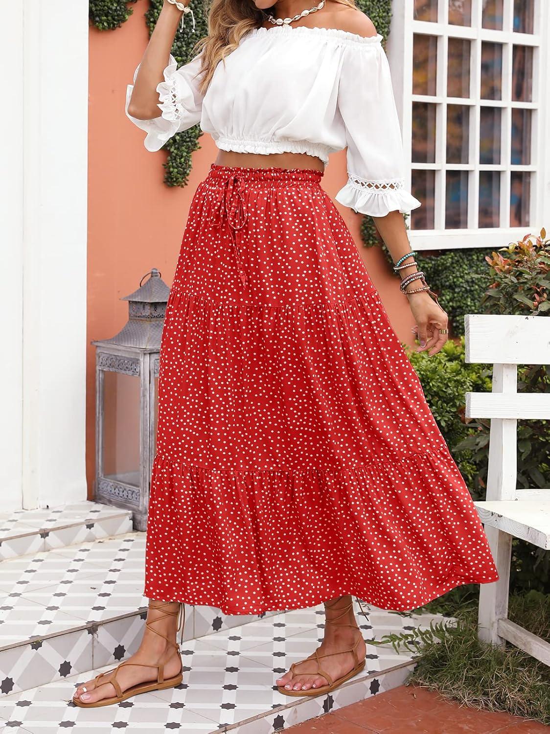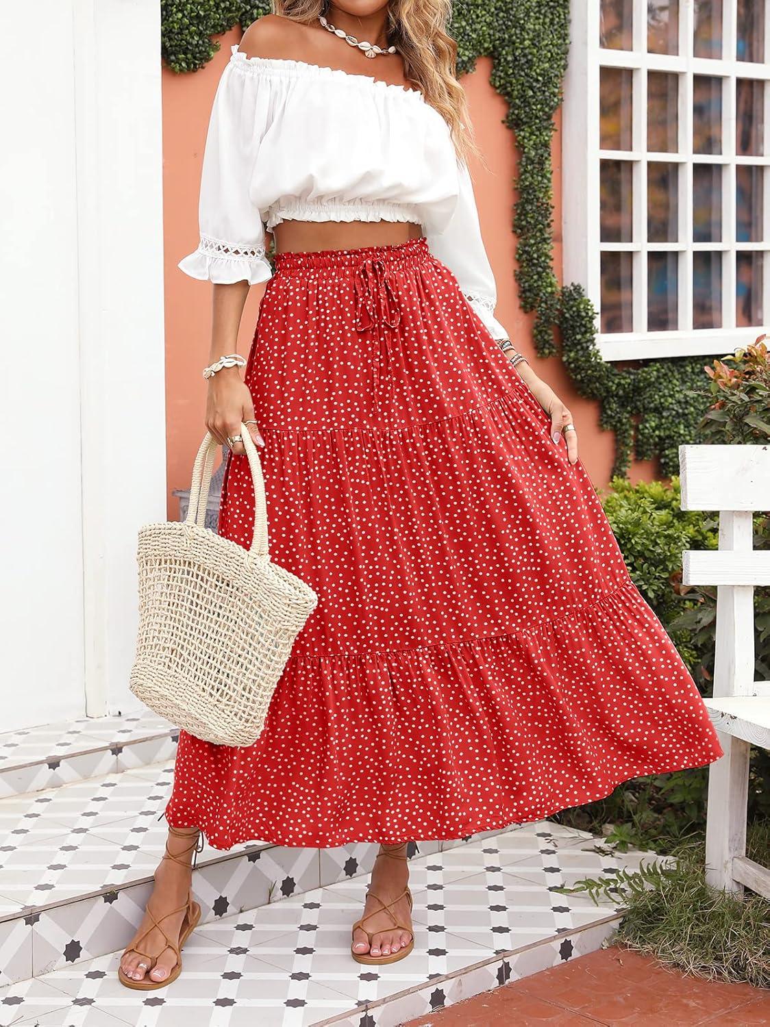 ZESICA Women’s 2024 Summer Bohemian Floral Printed Elastic Waist A Line Maxi Skirt with Pockets(Tomato)