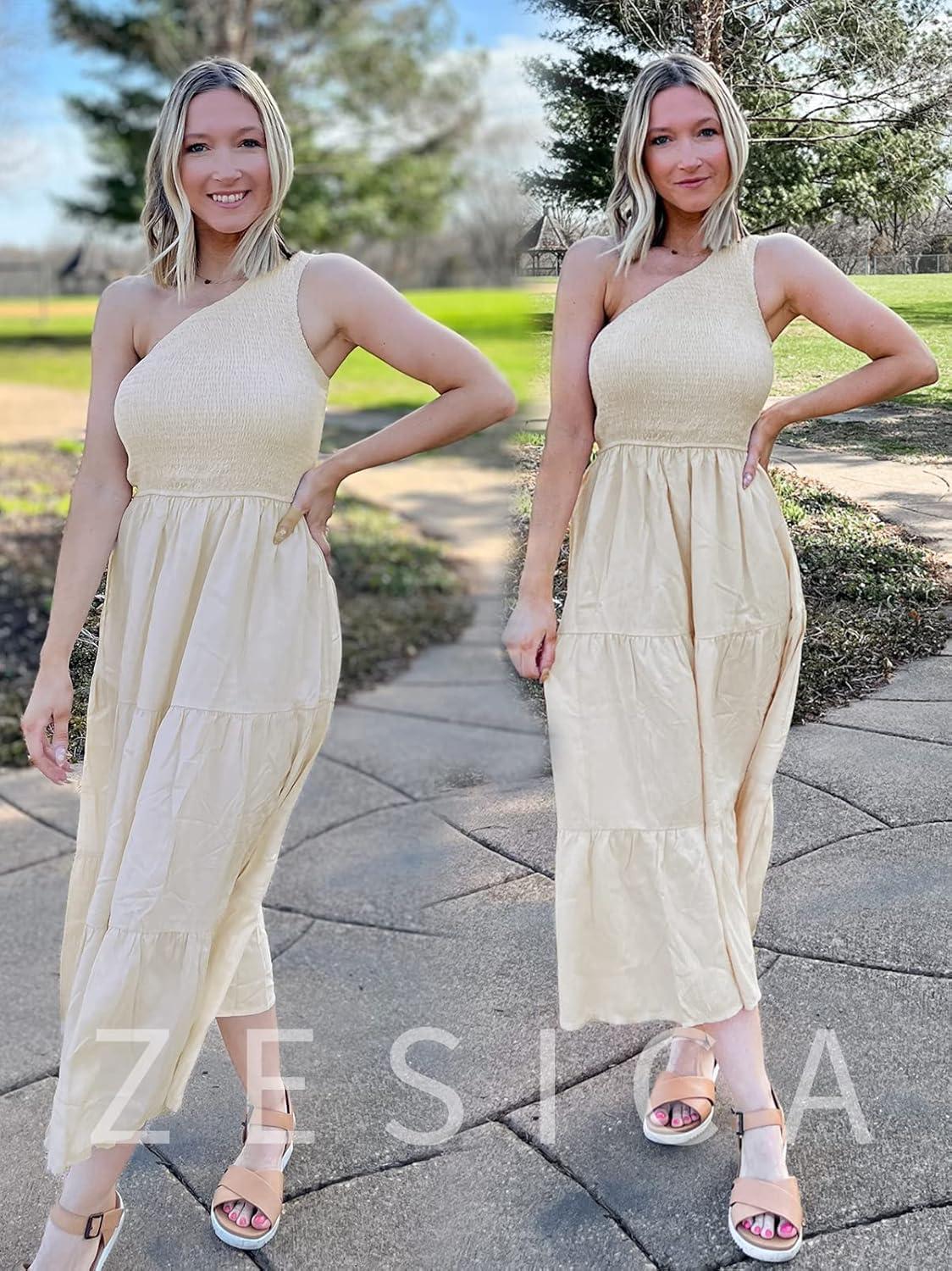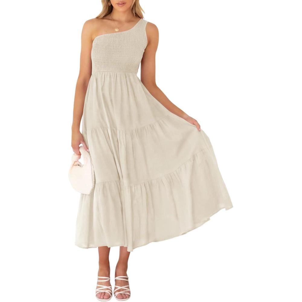 ZESICA Women’s 2025 Bohemian Summer Floral Print One Shoulder Sleeveless Smocked Ruffle Tiered Beach Long Midi Dress(Beige)