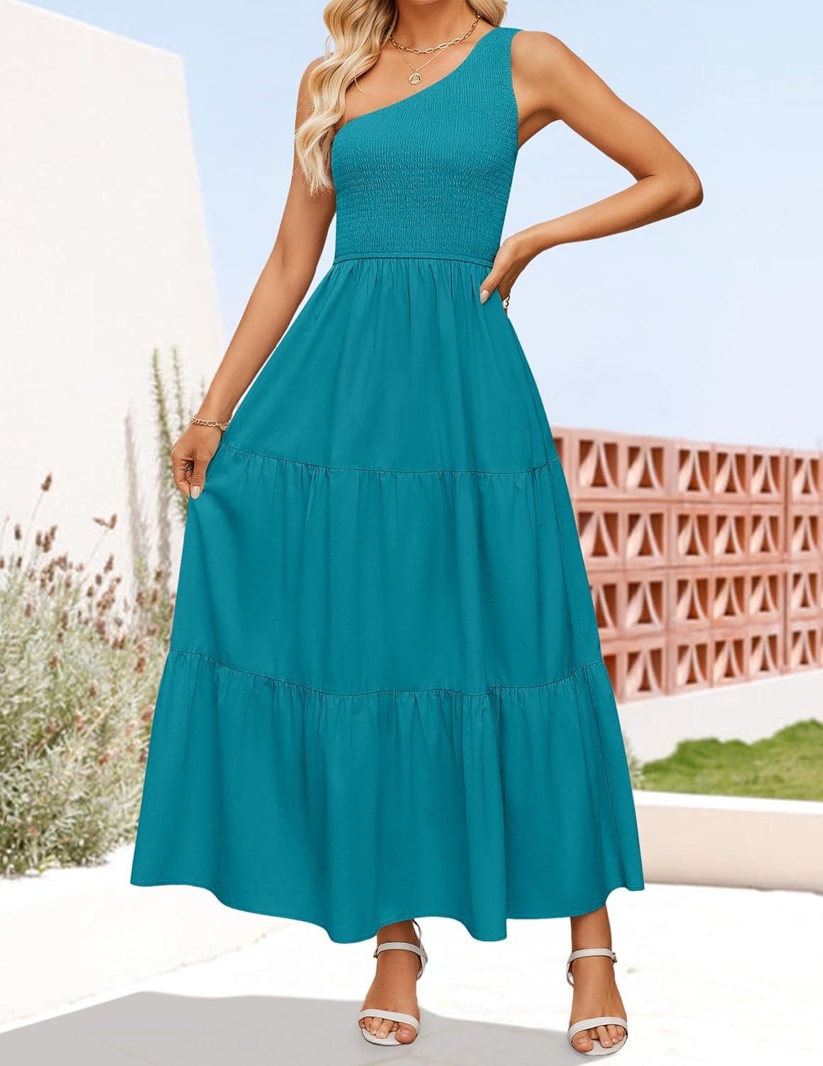 ZESICA Women's 2025 Bohemian Summer Floral Print One Shoulder Sleeveless Smocked Ruffle Tiered Beach Long Midi Dress(Peacock)