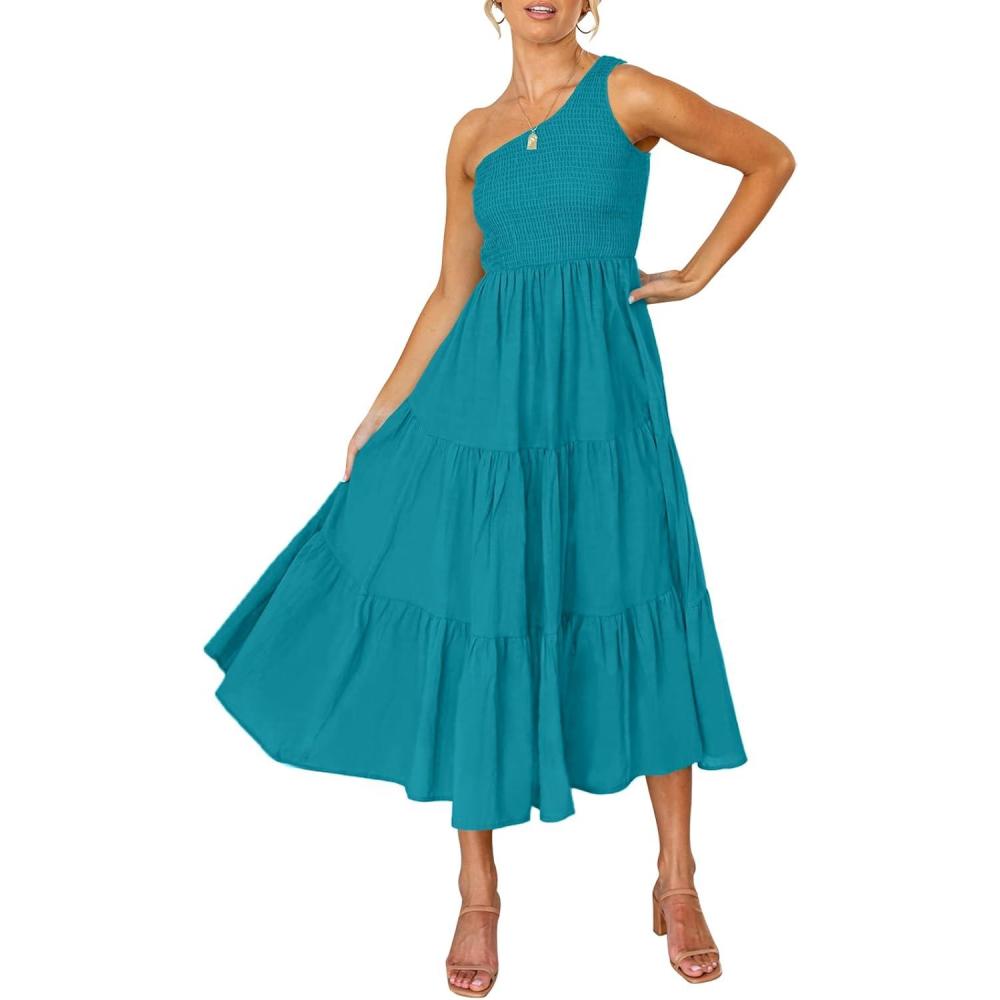 ZESICA Women’s 2025 Bohemian Summer Floral Print One Shoulder Sleeveless Smocked Ruffle Tiered Beach Long Midi Dress(Peacock)