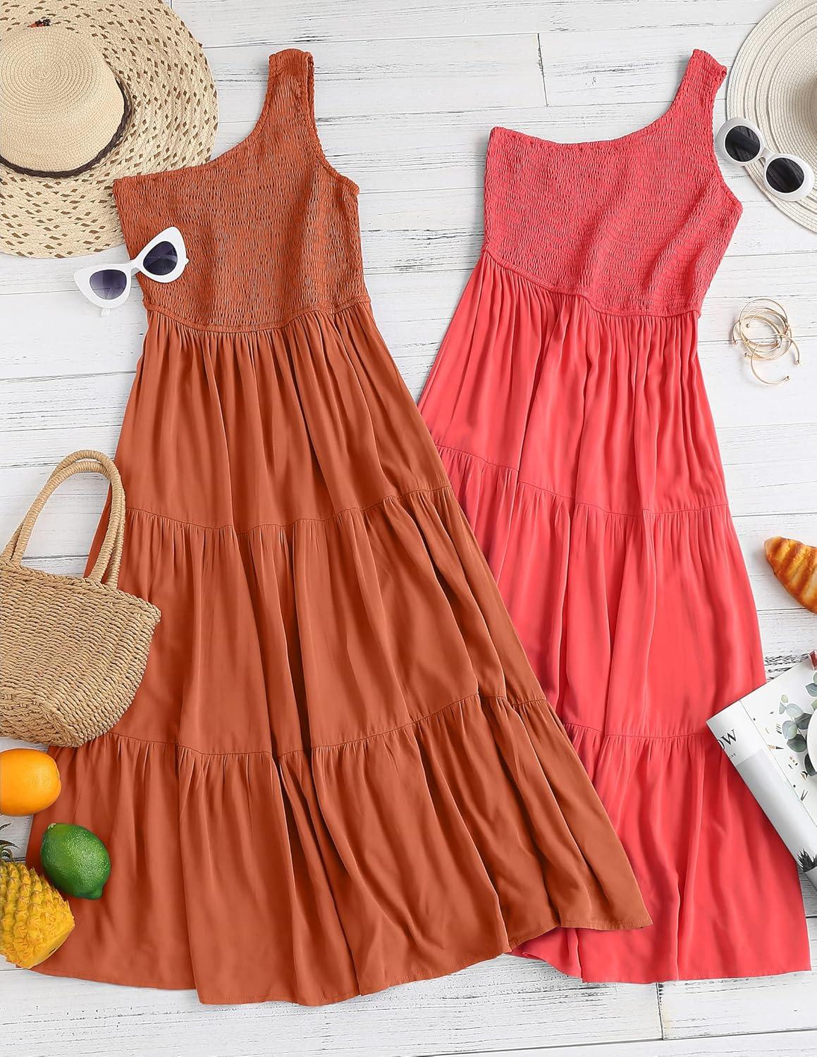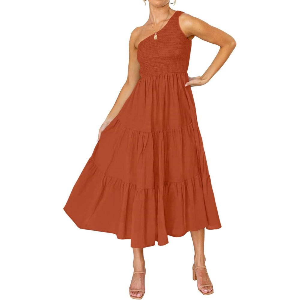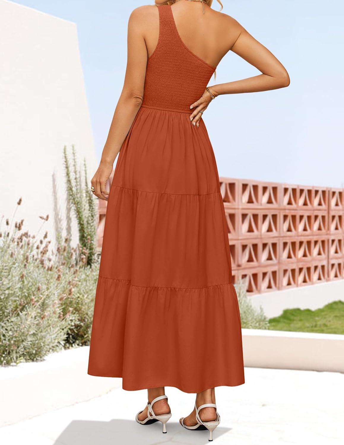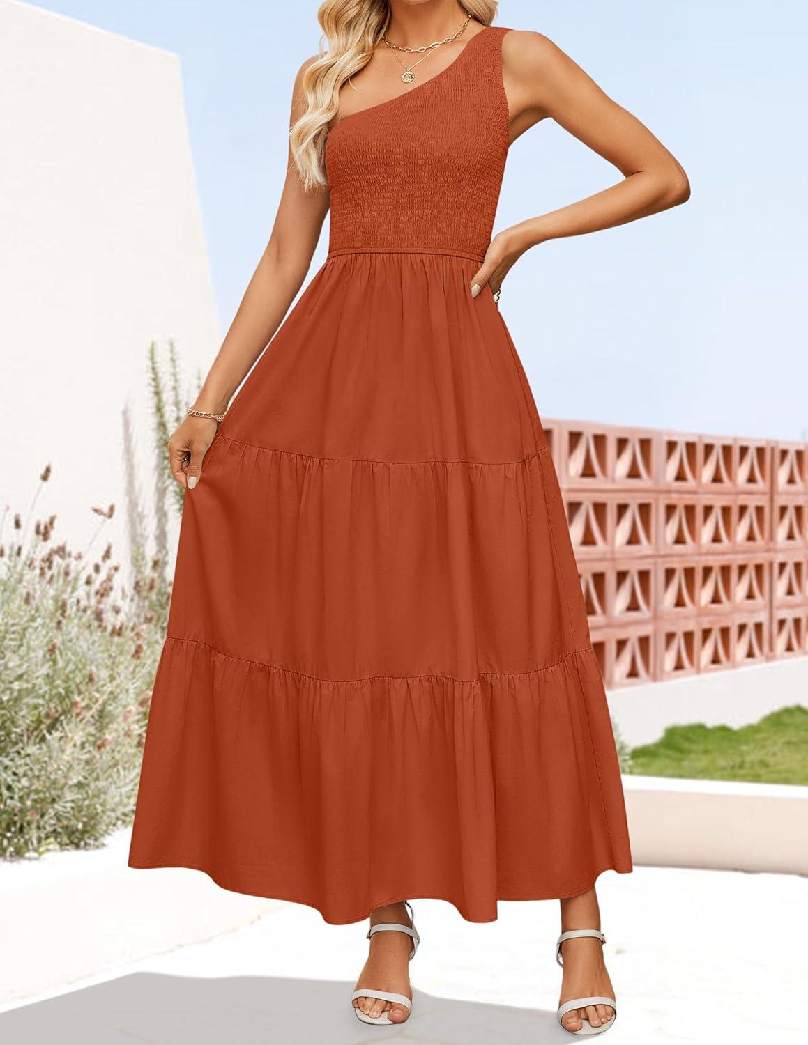 ZESICA Women’s 2025 Bohemian Summer Floral Print One Shoulder Sleeveless Smocked Ruffle Tiered Beach Long Midi Dress(Solidrust)
