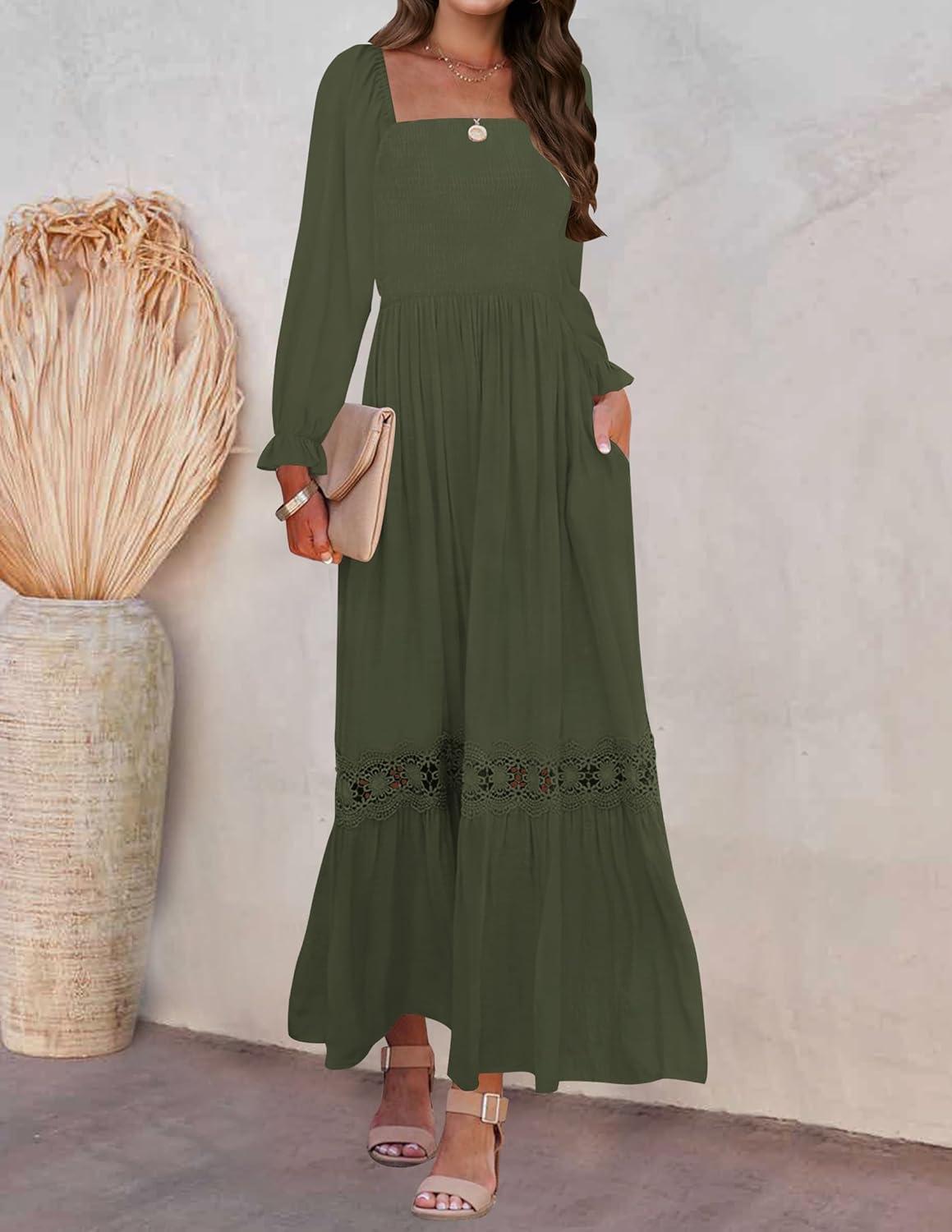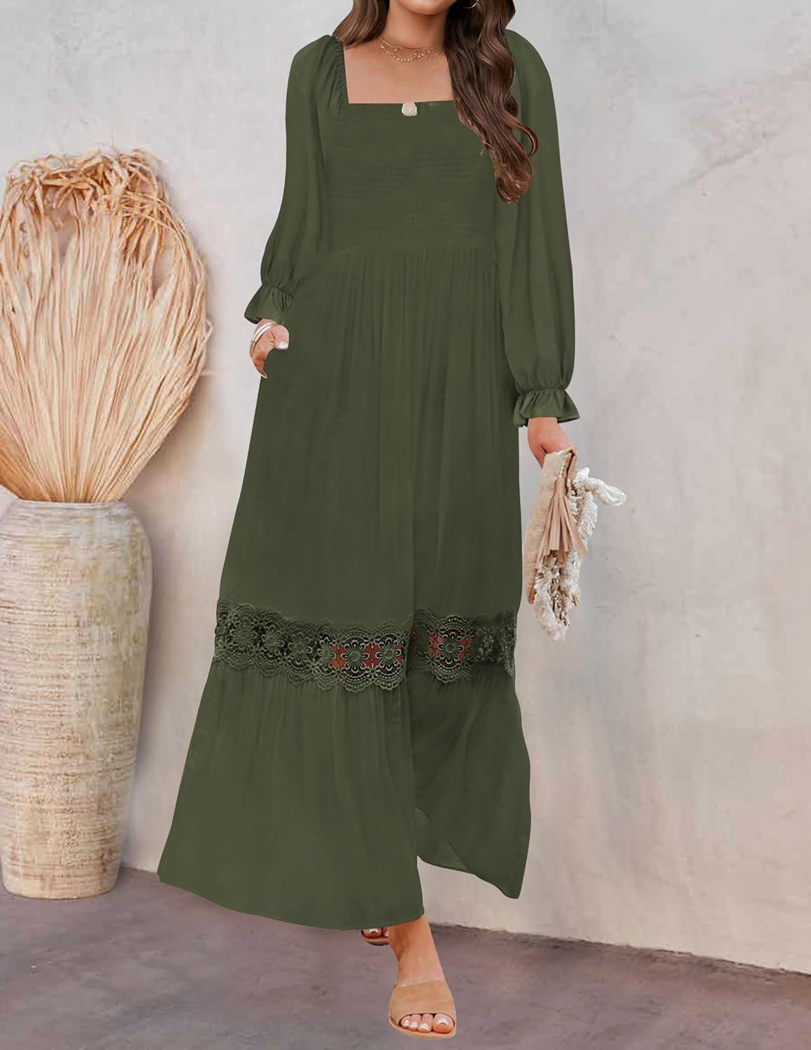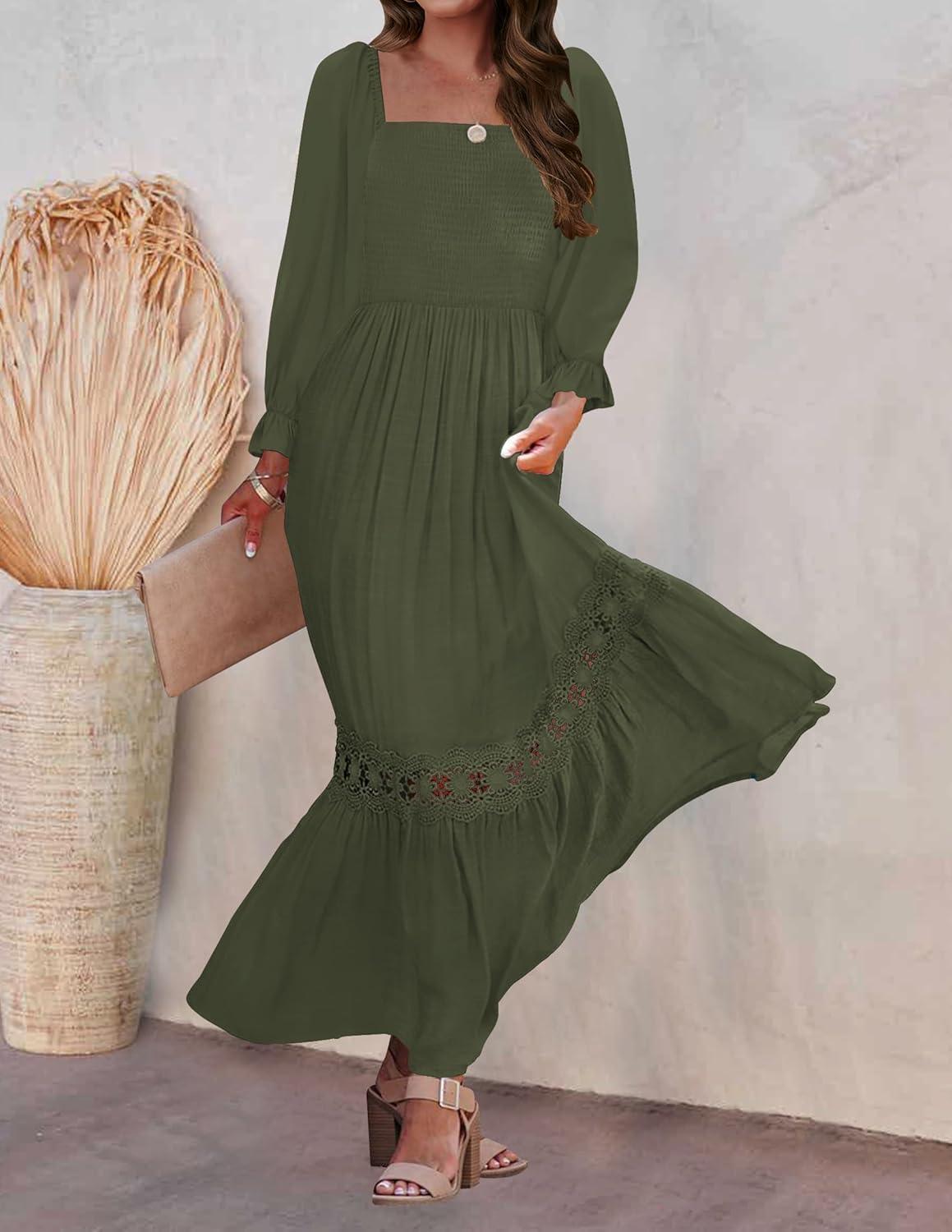 Get more for your money with our exclusive bundle deals on ZESICA Women’s 2025 Boho Long Sleeve Square Neck Smocked High Waist Flowy A Line Lace Trim Maxi Dress and accessories.