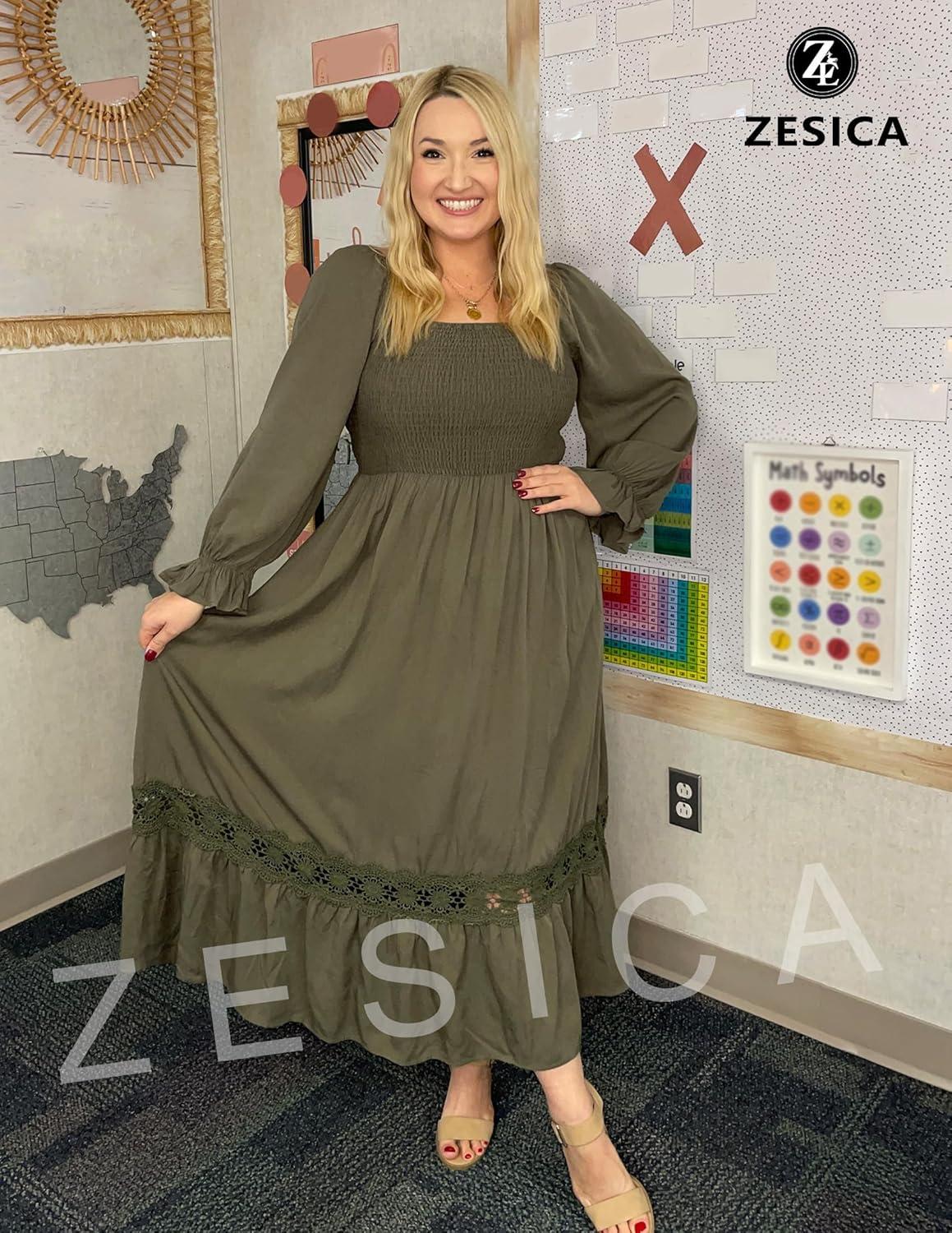 ZESICA Women's 2025 Boho Long Sleeve Square Neck Smocked High Waist Flowy A Line Lace Trim Maxi Dress