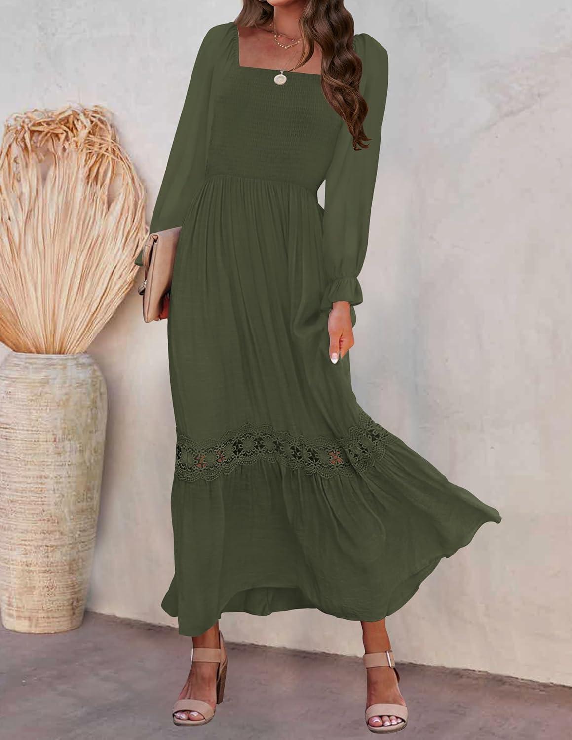 ZESICA Women’s 2025 Boho Long Sleeve Square Neck Smocked High Waist Flowy A Line Lace Trim Maxi Dress