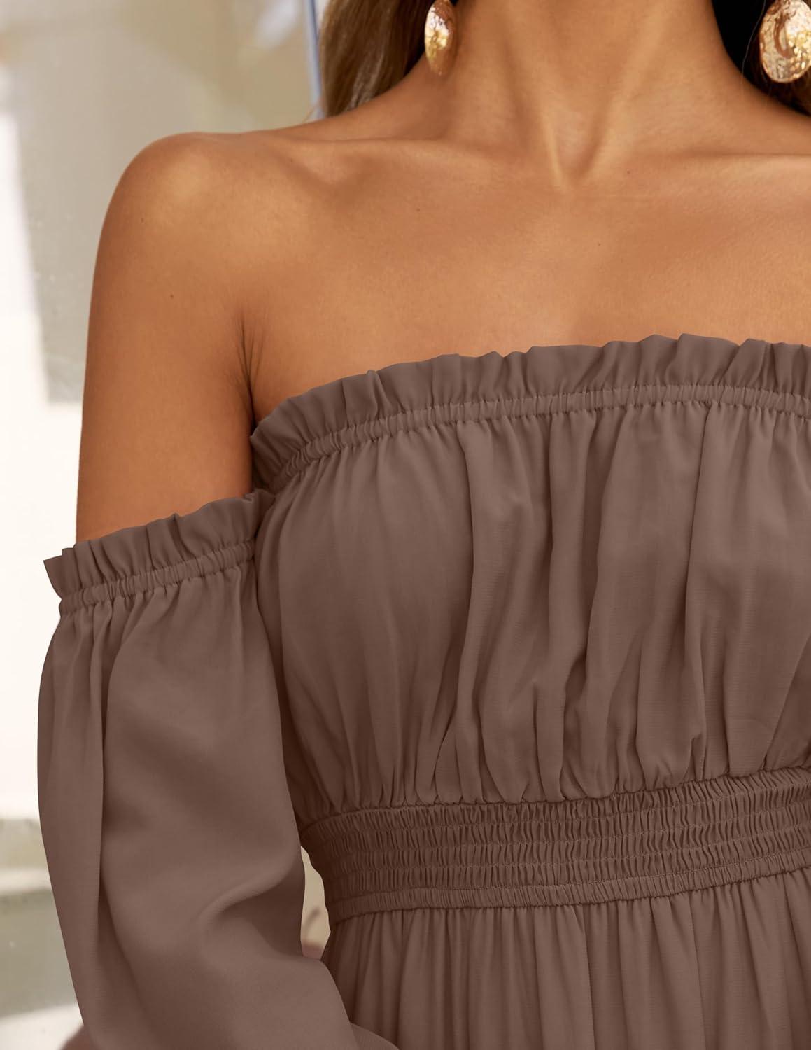 ZESICA Women's 2025 Boho Sexy Off Shoulder Long Sleeve Smocked High Waist Side Split Flowy A Line Tiered Long Maxi Dress(Coffee)