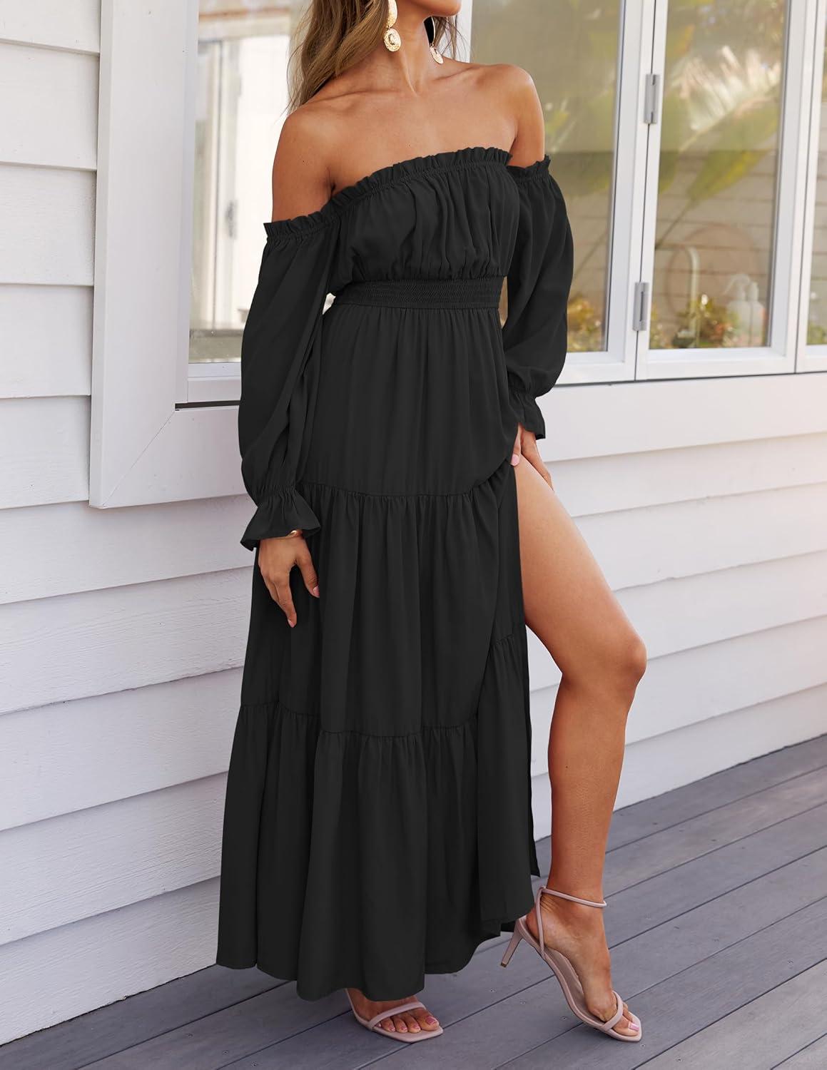 ZESICA Women's 2025 Boho Sexy Off Shoulder Long Sleeve Smocked High Waist Side Split Flowy A Line Tiered Long Maxi Dress(Dark Black)