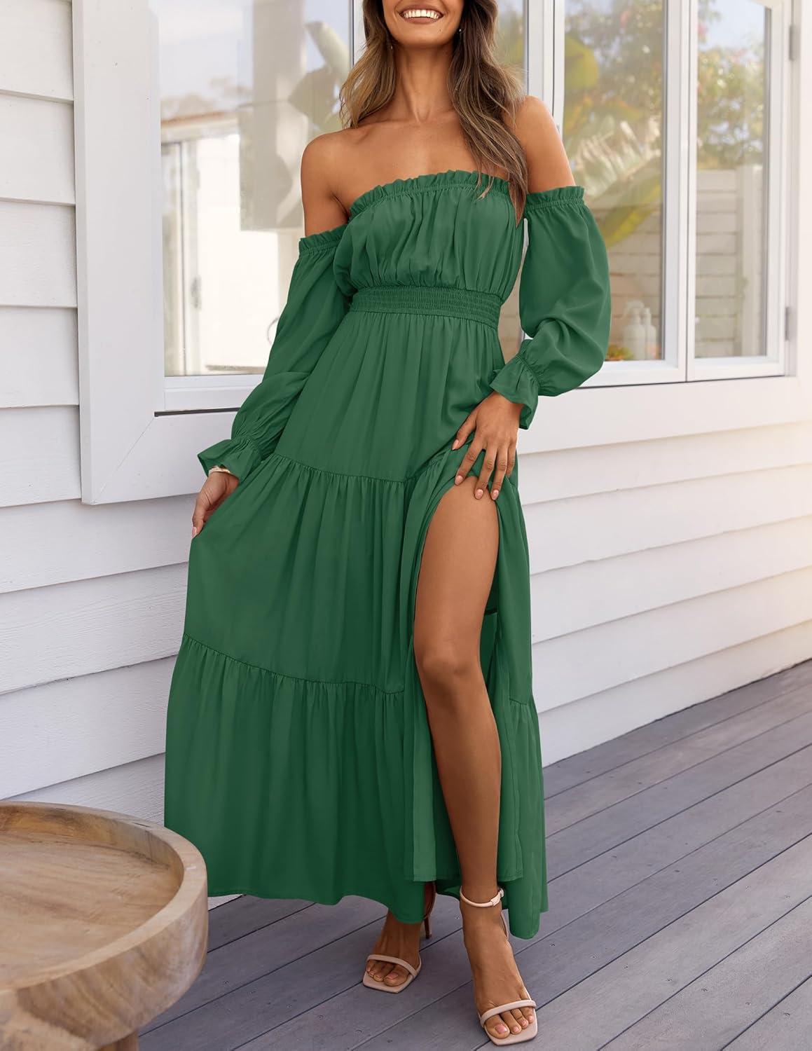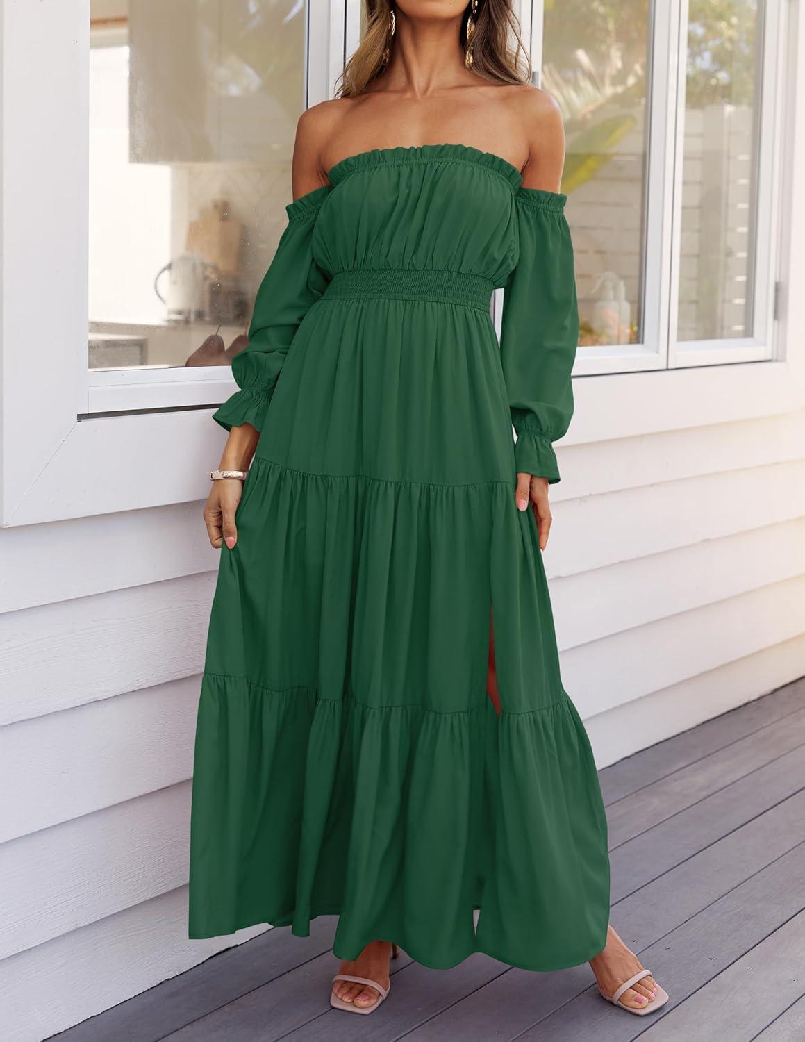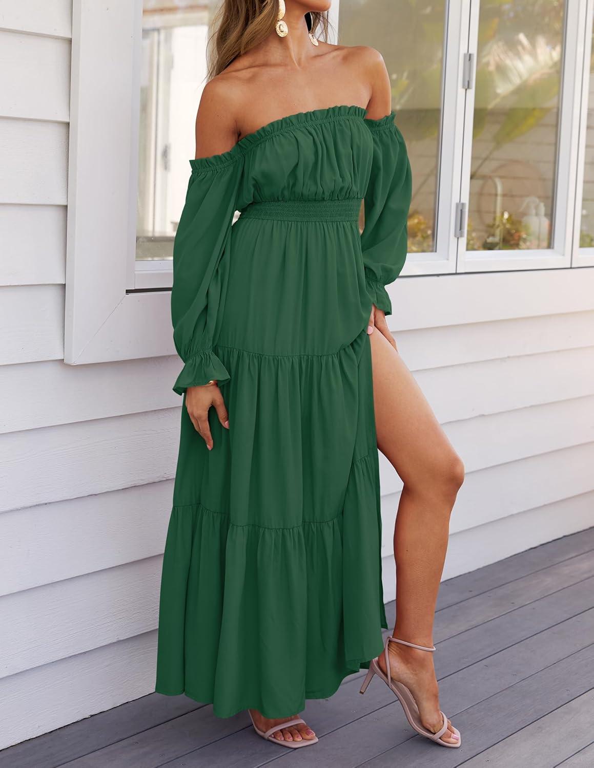 ZESICA Women’s 2025 Boho Sexy Off Shoulder Long Sleeve Smocked High Waist Side Split Flowy A Line Tiered Long Maxi Dress(Dark Green)