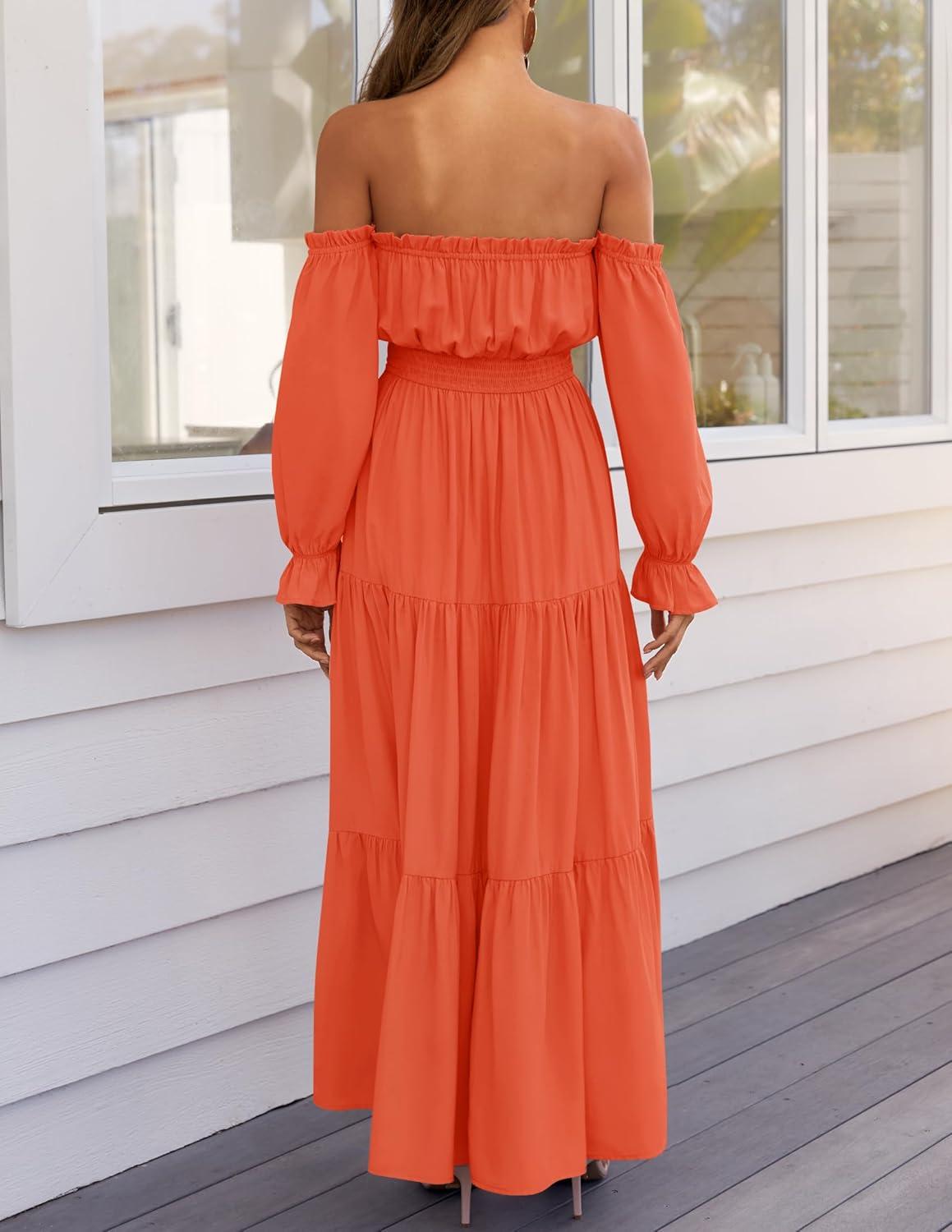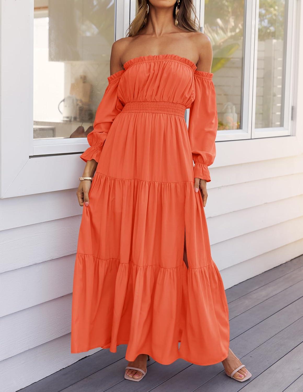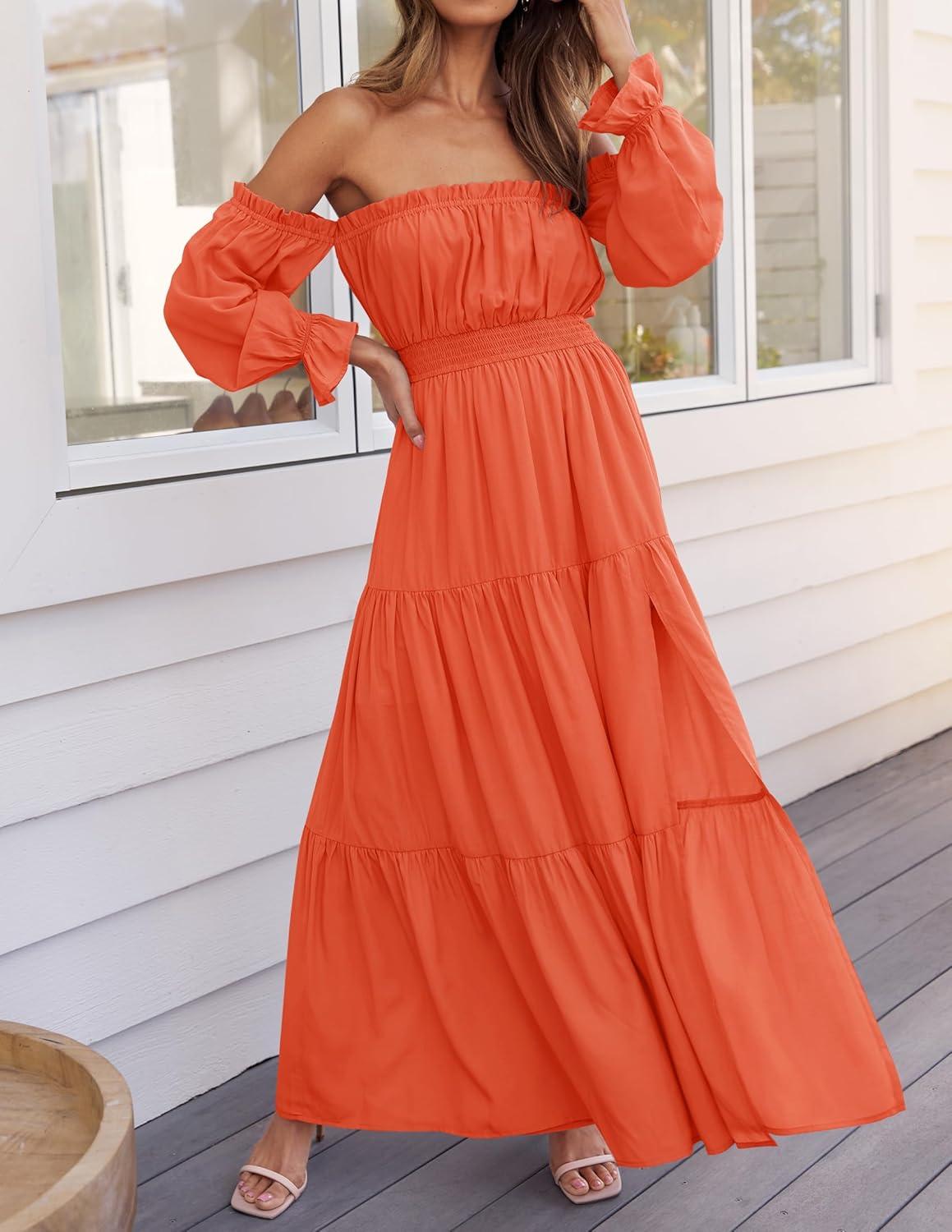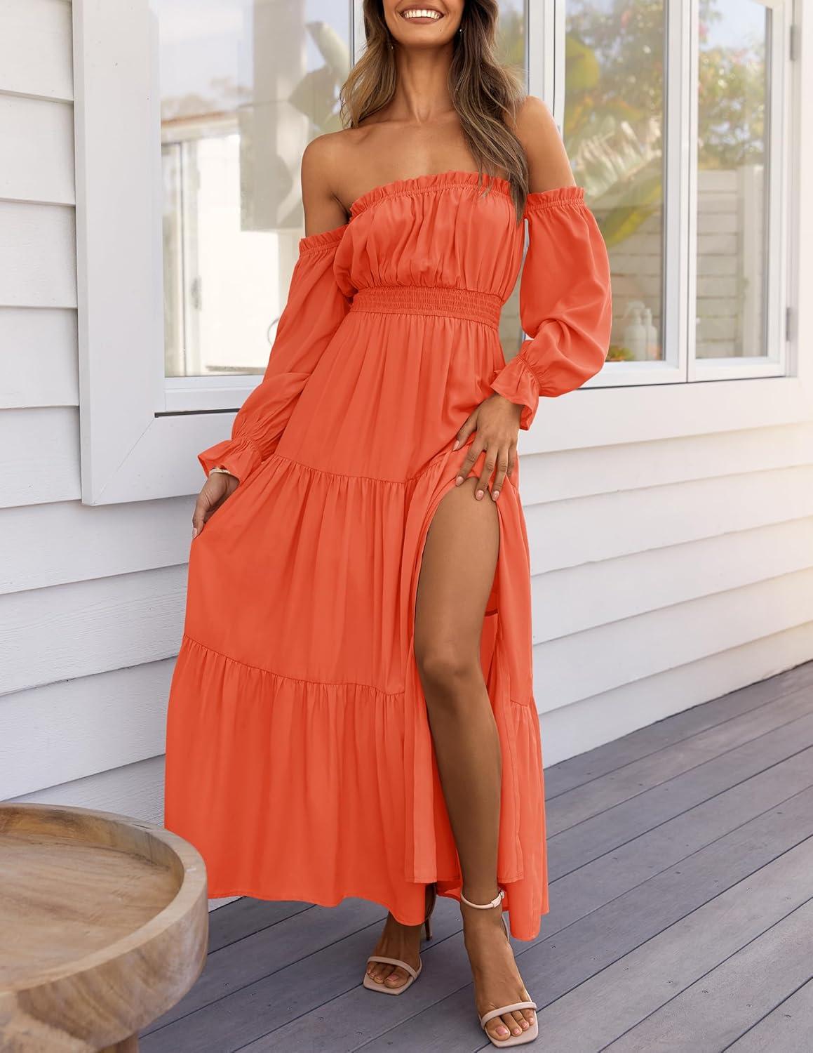 ZESICA Women's 2025 Boho Sexy Off Shoulder Long Sleeve Smocked High Waist Side Split Flowy A Line Tiered Long Maxi Dress(Orange)