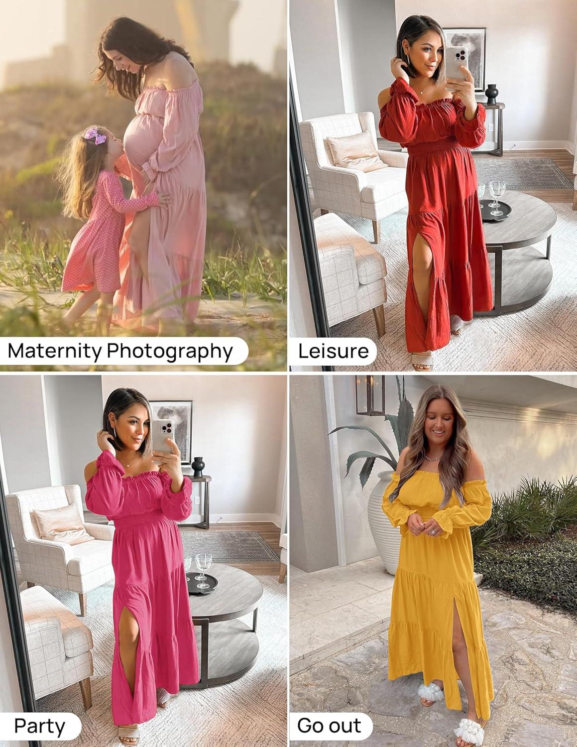 imageZESICA Womens 2025 Boho Sexy Off Shoulder Long Sleeve Smocked High Waist Side Split Flowy A Line Tiered Long Maxi DressOrange