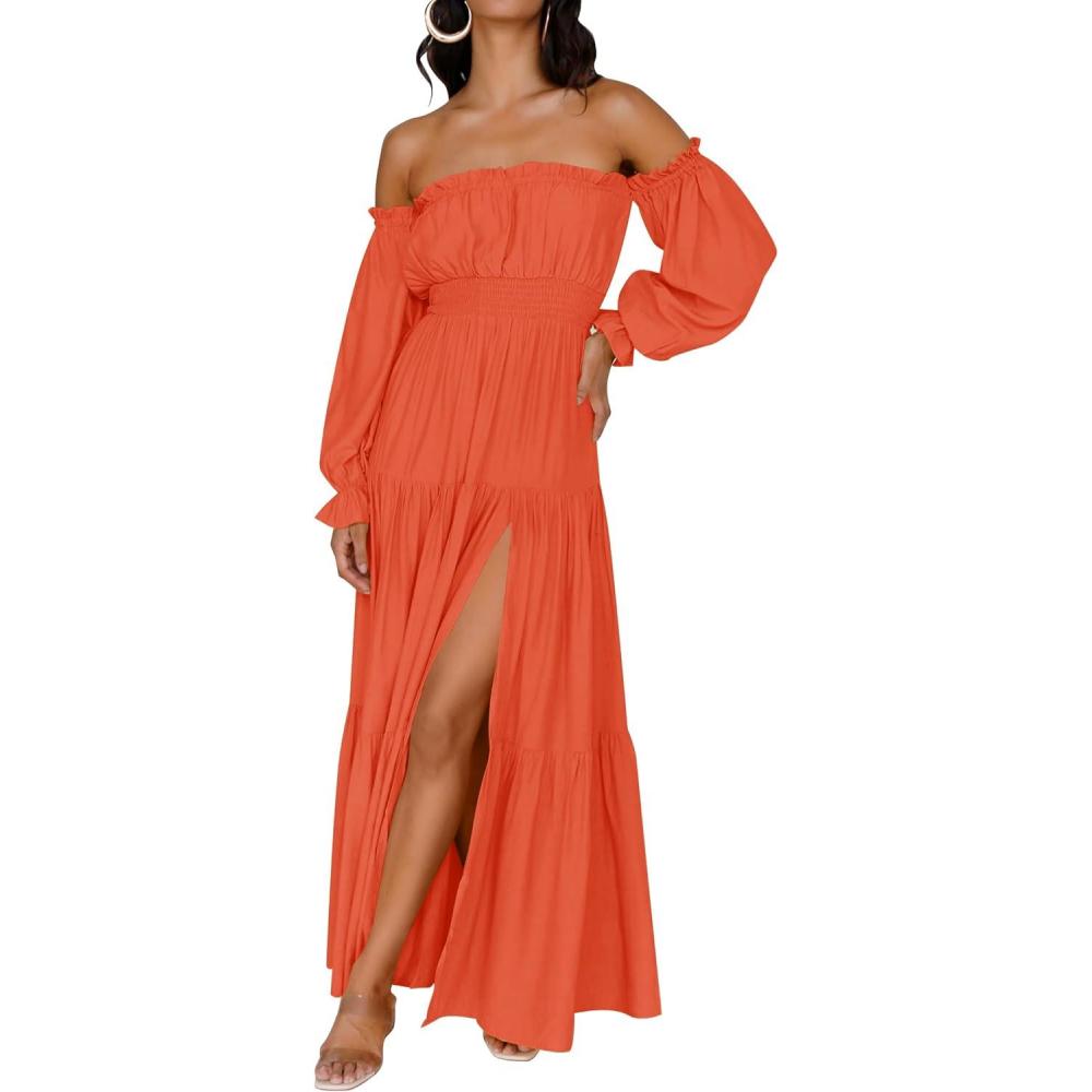 ZESICA Women’s 2025 Boho Sexy Off Shoulder Long Sleeve Smocked High Waist Side Split Flowy A Line Tiered Long Maxi Dress(Orange)