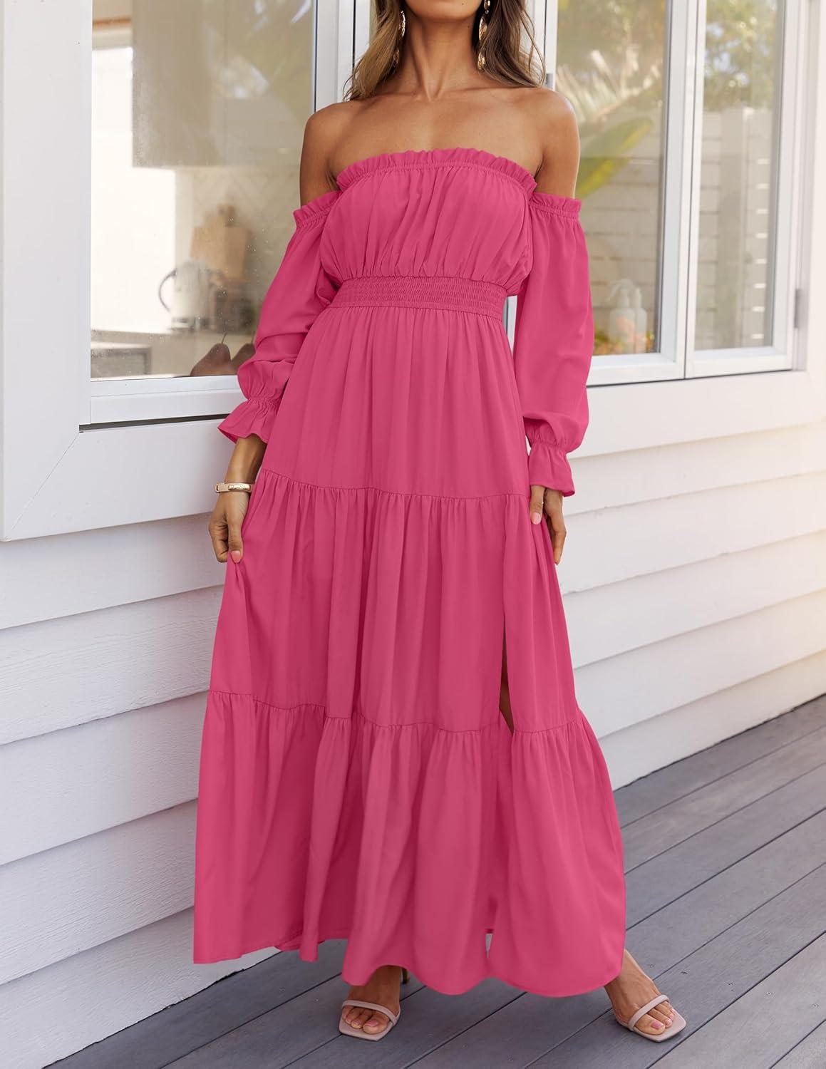 ZESICA Women’s 2025 Boho Sexy Off Shoulder Long Sleeve Smocked High Waist Side Split Flowy A Line Tiered Long Maxi Dress(Pink)
