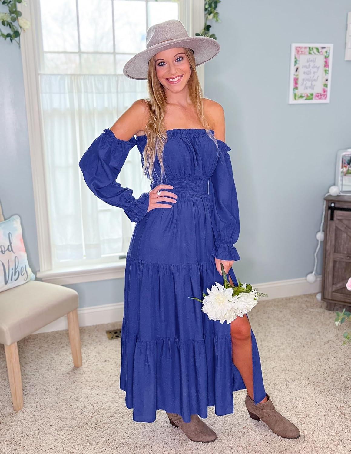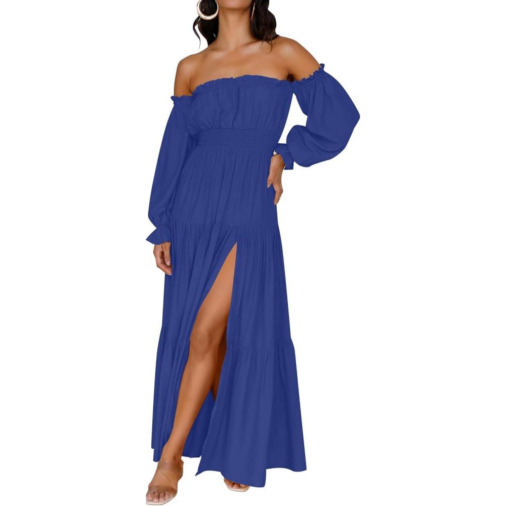 ZESICA Women's 2025 Boho Sexy Off Shoulder Long Sleeve Smocked High Waist Side Split Flowy A Line Tiered Long Maxi Dress(Royal Blue)