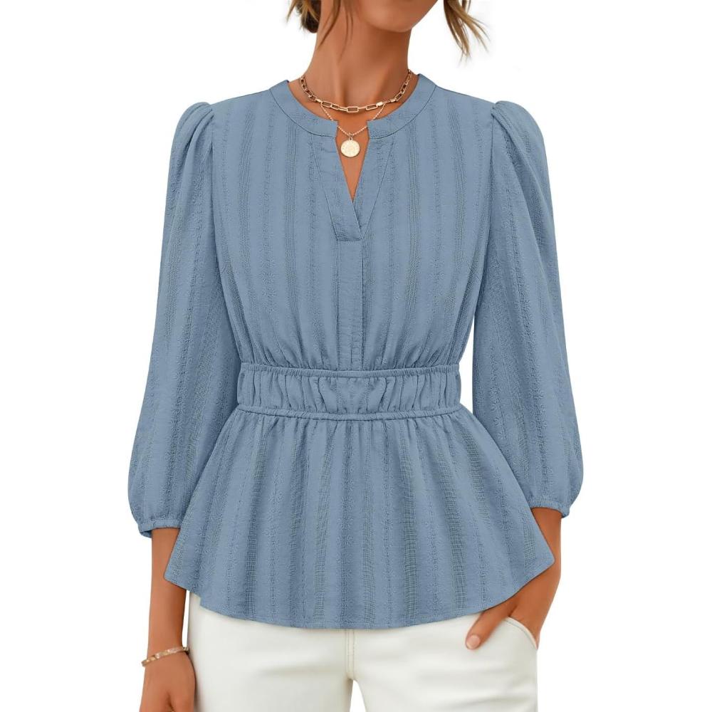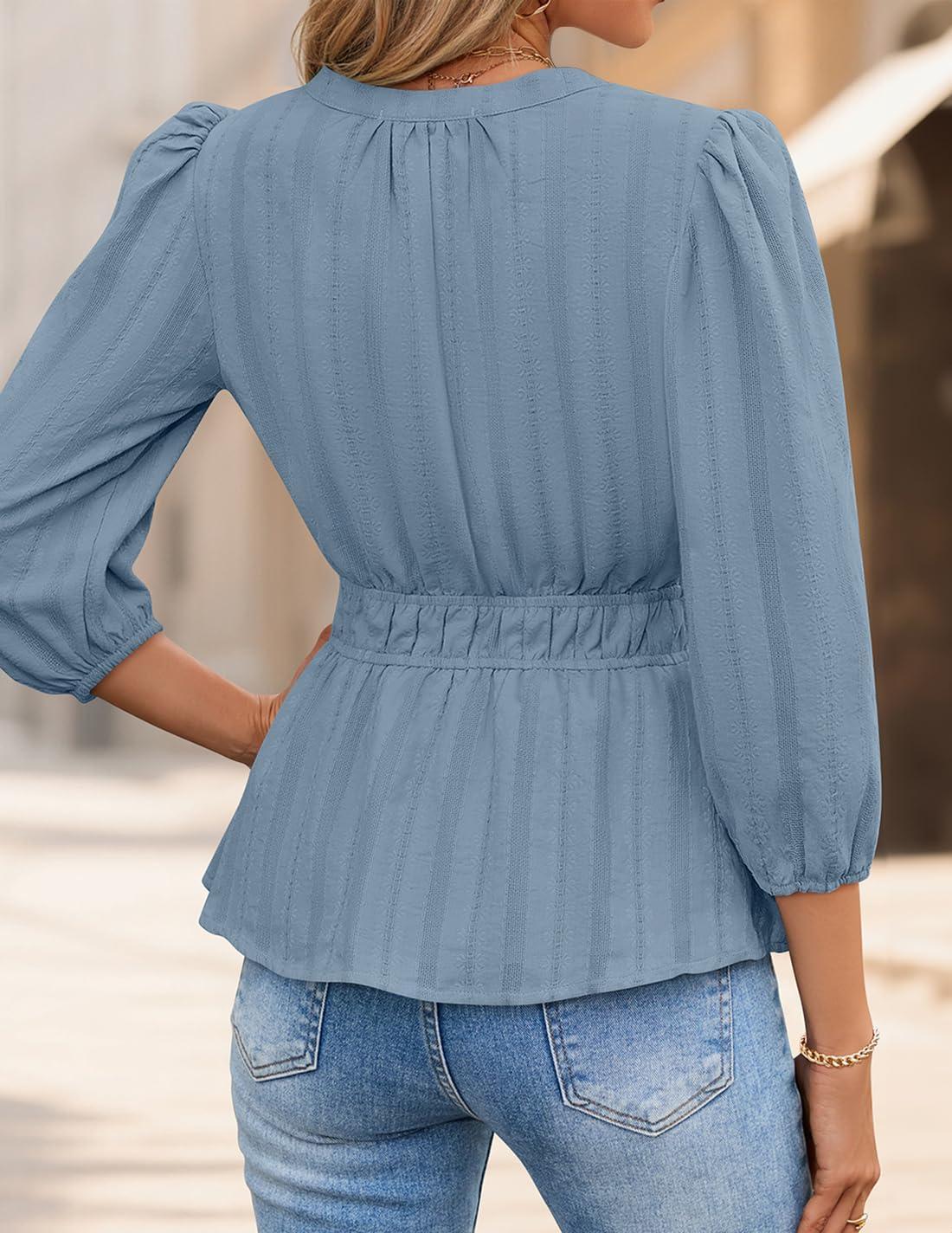ZESICA Women's 2025 Fall Babydoll Peplum Tops V Neck Puff 3/4 Length Sleeve Shirts Dressy Casual Blouses(Dustyblue)