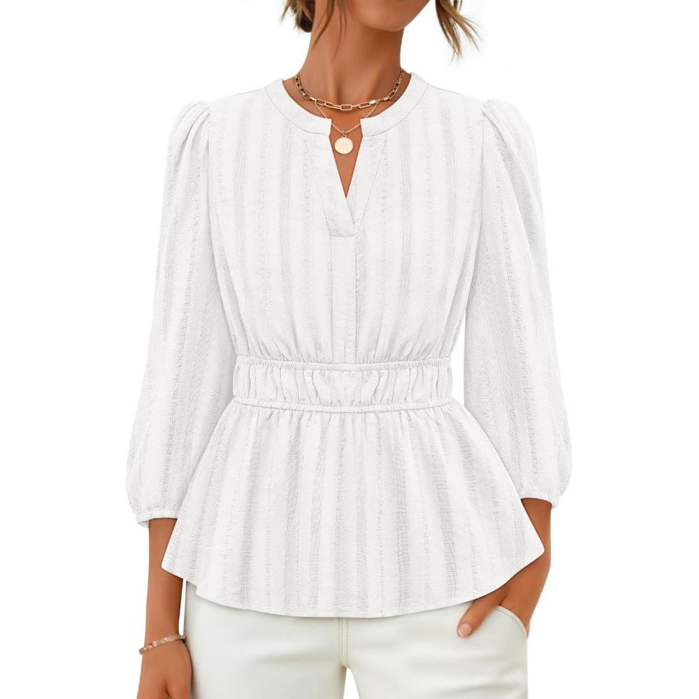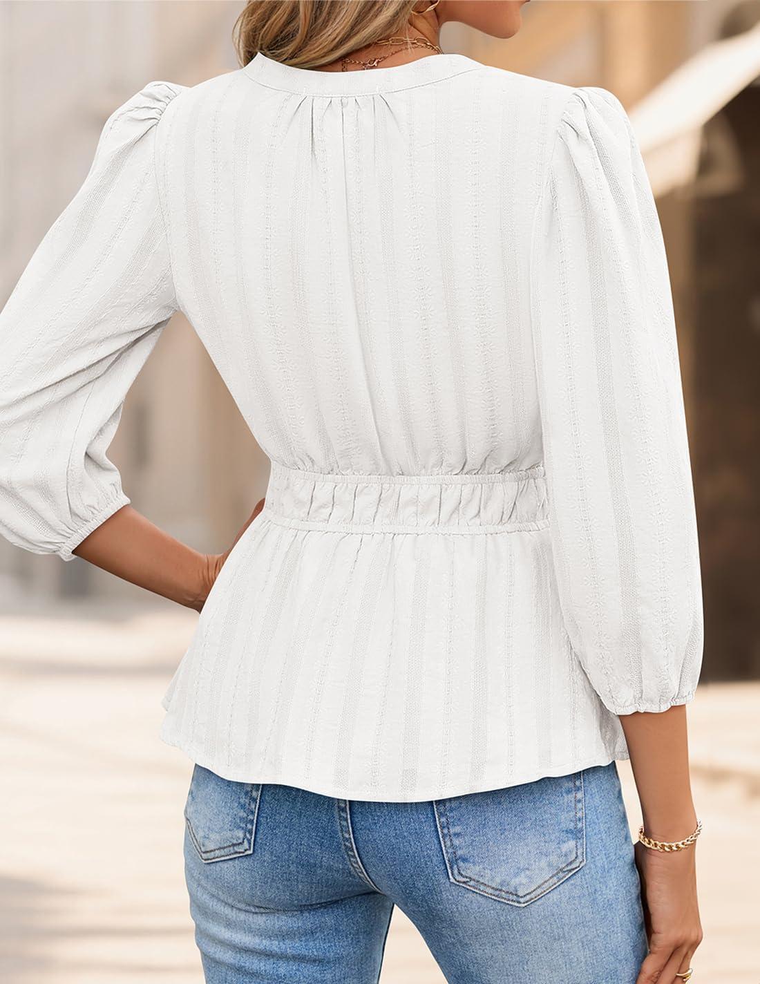 ZESICA Women’s 2025 Fall Babydoll Peplum Tops V Neck Puff 3/4 Length Sleeve Shirts Dressy Casual Blouses(White)