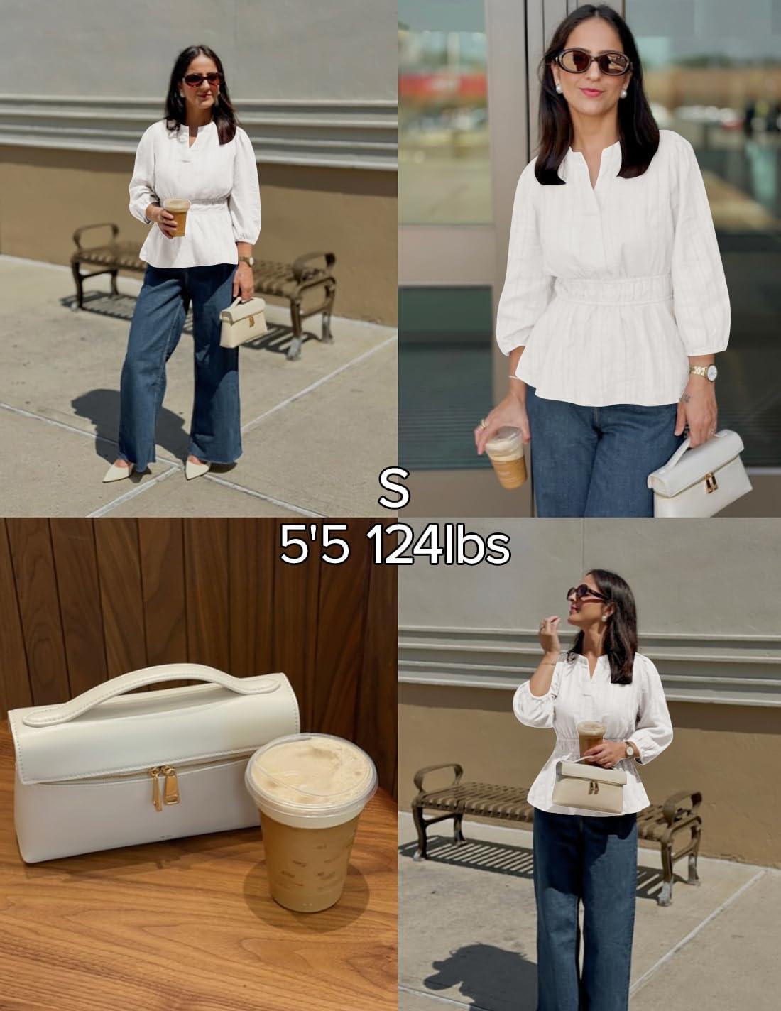imageZESICA Womens 2025 Fall Babydoll Peplum Tops V Neck Puff 34 Length Sleeve Shirts Dressy Casual BlousesWhite