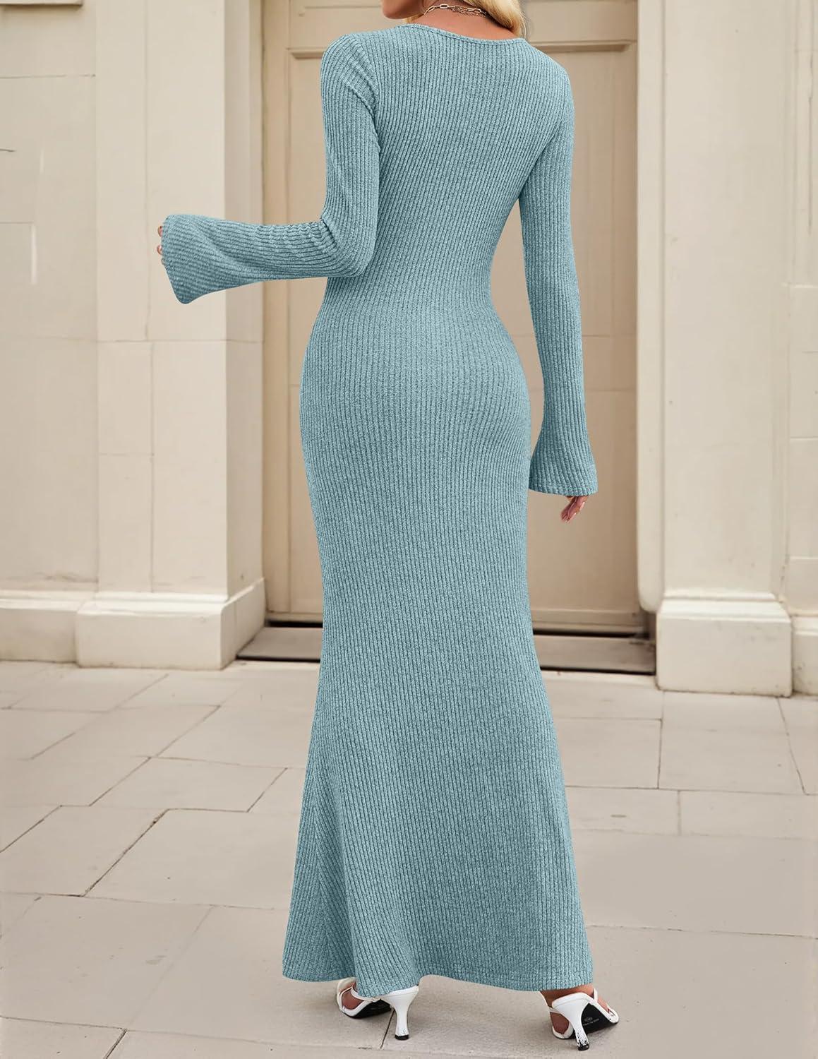 ZESICA Women’s 2025 Fall Bodycon Sweater Dress Long Sleeve Boat Neck Ribbed Knit Wedding Guest Cocktail Maxi Dresses(Light Blue)