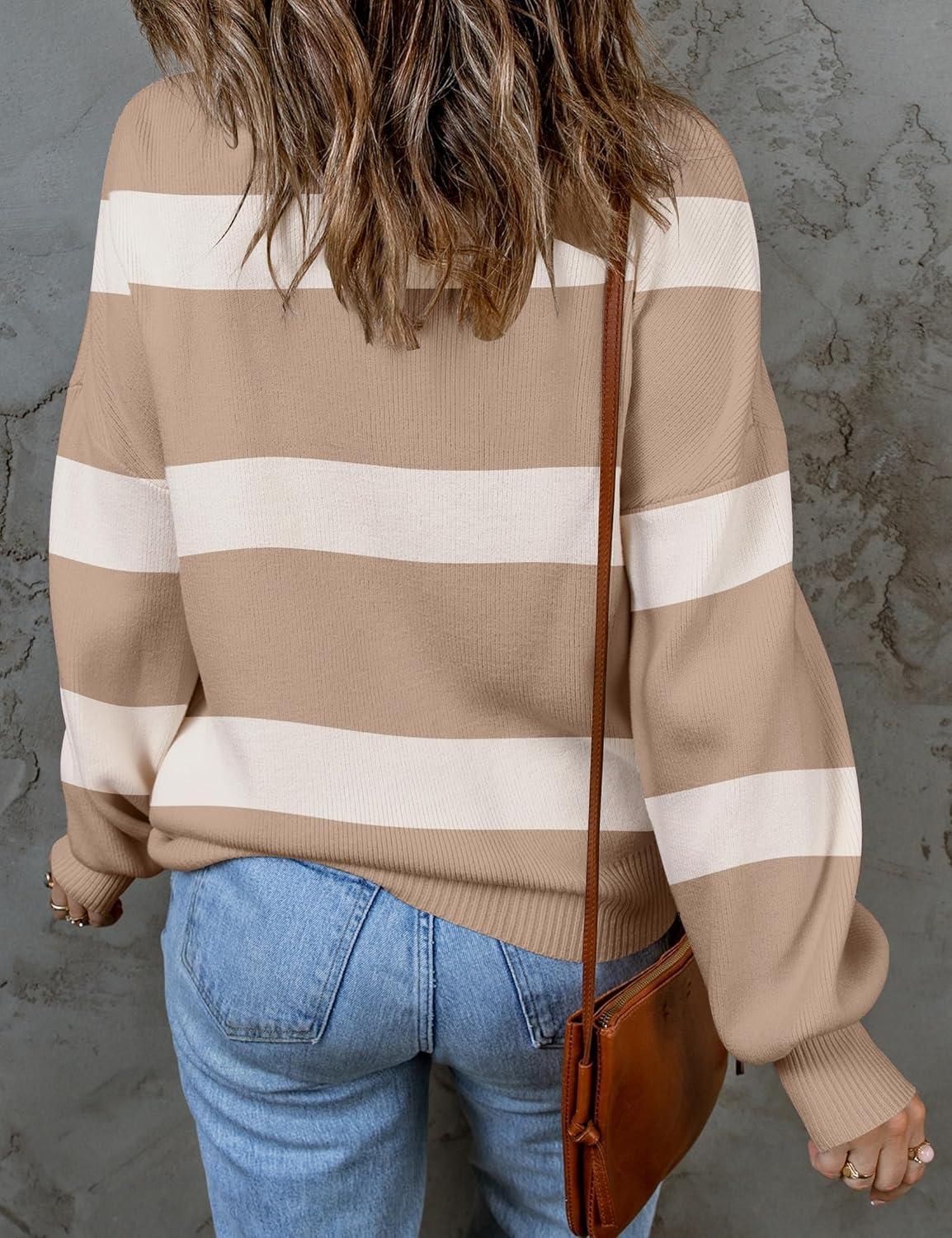 imageZESICA Womens 2025 Fall Fashion Turtleneck Long Sleeve Striped Ribbed Knit Loose Pullover Sweater TopsCamel