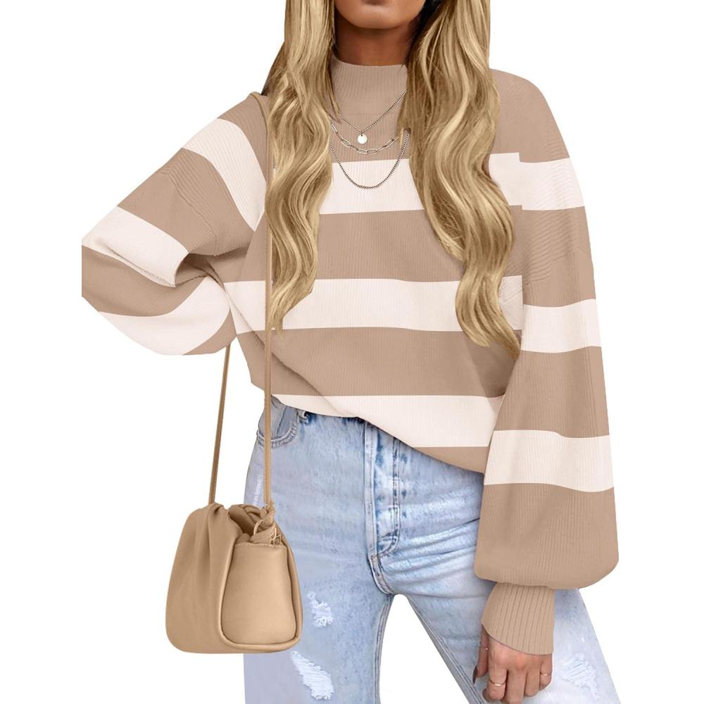 ZESICA Women’s 2025 Fall Fashion Turtleneck Long Sleeve Striped Ribbed Knit Loose Pullover Sweater Tops(Caramel)