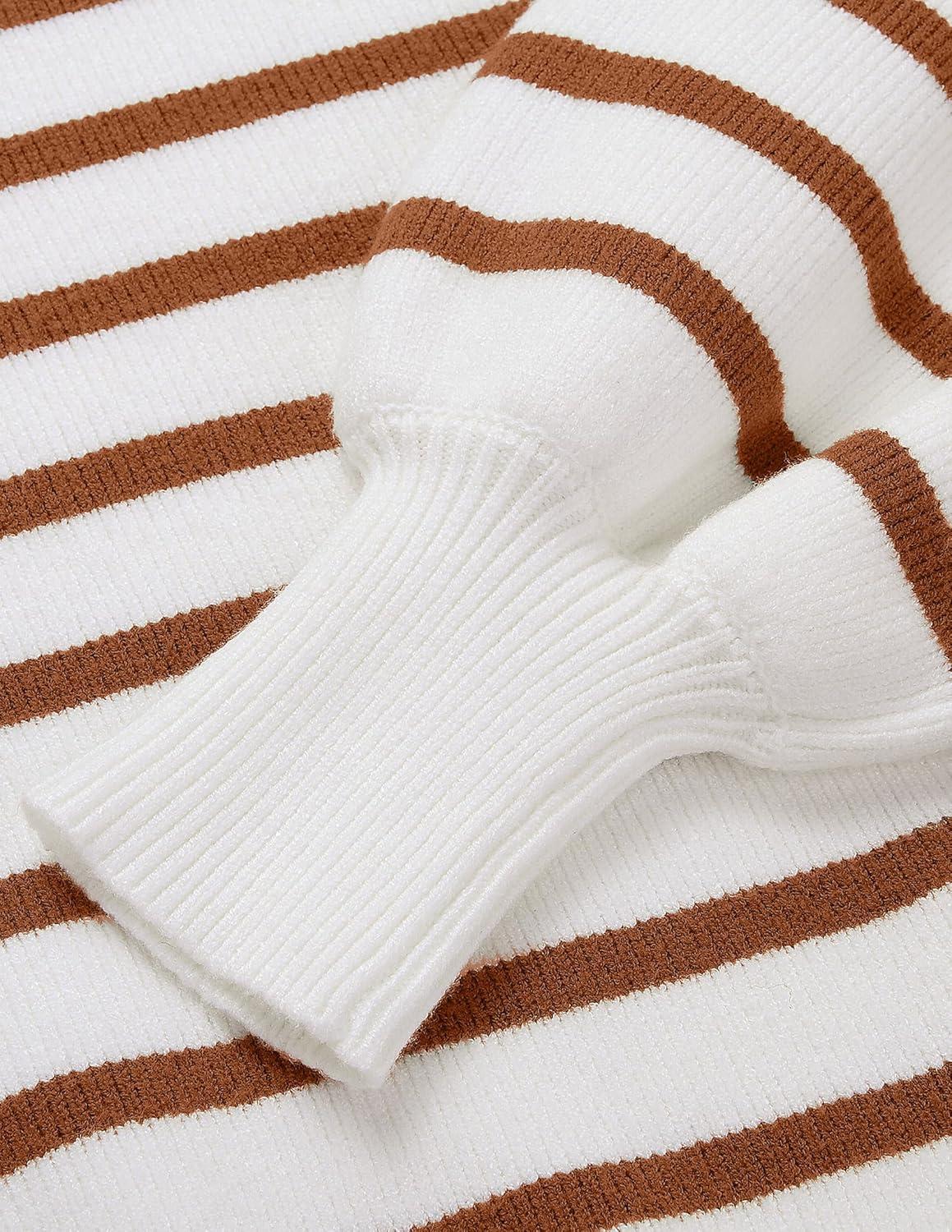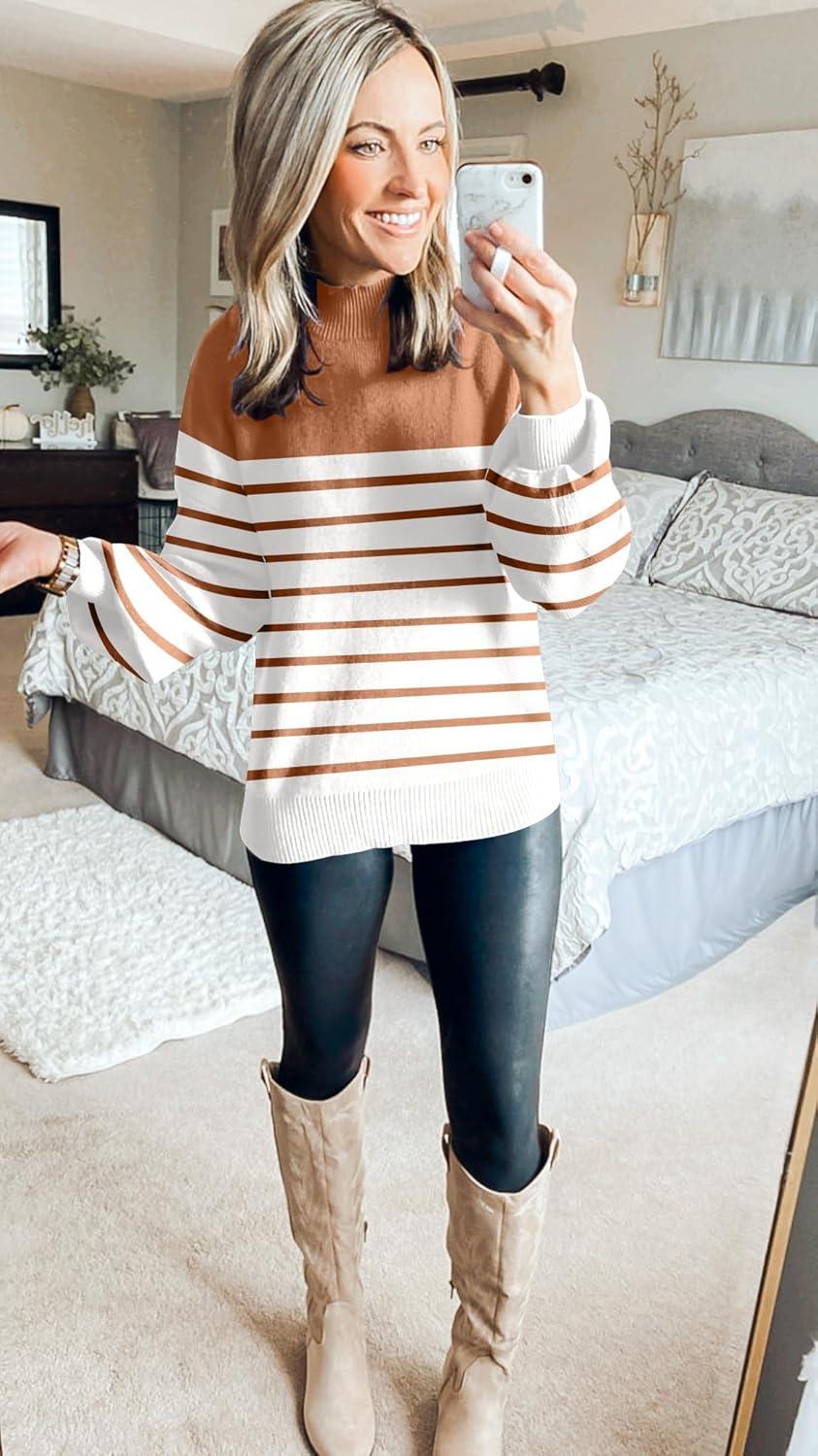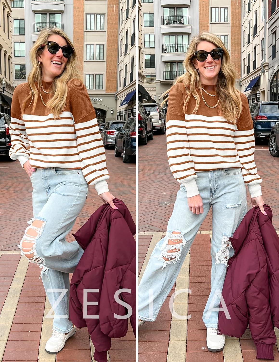 ZESICA Women’s 2025 Fall Fashion Turtleneck Long Sleeve Striped Ribbed Knit Loose Pullover Sweater Tops(Caramel)