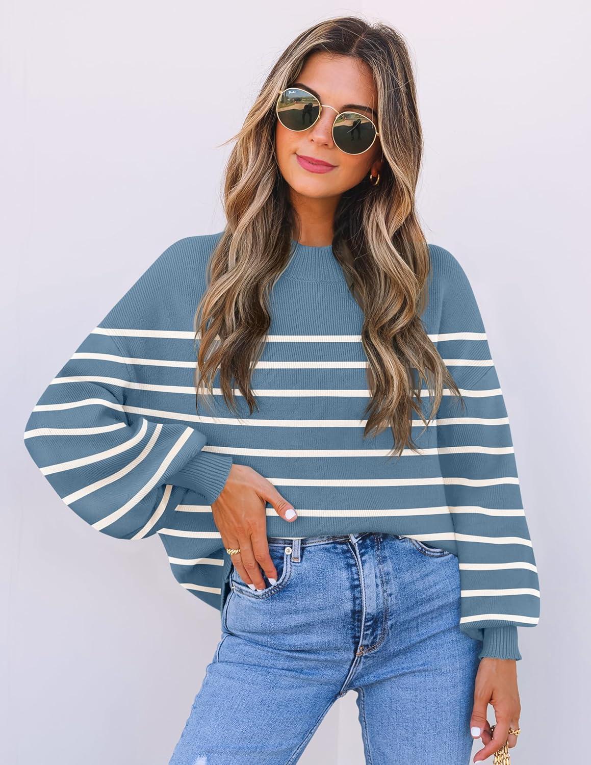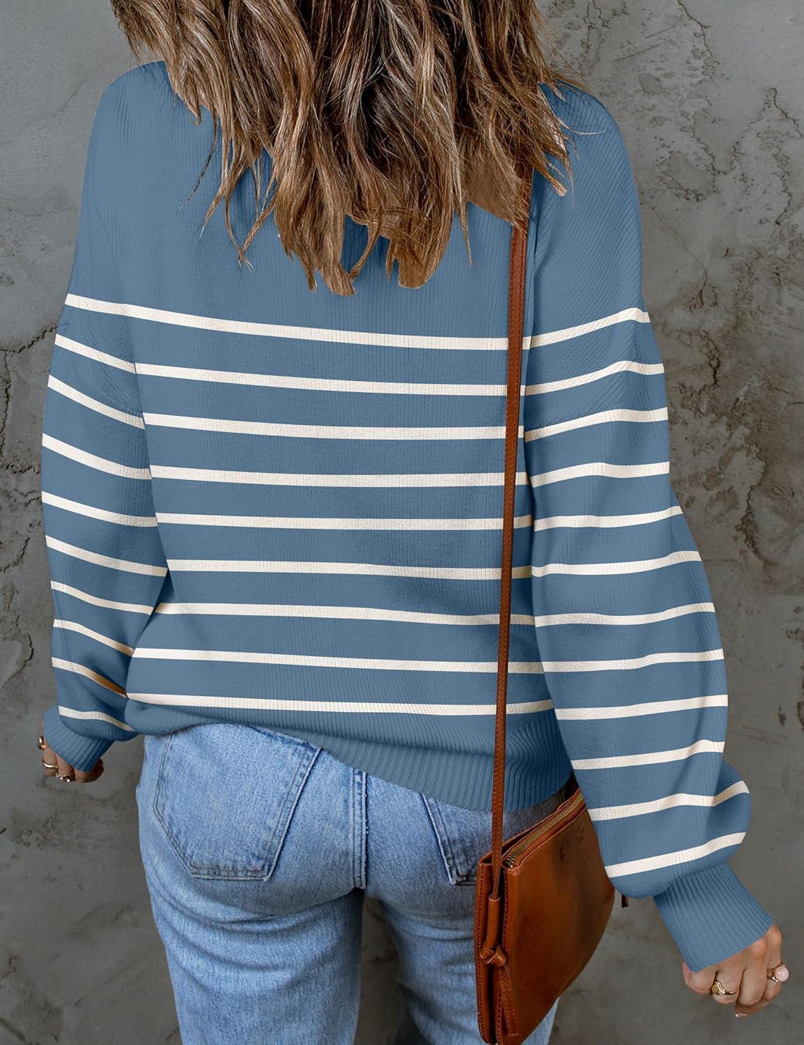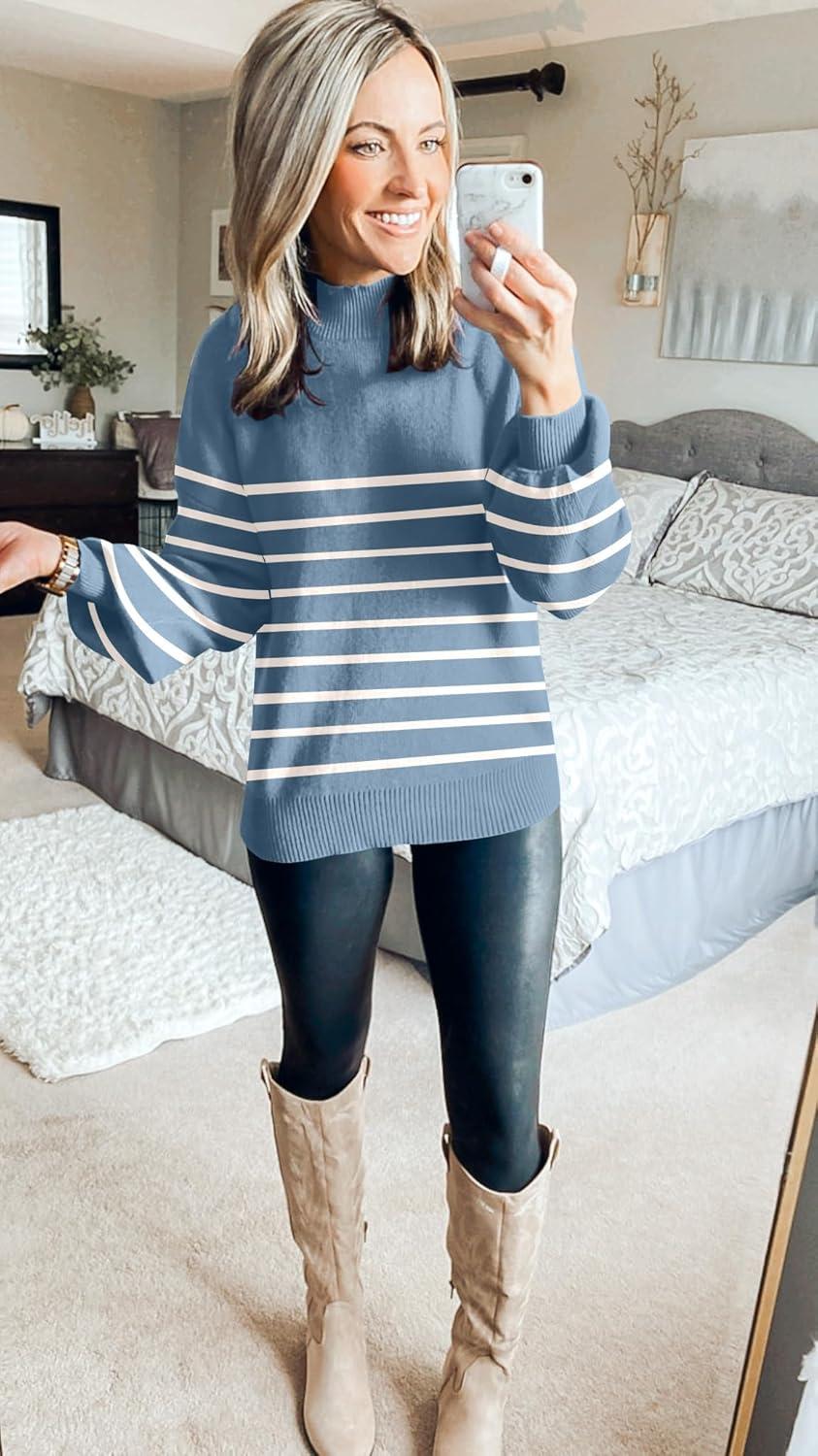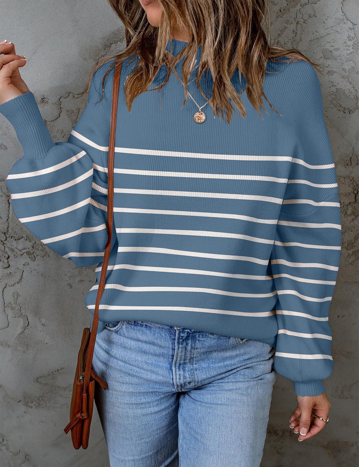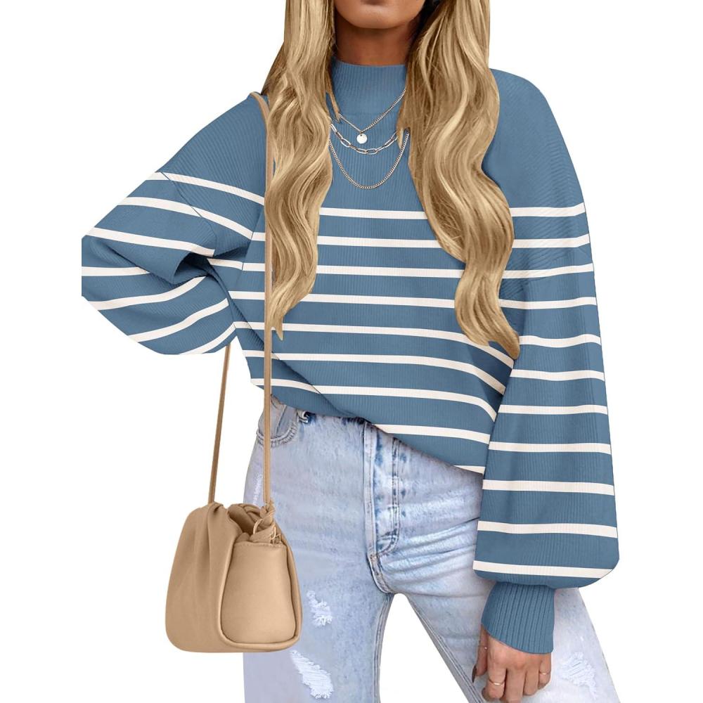 ZESICA Women’s 2025 Fall Fashion Turtleneck Long Sleeve Striped Ribbed Knit Loose Pullover Sweater Tops(Darkblue)
