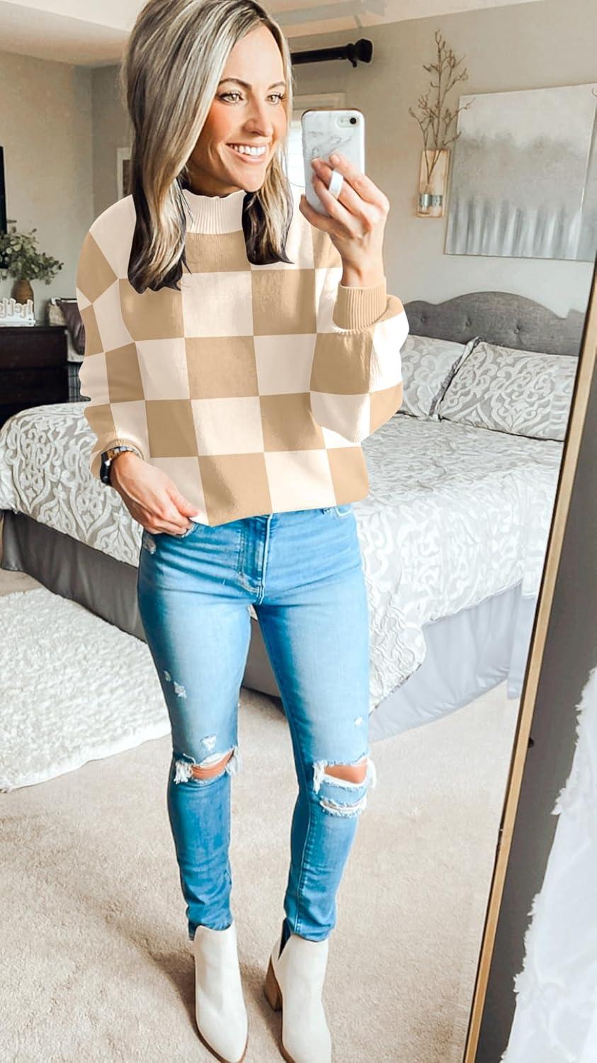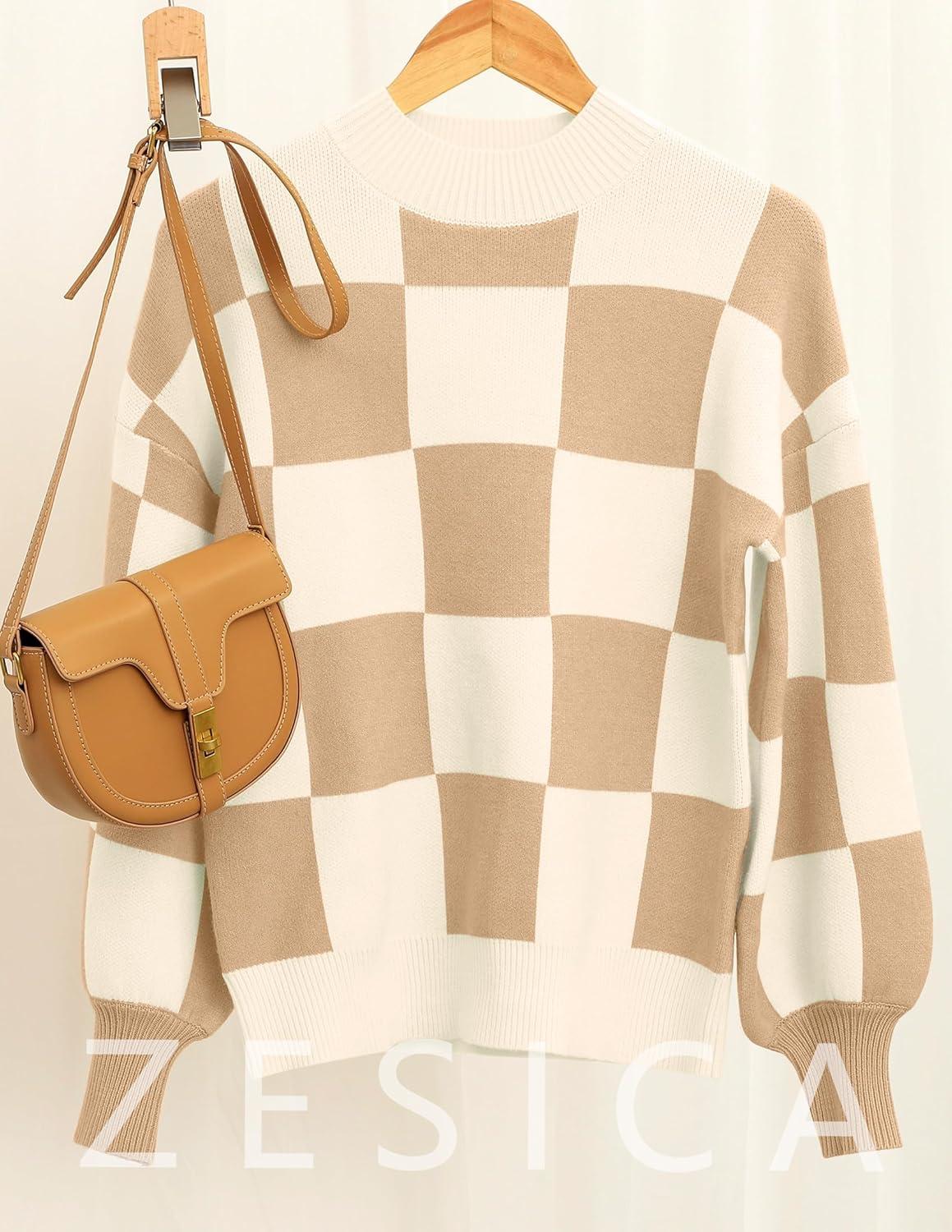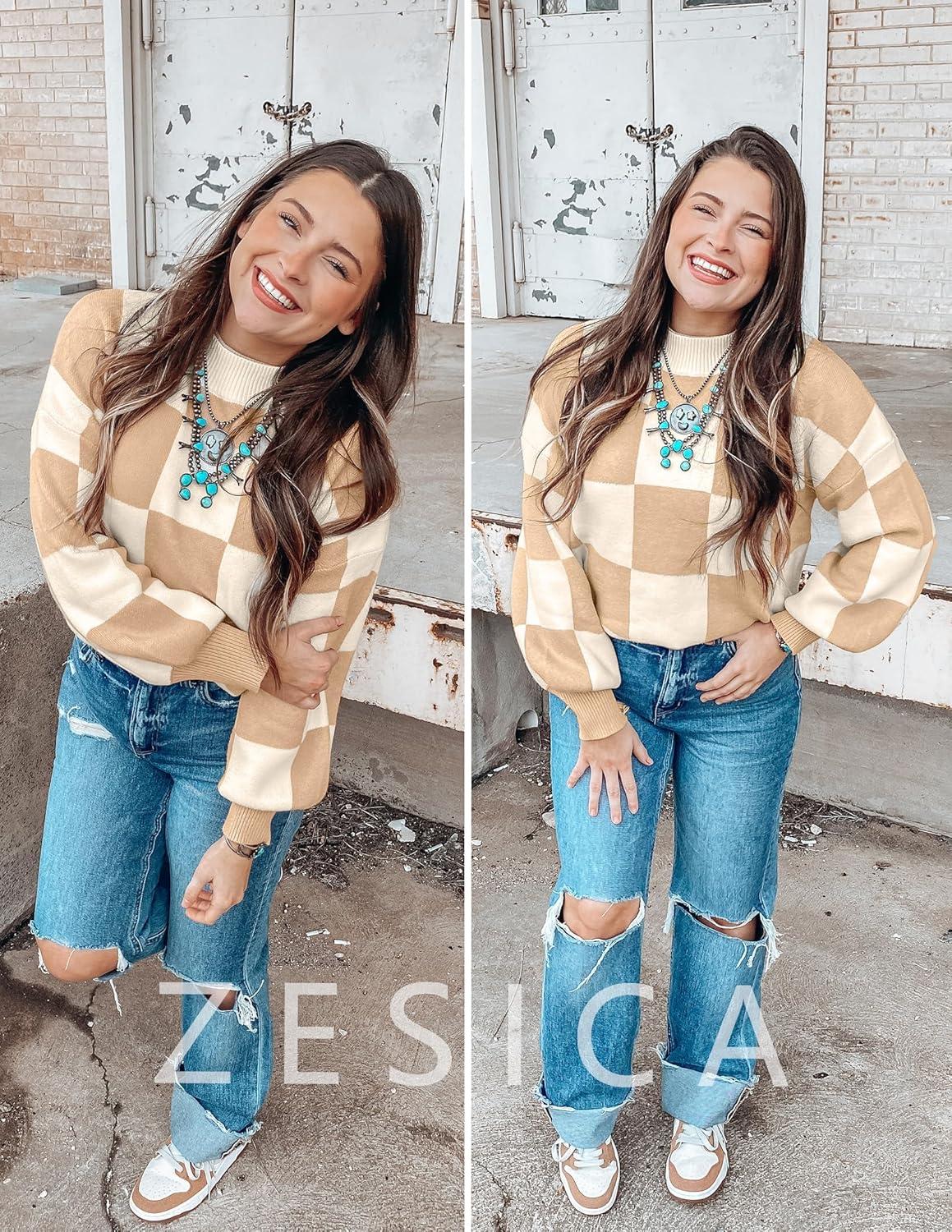 ZESICA Women’s 2025 Fall Fashion Turtleneck Long Sleeve Striped Ribbed Knit Loose Pullover Sweater Tops(Khakiplaid)