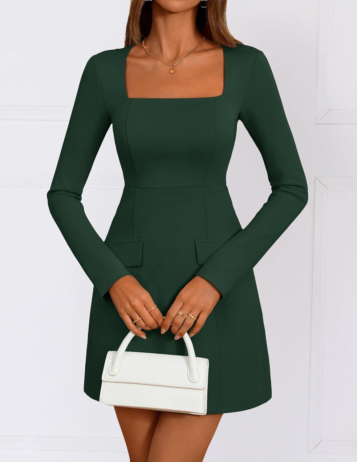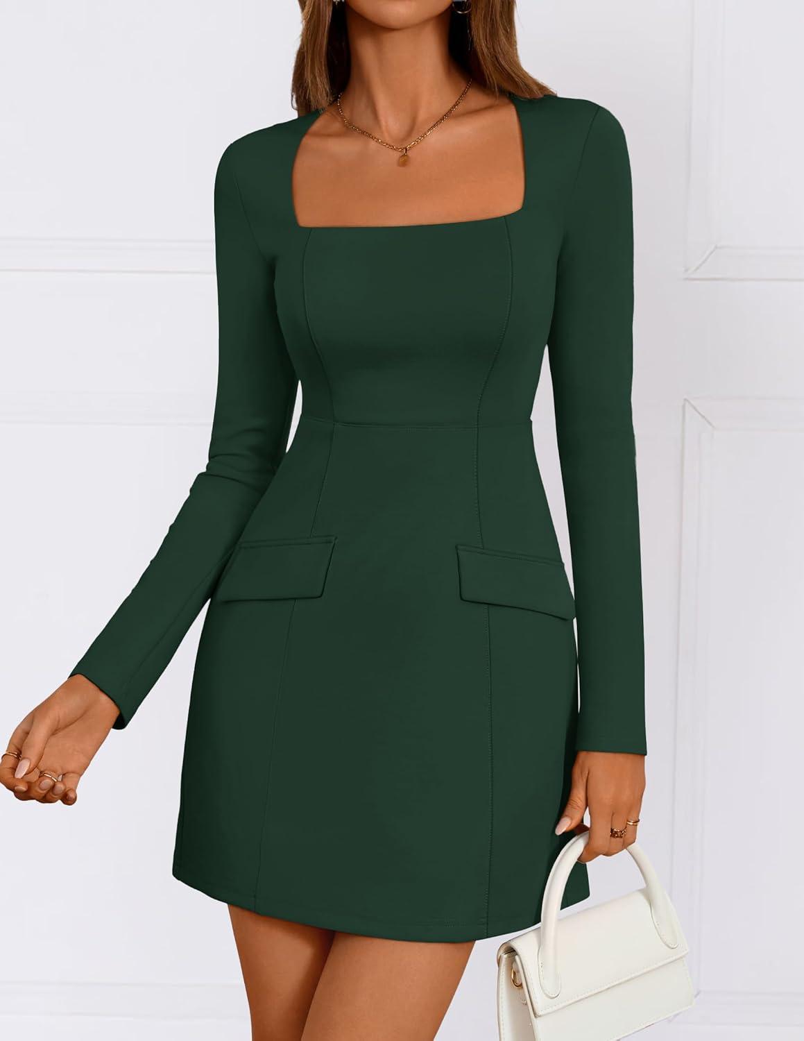 ZESICA Women’s 2025 Fall Long Sleeve Bodycon Mini Dress Casual Square Neck Slim Fit Cocktail Party Short Dresses(Dark Green)