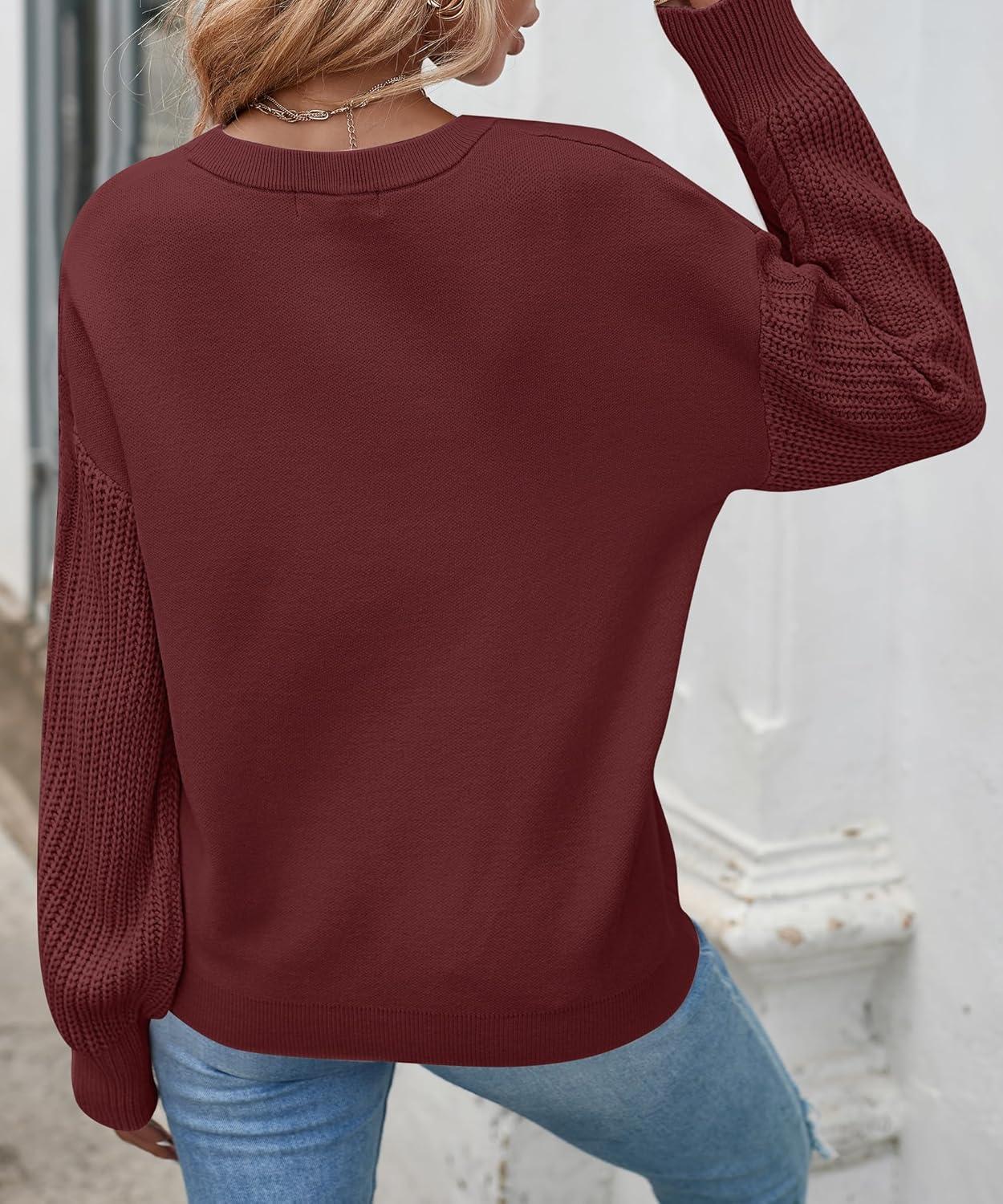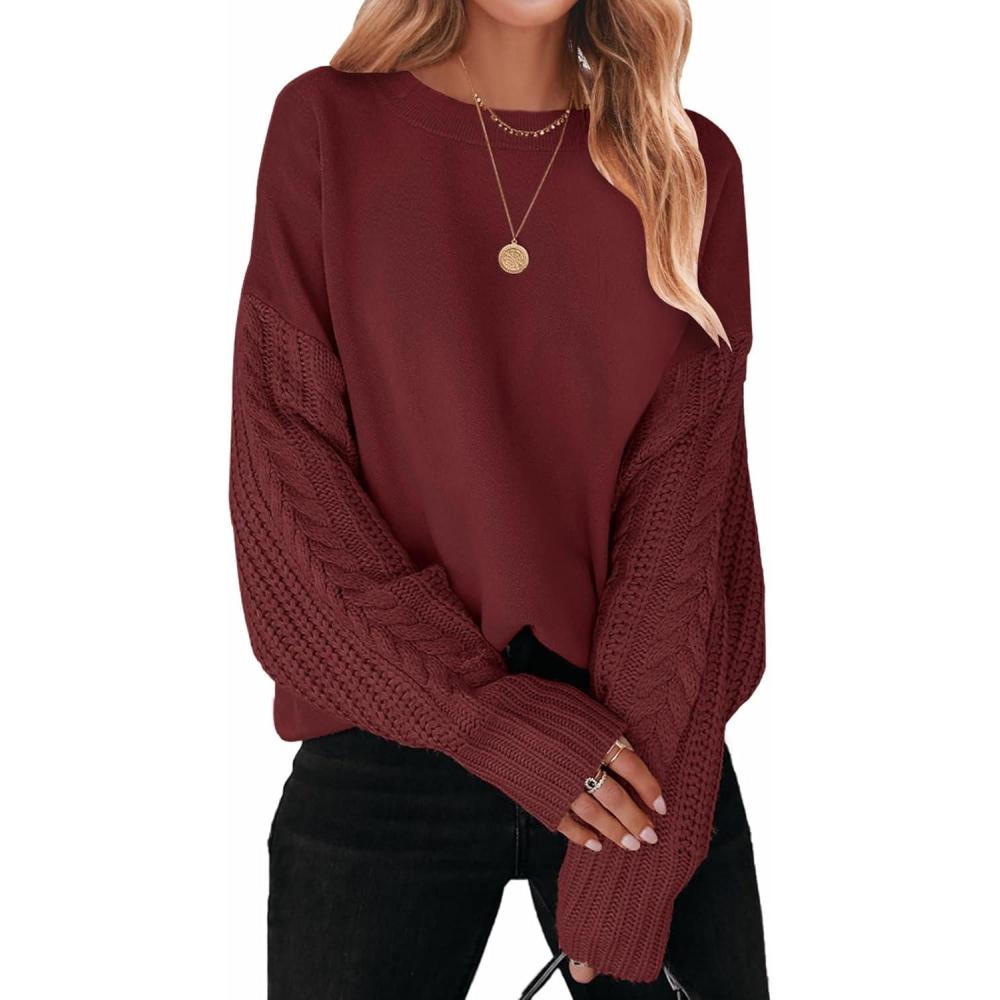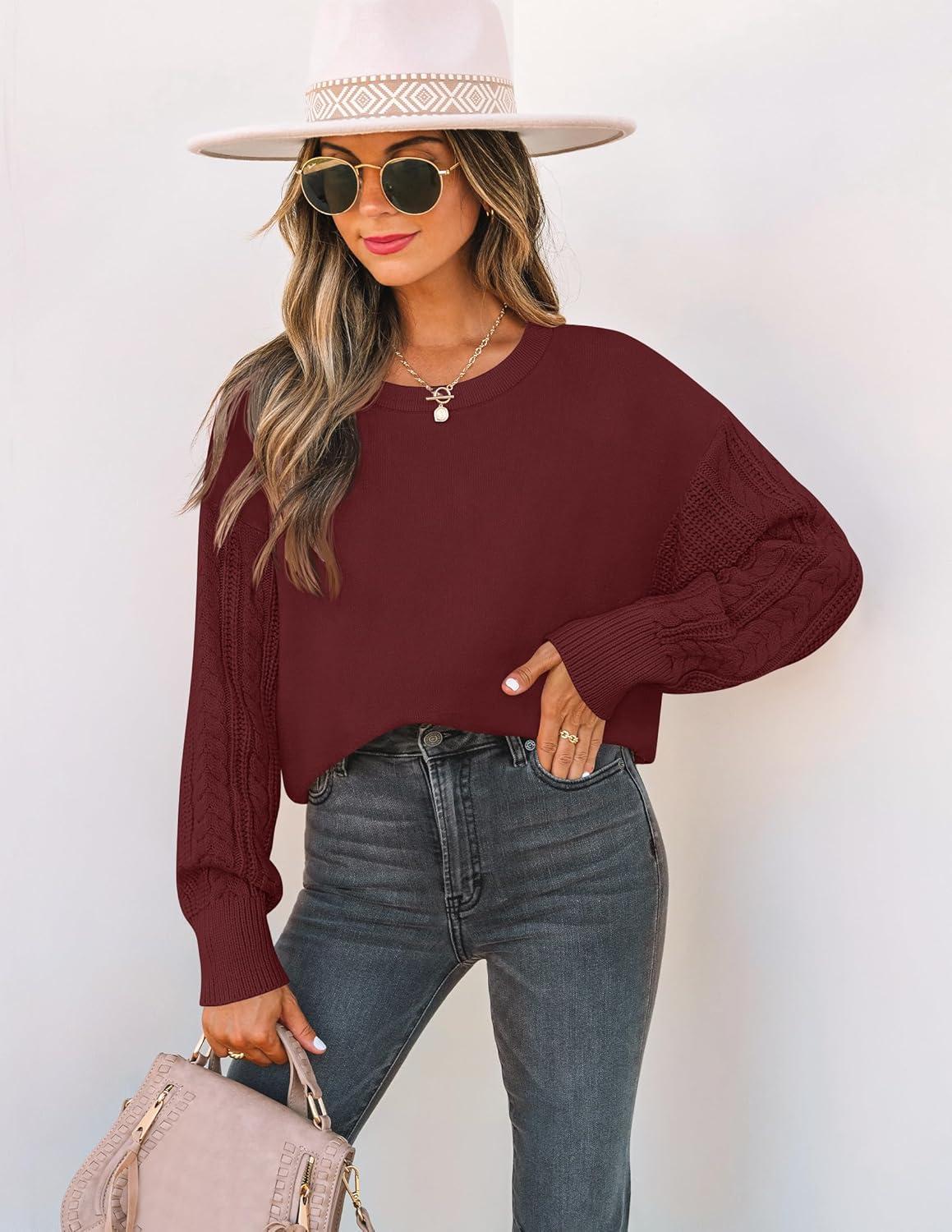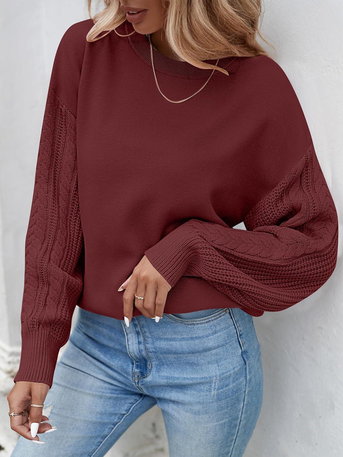 ZESICA Women’s 2025 Fall Long Sleeve Crew Neck Solid Color Cable Knit Chunky Casual Oversized Pullover Sweater Tops(Wine)