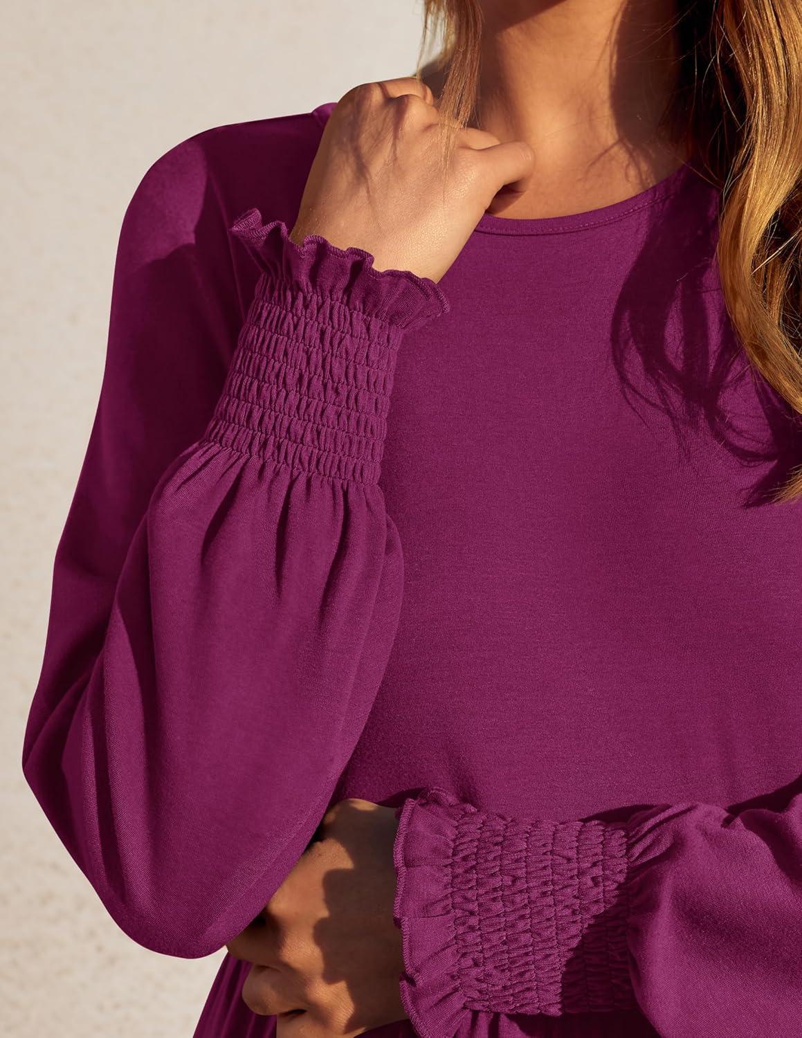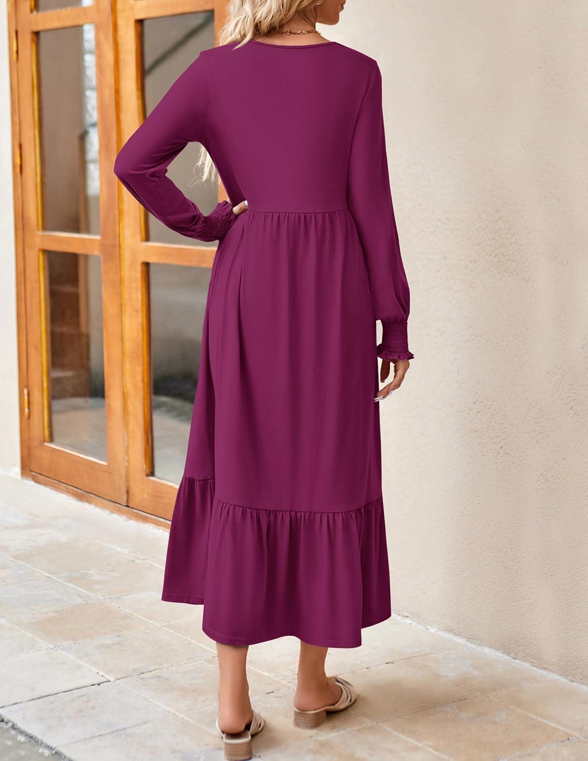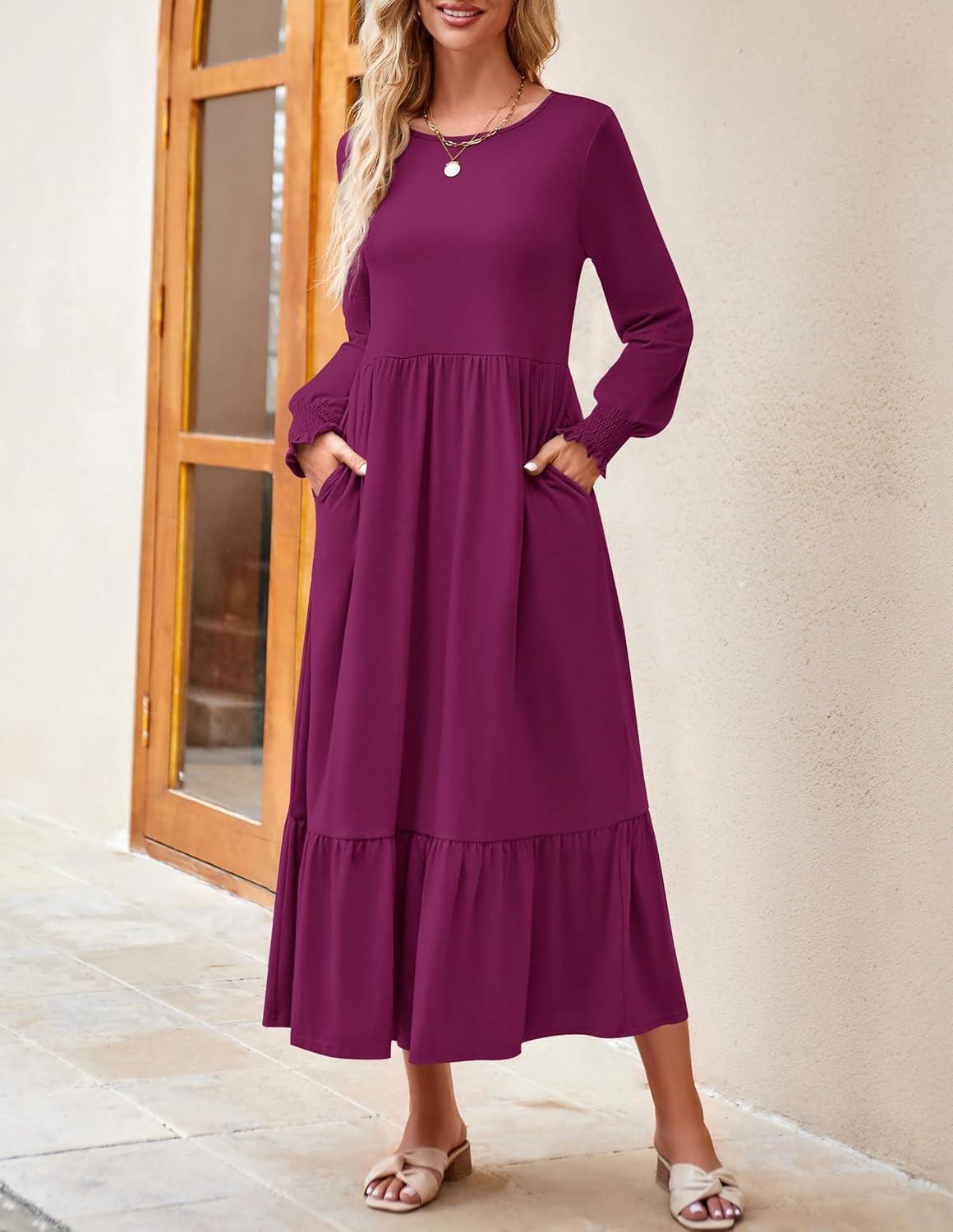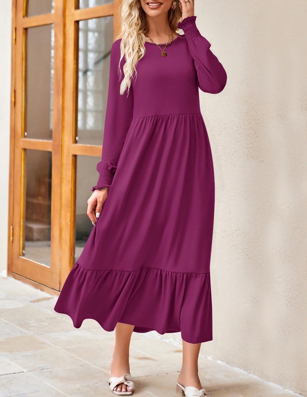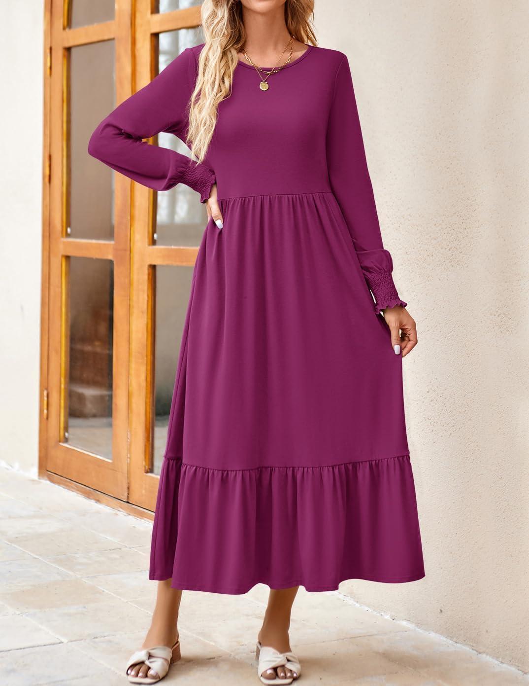 ZESICA Women’s 2025 Fall Long Sleeve Dress Crewneck Casual Loose Pleated Tiered Swing Midi Dresses with Pockets(Plum)