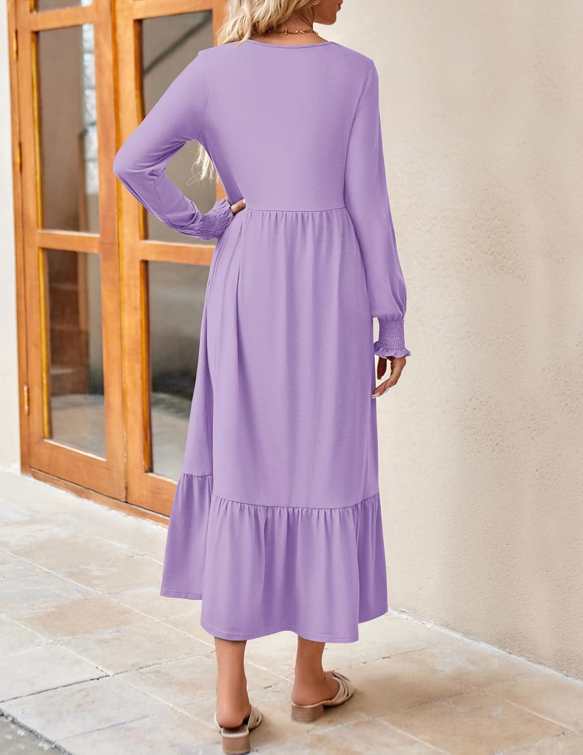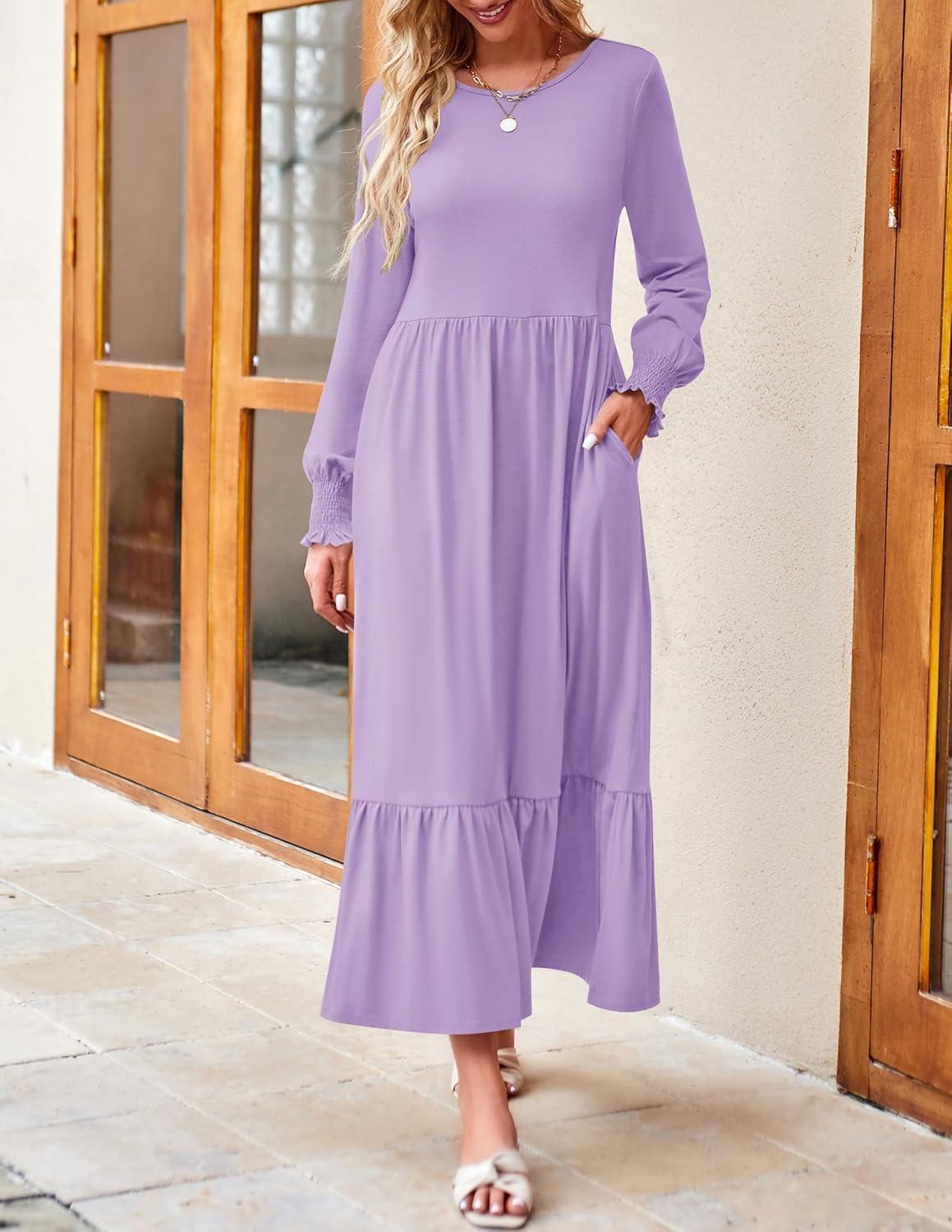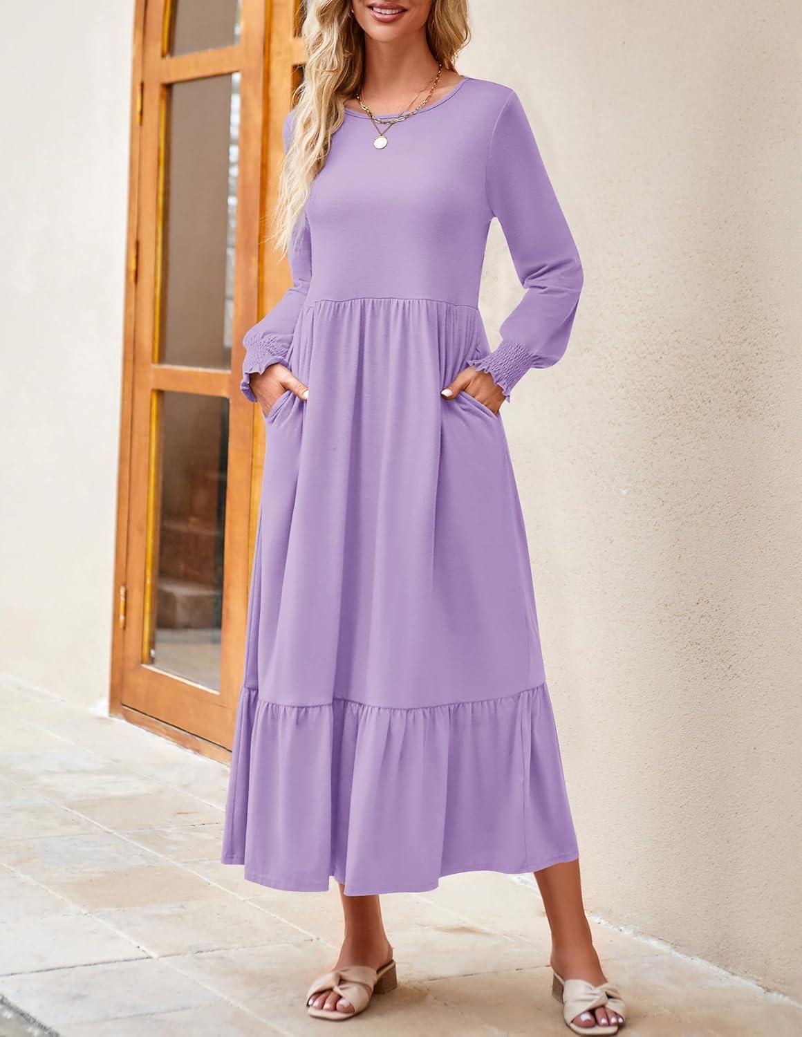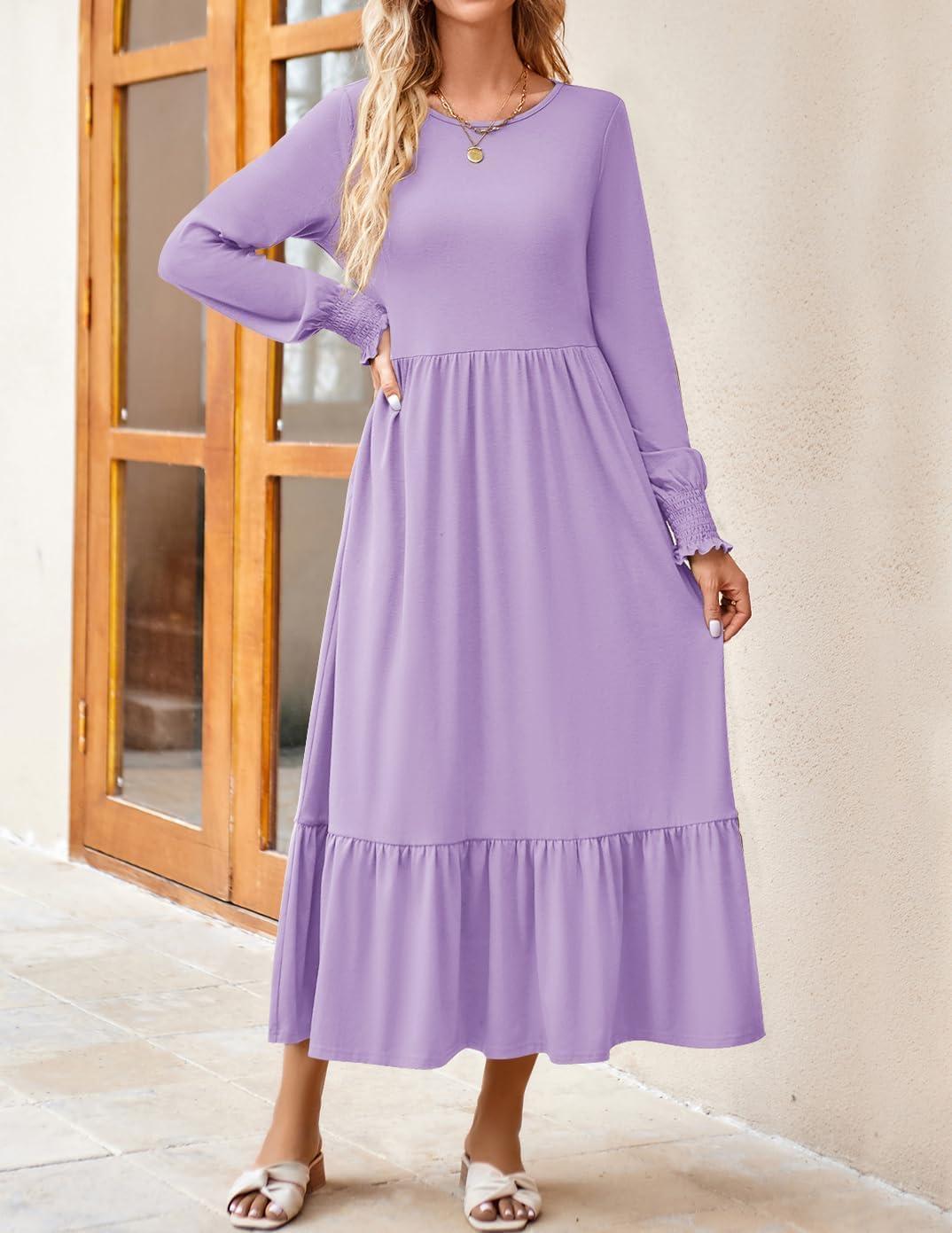 ZESICA Women’s 2025 Fall Long Sleeve Dress Crewneck Casual Loose Pleated Tiered Swing Midi Dresses with Pockets(Purple)
