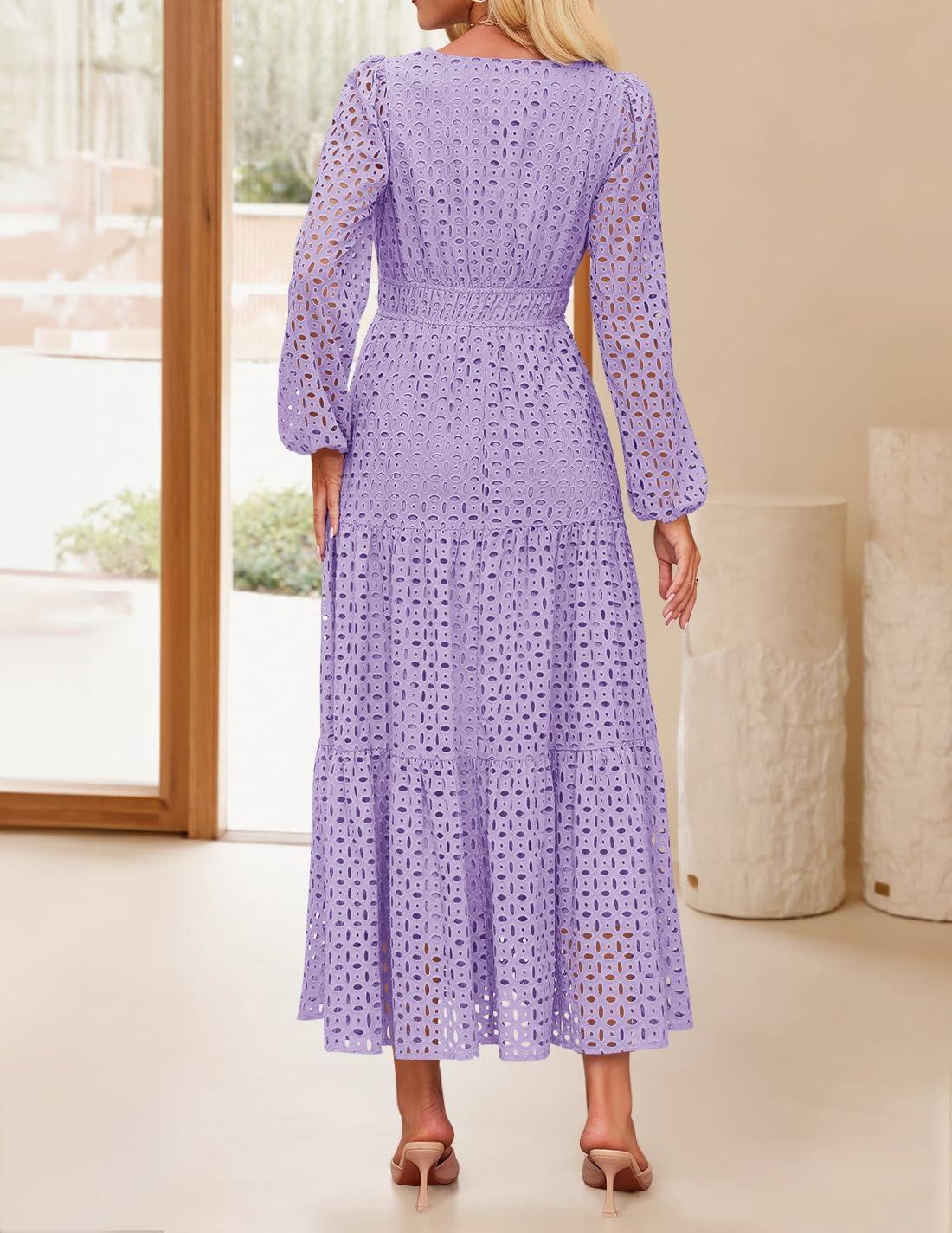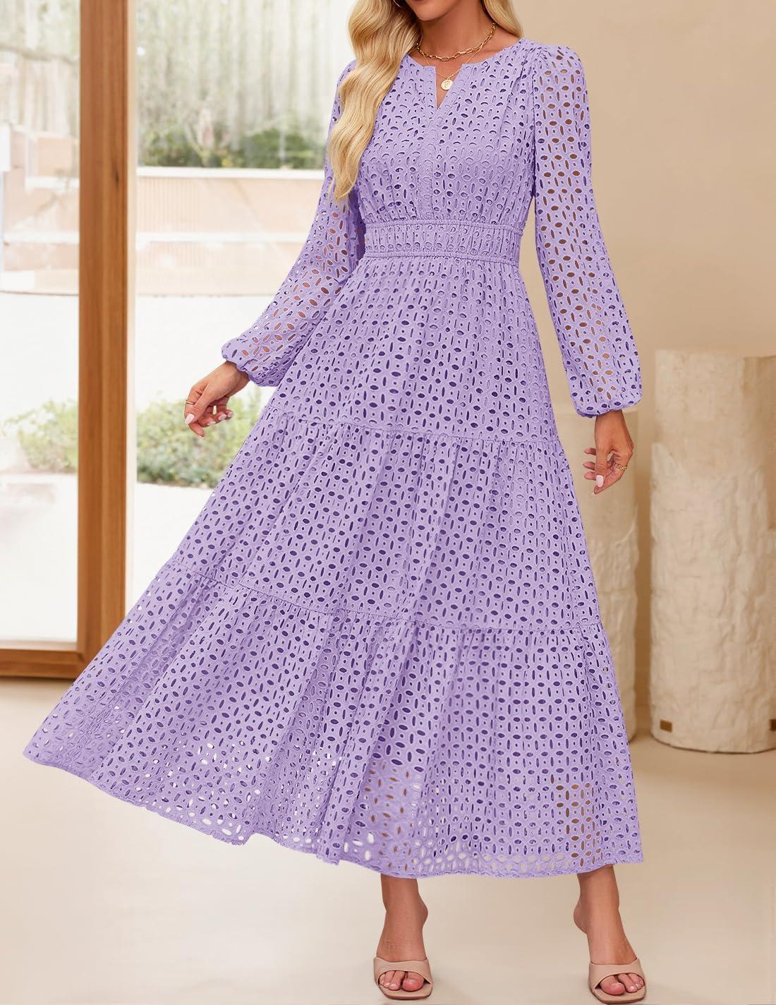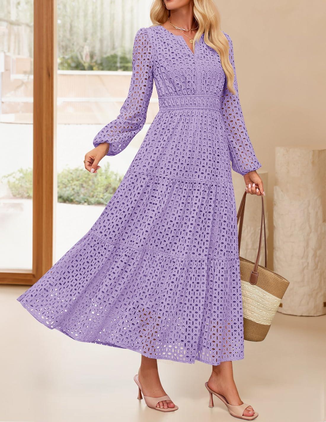 ZESICA Women's 2025 Fall Long Sleeve Maxi Dress V Neck Hollow Out Eyelet A Line Long Flowy Casual Party Dresses(Lightpurple)