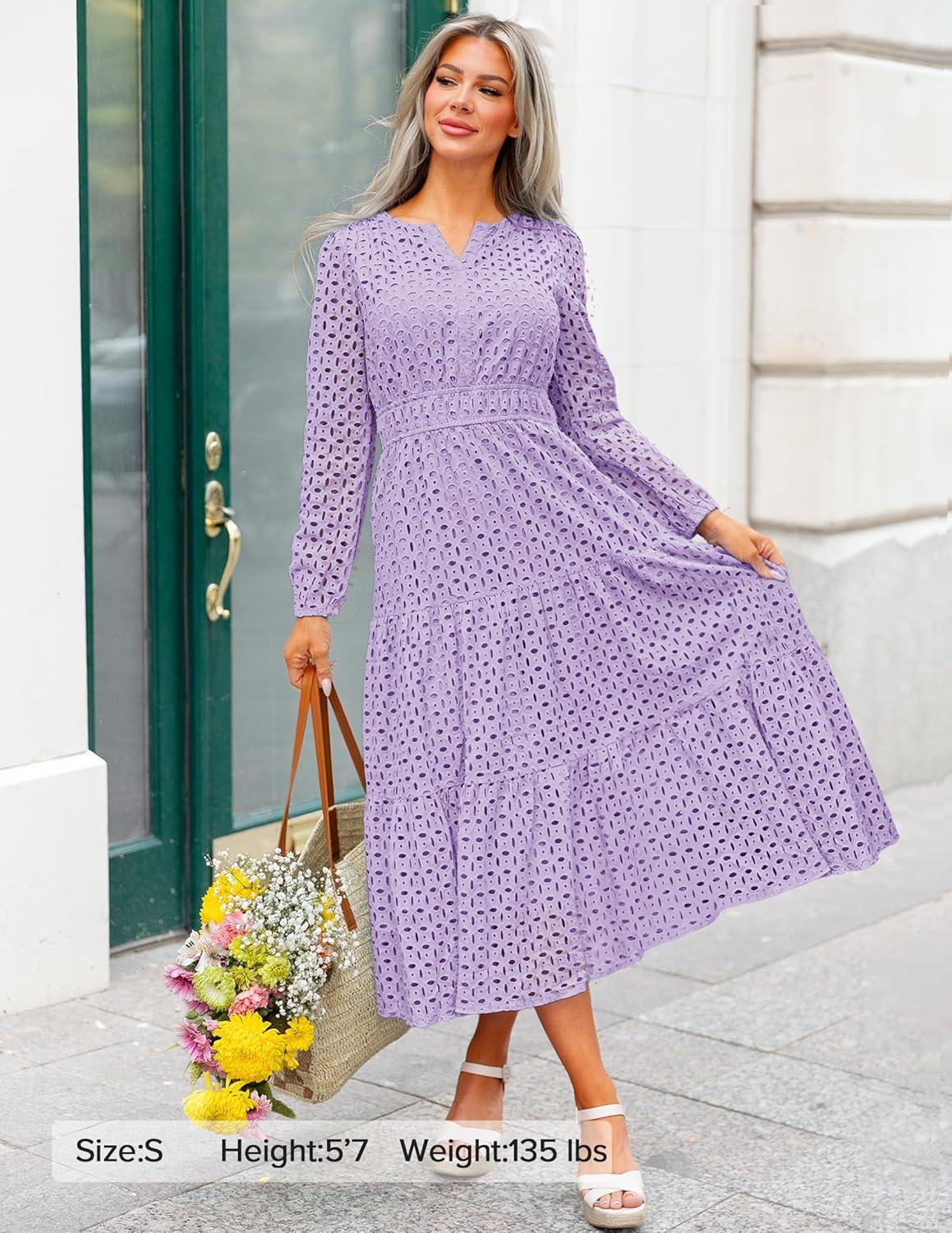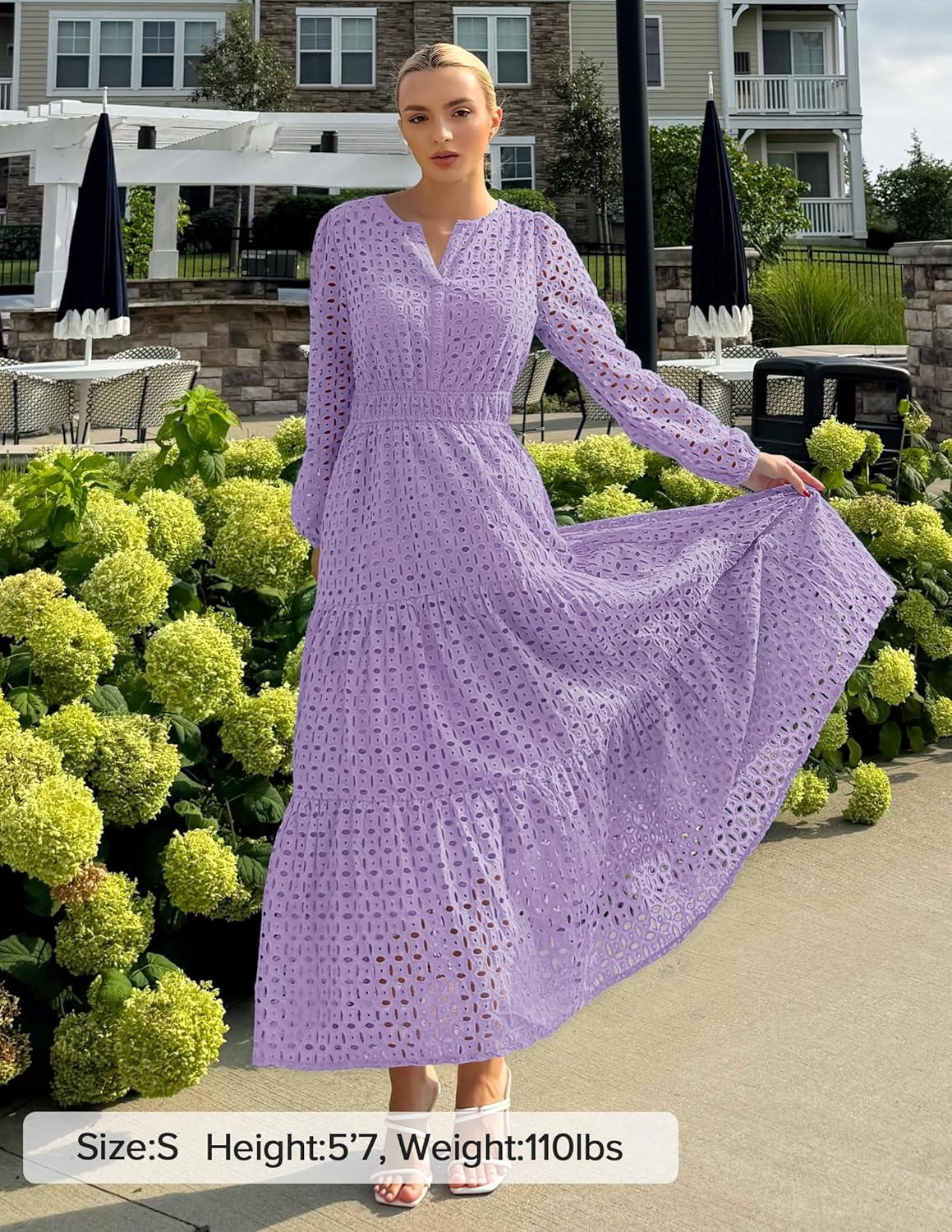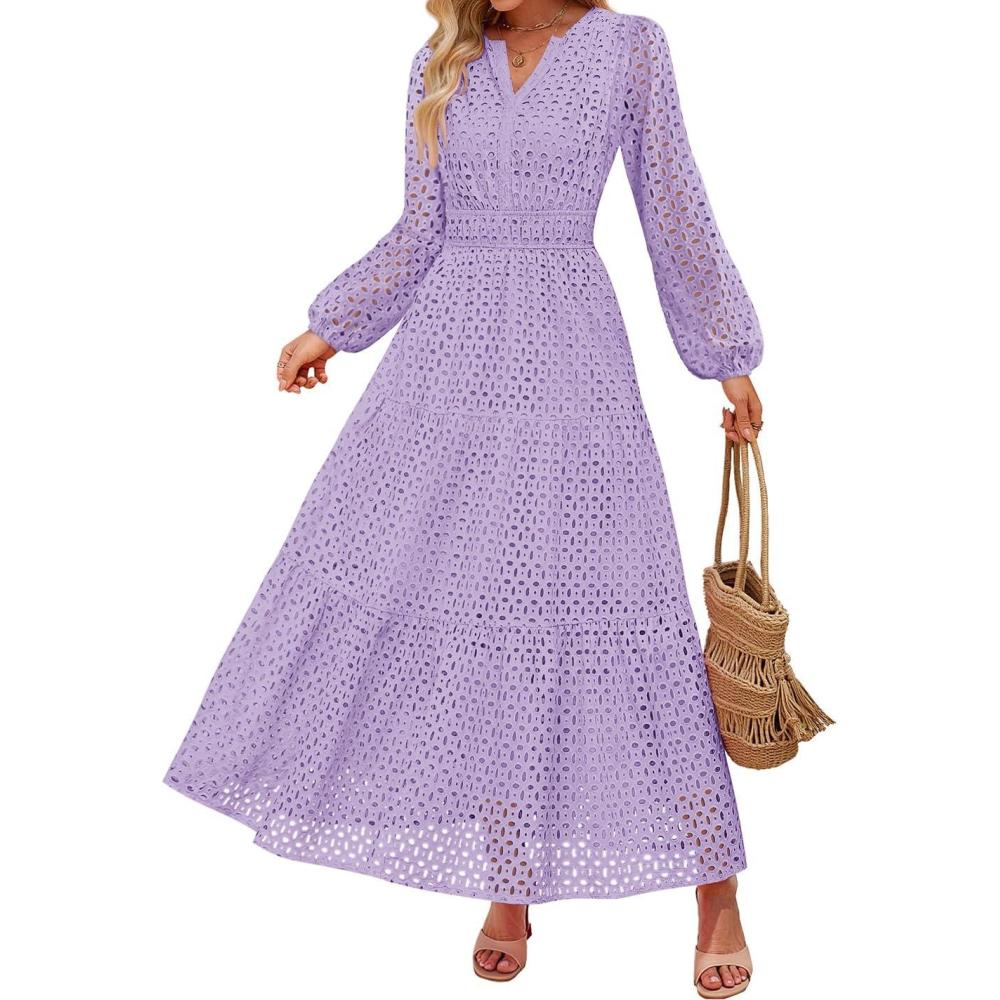 ZESICA Women's 2025 Fall Long Sleeve Maxi Dress V Neck Hollow Out Eyelet A Line Long Flowy Casual Party Dresses(Lightpurple)