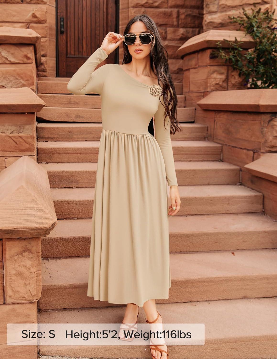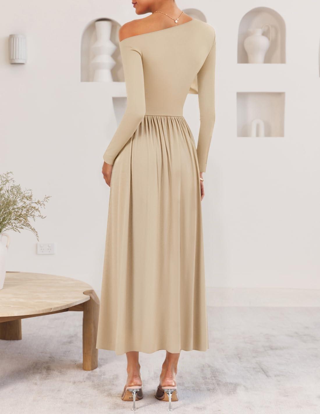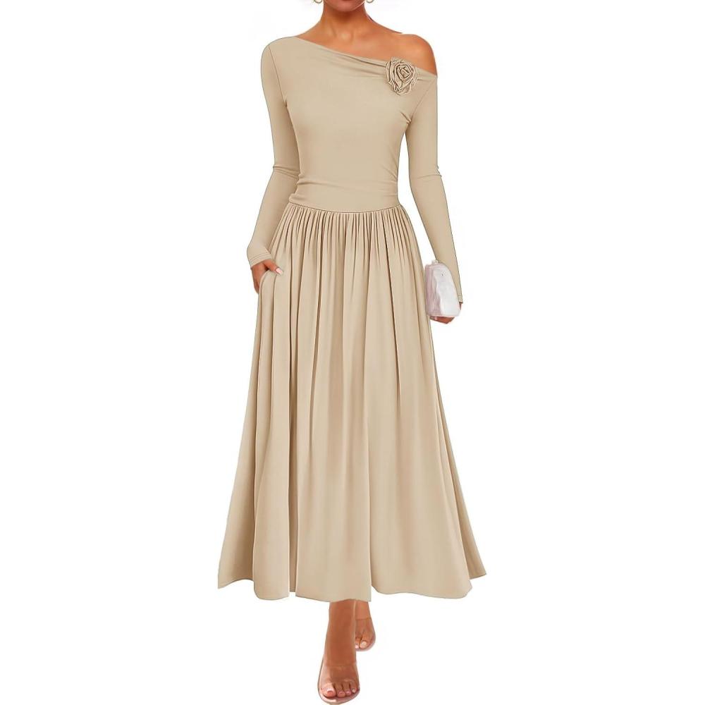 ZESICA Women’s 2025 Fall Long Sleeve Off Shoulder Maxi Dress Pleated Elegant Formal Wedding Guest Dresses with Pockets(Apricot)