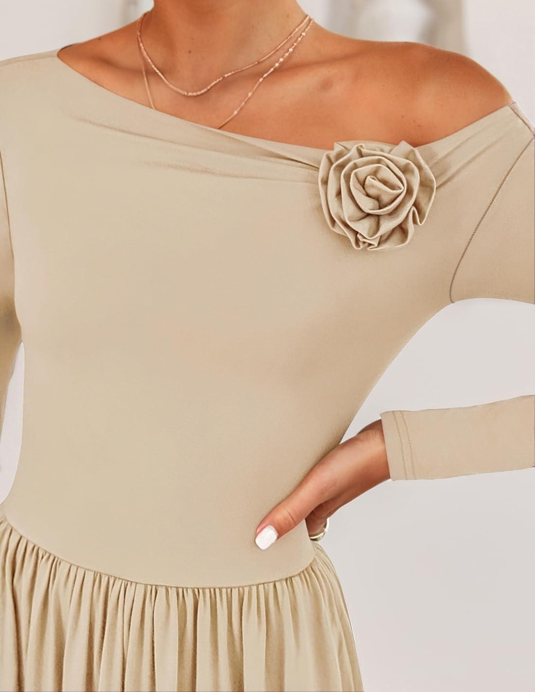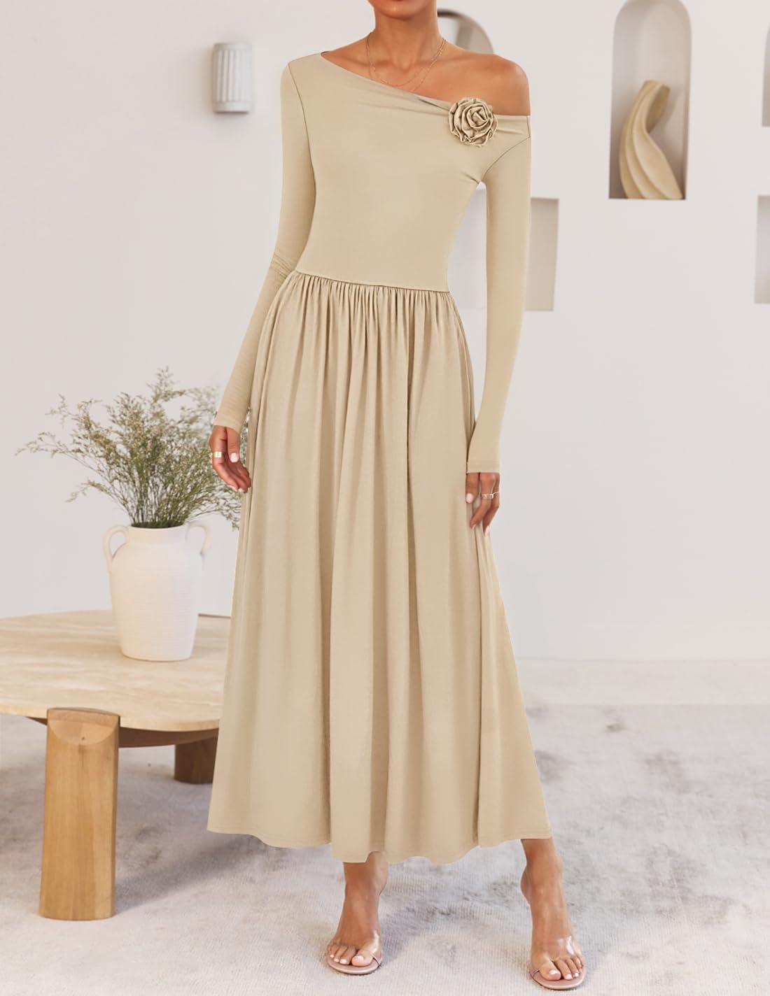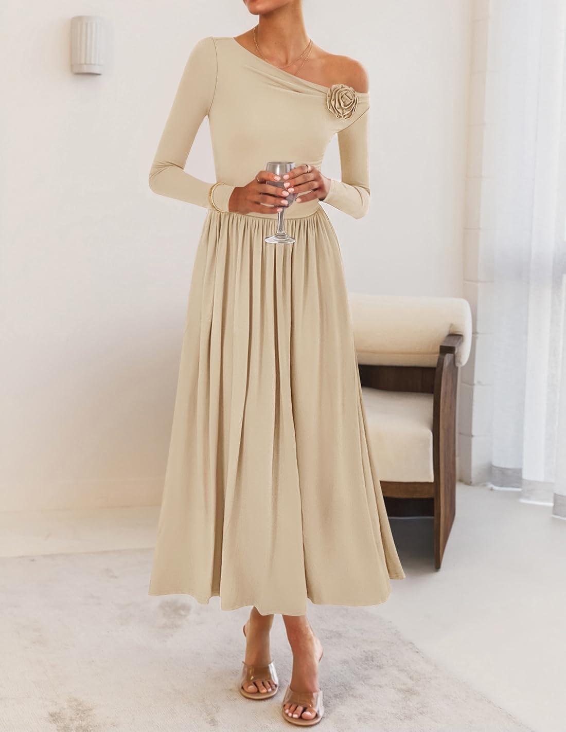 ZESICA Women's 2025 Fall Long Sleeve Off Shoulder Maxi Dress Pleated Elegant Formal Wedding Guest Dresses with Pockets(Apricot)