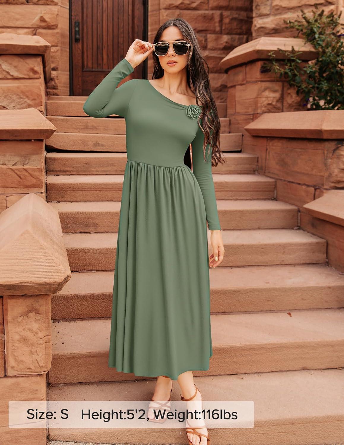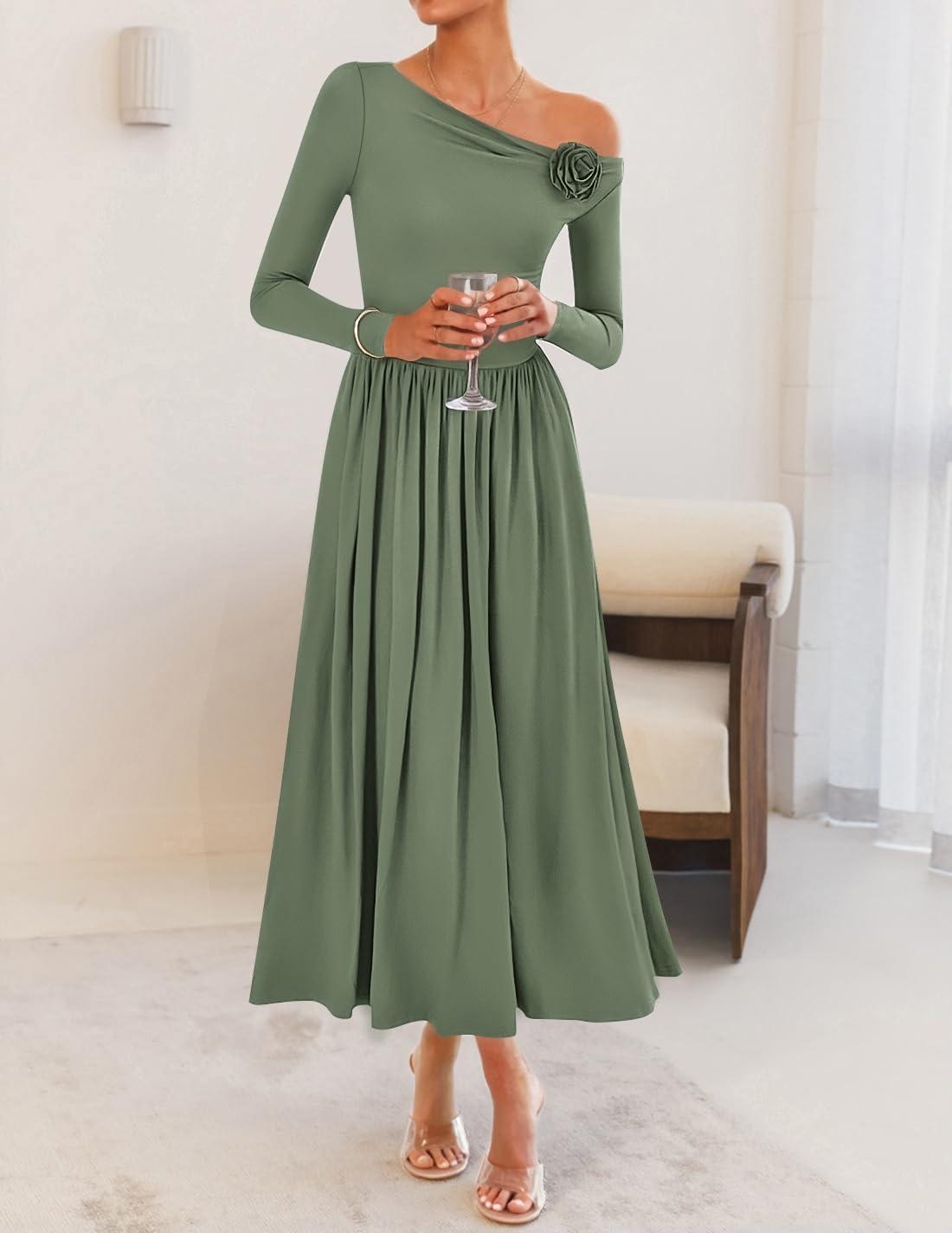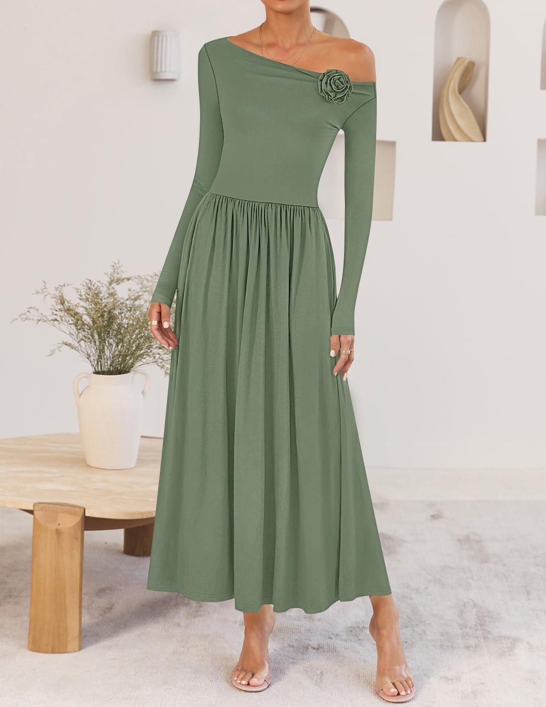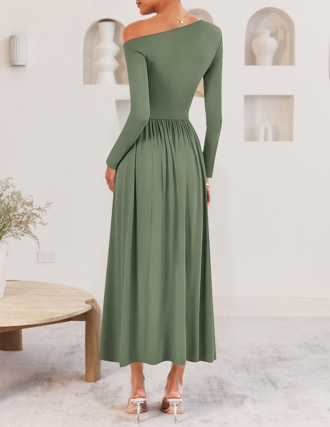 ZESICA Women’s 2025 Fall Long Sleeve Off Shoulder Maxi Dress Pleated Elegant Formal Wedding Guest Dresses with Pockets(Beangreen)